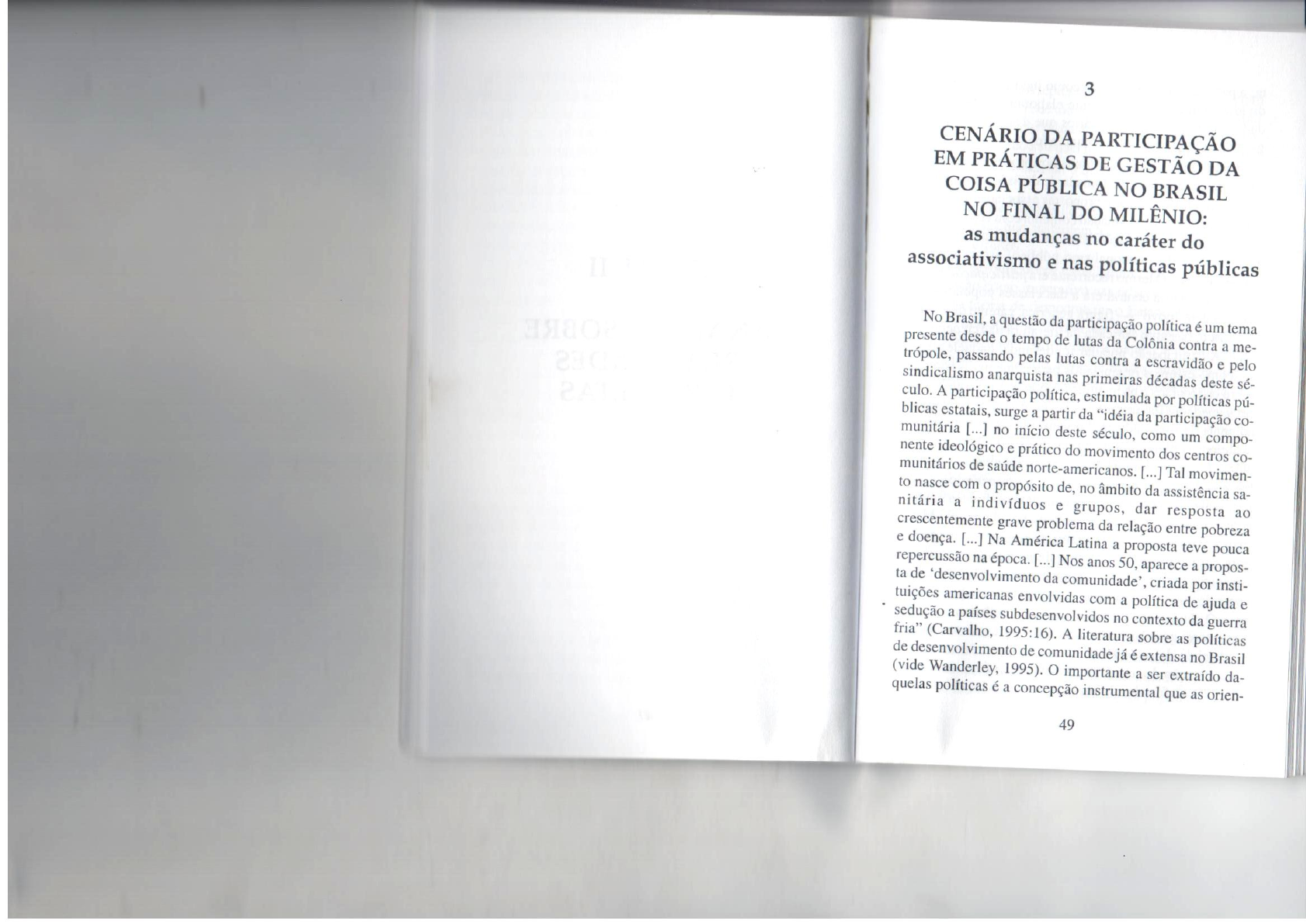 3 CENÁRIO DA PARTICIPAÇÃO EM PRÁTICAS DE GESTÃO DA COISA PÚBLICA NO BRASIL NO FINAL DO MILÊNIO: as mudanças no caráter do associativismo e nas políticas públicas No Brasil, a questão da participação política é um tema presente desde o tempo de lutas da Colônia contra a me- trópole, passando pelas lutas contra a escravidão e pelo sindicalismo anarquista nas primeiras décadas deste sé- culo. A participação política, estimulada por políticas pú- blicas estatais, surge a partir da "idéia da participação co- munitária [...] no início deste século, como um compo- nente ideológico e prático do movimento dos centros co- munitários de saúde norte-americanos. [...] Tal movimen- to nasce com o propósito de, no âmbito da assistência sa- nitária a indivíduos e grupos, dar resposta ao crescentemente grave problema da relação entre pobreza e doença. [...] Na América Latina a proposta teve pouca repercussão na época. [...] Nos anos 50, aparece a propos- ta de 'desenvolvimento da comunidade', criada por insti- tuições americanas envolvidas com a política de ajuda e sedução a países subdesenvolvidos no contexto da guerra fria" (Carvalho, 1995:16). A literatura sobre as políticas de desenvolvimento de comunidade já é extensa no Brasil (vide Wanderley, 1995). o importante a ser extraído da- quelas políticas é a concepção instrumental que as orien- 49participação era pensada como incorporação dos in- ações previamente elaboradas pelas autori- livres, com legítimos representantes da sociedade civil, eram dades ou grupos de missionários que desenvolviam pro- os objetivos centrais de todas as ações. A temática da parti- gramas assistenciais nas comunidades. cipação era vista associada à organização política dos tra- balhadores, devendo atender a dois princípios importantes: A participação dos indivíduos nos processos de elabo- ração de estratégias e de tomada de decisão só irá apare- 1. esclarecer e ordenar o que reivindicar e que direitos conquistar; cer na década de 1980, em propostas associadas aos movi- mentos populares, em atuação conjunta com comunidades 2. estabelecer formas de arregimentação de forças po- eclesiais de base, oposições sindicais, algumas categorias líticas próprias que sustentem as reivindicações e a con- profissionais do funcionalismo público, associações de quista dos direitos. moradores etc. termo recorrente era participação popu- Vários pesquisadores trabalharam com a categoria da e a categoria central era a das classes populares que participação como imperativo nas relações sociais vigen- remetia à de "povo" figura genérica, carente de estatu- tes, como forma de democratizar o Estado e seus apare- to teórico, bastante criticada na literatura das ciências so- Participação se tornou um dos principais termos A participação popular foi definida, naquele perío- articuladores no repertório das demandas e movimentos. do, como esforços organizados para aumentar o controle Demo (1988) assinalou, naquela época, que a participa- sobre os recursos e as instituições que controlavam a vida ção envolve mais do que a demanda: envolve a criação de em sociedade. Esses esforços deveriam partir fundamen- canais; disso resultou a discussão sobre como e quais seri- talmente da sociedade civil organizada em movimentos e am esses canais. Já se começava a delinear uma discussão associações comunitárias. povo, os excluídos dos a respeito dos conselhos: que canais, com que qualidade e culos do poder dominante, eram os agentes e os atores como participar. debate denotava a passagem de uma básicos da participação popular. Foi um período de luta fase da participação como simples pressão pela demanda nacional pelo acesso e reconhecimento dos direitos sociais, de um bem para outra fase, em que havia certa qualifica- econômicos e políticos dos setores populares. No plano ção da participação. mais geral, buscava-se o direito de eleger representantes Em termos da teoria política, o referencial fundava-se para cargos públicos, o direito de se manifestar e de se em concepções estratégicas, objetivando a tomada dos organizar livremente. Tratava-se de mudar as regras do aparelhos do Estado e sua democratização. A mobilização controle social e de alterar a forma de fazer política no da sociedade civil era parte de um plano de criação e de- O clamor à participação era geral e não se restringia senvolvimento de uma cultura de contra hegemonia à or- aos setores populares. As demandas marcaram um perío- dem dominante. Guerra de posição e guerra de movimen- do de ciclo de protestos e mobilizações em busca da de- to eram duas categorias chaves que formavam e informa- mocratização da sociedade brasileira, ao final da década vam sentido e a direção que muitas lideranças impri- de fim do regime militar e a volta de eleições miam aos movimentos e às organizações populares. 50 51Contrastando com os fundamentos teóricos que alimen- tes, na época, em grande escala, ao PMDB (Partido do tavam projeto de redemocratização, advindo em boa parte Movimento Democrático Brasileiro). Com o exercício das de concepções da esquerda, o conceito de participação novas práticas, também vieram as dificuldades, os limites continha, na prática, bases liberais, pois era vista como e as novas exigências dadas pela nova conjuntura econô- sinônimo de pressão popular encaminhada diretamente aos mica, social e política. Várias dessas dificuldades decor- órgãos públicos, particularmente às prefeituras. poder riam de problemas enraizados na própria cultura política de decisão, de responder ou não àquelas demandas, era do nacional, em que predominam valores como o clientelismo; mandatário local. Participar era interpretado de uma for- o paternalismo; o método de resolução de negócios públi- ma um tanto mecanicista, pois se restringia a uma aspira- cos