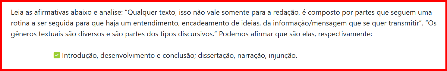 Leia as afirmativas abaixo e analise: "Qualquer texto, isso não vale somente para a redação, é composto por partes que seguem uma rotina a ser seguida para que haja um entendimento, encadeamento de ideias, da informação/mensagem que se quer transmitir". "Os gêneros textuais são diversos e são partes dos tipos discursivos." Podemos afirmar que são elas, respectivamente: Introdução, desenvolvimento e conclusão; dissertação, narração, injunção.