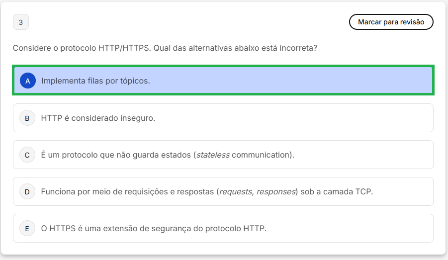 3 Marcar para revisão Considere protocolo HTTP/HTTPS. Qual das alternativas abaixo está incorreta? A Implementa filas por tópicos. B HTTP é considerado inseguro. C É um protocolo que não guarda estados (stateless communication). D Funciona por meio de requisições e respostas (requests, responses) sob a camada TCP. E o HTTPS é uma extensão de segurança do protocolo HTTP.