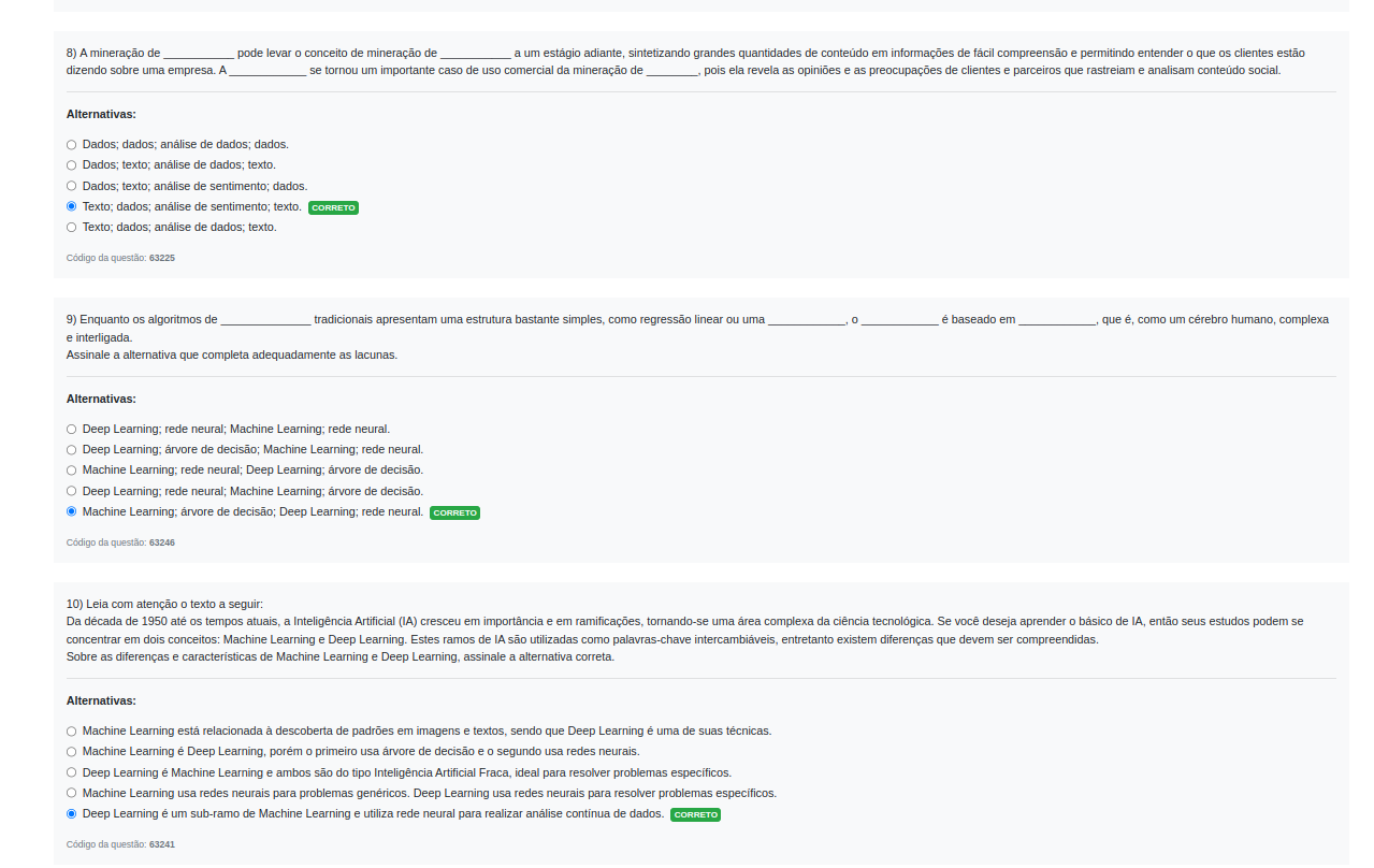 8) A mineração de pode levar conceito de mineração de a um estágio adiante, sintetizando grandes quantidades de conteúdo em informações de fácil compreensão e permitindo entender que os clientes estão dizendo sobre uma empresa. A se tornou um importante caso de uso comercial da mineração de pois ela revela as opiniões e as preocupações de clientes e parceiros que rastreiam e analisam conteúdo Alternativas: dados; análise de dados; análise de dados; texto. análise de sentimento; dados. Texto: dados; de sentimento; texto. CORRETO dados; de Código da questão: 63225 9) Enquanto os algoritmos de tradicionais apresentam uma estrutura bastante simples, como regressão linear ou uma o é baseado em que como um cérebro complexa e interligada. Assinale a alternativa que completa adequadamente as Alternativas: Deep Learning: rede neural; Machine Learning: rede Deep de Machine rede Machine Learning: rede neural; Deep Learning: de Deep rede neural; Machine de decisão. Machine Learning: de decisão; Deep rede neural. CORRE TO Código da questão: 63246 10) Leia com atenção texto a seguir: Da década de 1950 até os tempos atuais, a Inteligência Artificial (IA) cresceu em importância e em ramificações, tornando-se uma área complexa da ciência Se você deseja aprender básico de IA, então seus estudos podem se concentrar em dois conceitos: Machine Learning e Deep Estes ramos de IA são utilizadas como palavras-chave intercambiáveis, entretanto existem diferenças que devem ser Sobre as diferenças e características de Machine Learning e Deep assinale a alternativa correta. Alternativas: Machine Learning está relacionada à descoberta de padrões em imagens e sendo que Deep Learning é uma de suas Machine Learning é Deep porém primeiro usa arvore de decisão e segundo usa redes Deep Learning é Machine Learning e ambos são do tipo Inteligência Artificial Fraca, ideal para resolver problemas específicos. Machine Learning usa redes neurais para problemas genéricos. Deep Learning usa redes neurais para resolver problemas Deep Learning é um sub-ramo de Machine Learning e utiliza rede neural para realizar continua de CORRET Código da questão: 63241