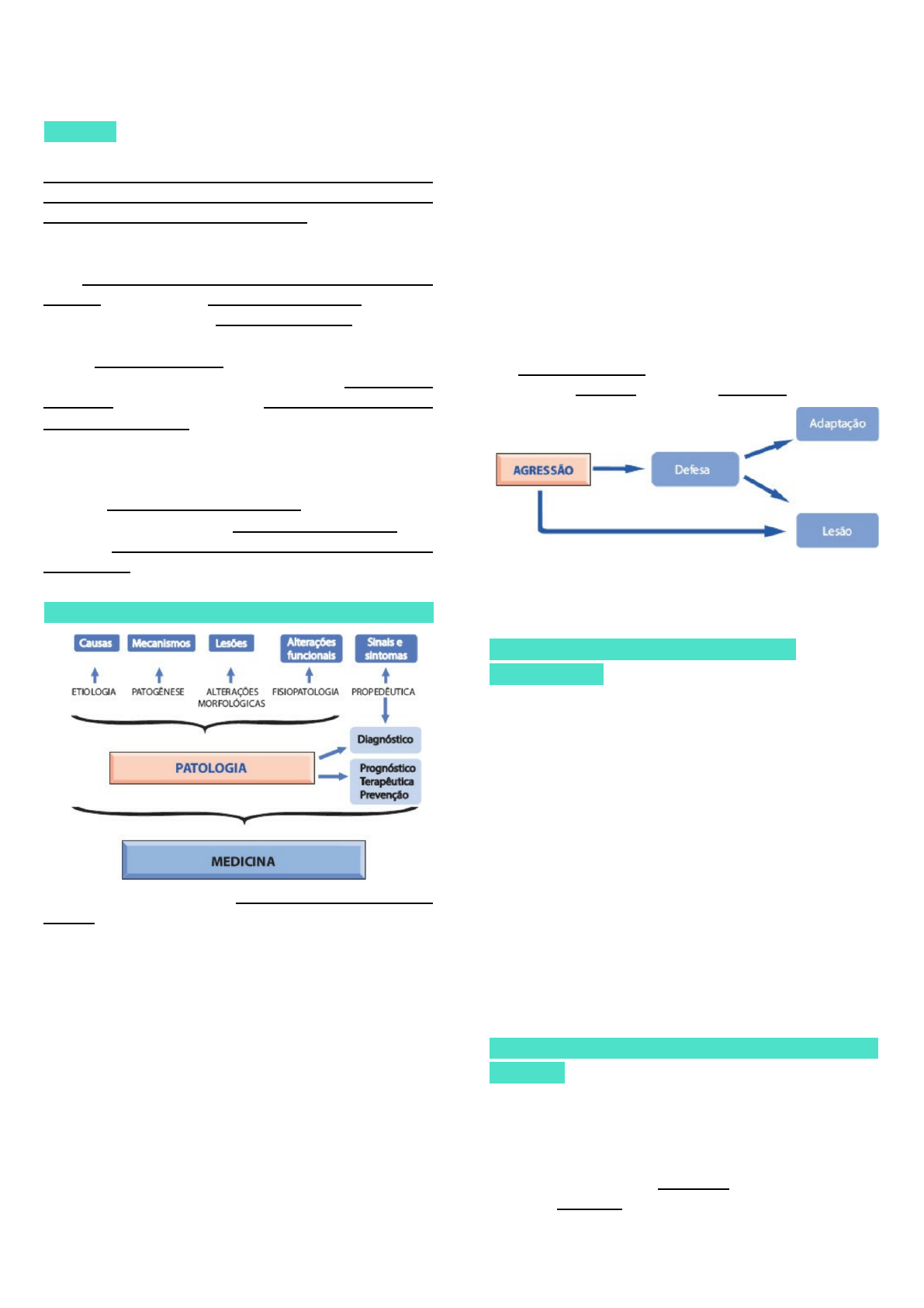 MAYANA SEGATTO – FANUT – UFG RESUMO PROVA I – PATOLOGIA GERAL conceitos Patologia pode ser entendida como a ciência que estuda as causas das doenças, os mecanismos que as produzem, os locais onde ocorrem e as alterações moleculares, morfológicas e funcionais que apresentam Adaptação: propriedade geral dos seres vivos representada pela capacidade de ser sensível às variações do meio ambiente (irritabilidade) e de produzir respostas (variações bioquímicas e fisiológicas) capazes de adaptá-los Saúde: estado de adaptação do organismo ao ambiente físico, psíquico ou social em que vive, de modo que o indivíduo se sente bem (saúde subjetiva) e não apresenta sinais ou alterações orgânicas (saúde objetiva) (diferente de normalidade, que é um conceito de padrão, estatisticamente calculado) Doença: estado de falta de adaptação ao ambiente físico, psíquico ou social, no qual o indivíduo se sente mal (tem sintomas) e/ou apresenta alterações orgânicas evidenciáveis objetivamente (sinais clínicos) Elementos de uma doença – divisões da patologia Patologia Geral: estuda os aspectos comuns às diferentes doenças no que se referem às suas causas, mecanismos patogenéticos, lesões estruturais e alterações da função “Qualquer estímulo da natureza – dependendo da sua intensidade, do tempo de atuação e da capacidade de reação do organismo (que envolve também o patrimônio genético) – pode constituir uma agressão” Agressões: origem no ambiente externo ou a partir do próprio organismo (adaptações da imunidade à patógenos, por exemplo). Podem ser provocadas por agentes físicos, químicos e biológicos, além de por alterações na expressão gênica ou por modificações nutricionais ou dos próprios mecanismos defensivos do organismo Lesão/processo patológico: conjunto de alterações morfológicas, moleculares e/ou funcionais que surgem nas células e tecidos após agressões - alterações morfológicas que caracterizam as lesões podem ser observadas a olho nu (alterações macroscópicas) ou ao microscópio de luz ou eletrônico (alterações microscópicas e submicroscópicas) - alterações moleculares, que muitas vezes se traduzem rapidamente em modificações morfológicas, podem ser detectadas por métodos bioquímicos e de biologia molecular - distúrbios funcionais manifestam-se por alterações da função de células, tecidos, órgãos ou sistemas e representam os fenômenos fisiopatológicos “O aspecto morfológico de uma lesão varia de acordo com o momento em que ela é examinada” “Toda agressão gera estímulos que induzem, nos tecidos, respostas adaptativas que visam torná-los mais resistentes às agressões subsequentes” Classificação das lesões e das doenças | Nomenclatura Lesões celulares: - letais (a necrose, morte celular seguida de autólise; apoptose, morte celular não seguida de autólise) - não letais (degenerações, hipotrofias, hipertrofias, hiperplasias, hipoplasias, metaplasias, displasias e neoplasias, pigmentações) A letalidade ou não letalidade está ligada à qualidade, à intensidade e à duração da agressão, bem como ao estado funcional ou ao tipo de célula atingida. Inflamação: lesão mais complexa que envolve todos os componentes teciduais; se caracteriza por modificações locais da microcirculação e pela saída de leucócitos do leito vascular, acompanhadas por lesões celulares e do interstício provocadas, principalmente, por ação de células fagocitárias e por alterações vasculares que acompanham o processo. Distúrbios da Proliferação e da Diferenciação Celulares Alterações do volume celular: hipertrofia e hipotrofia Alterações da proliferação celular: ↑ taxa de divisão celular + diferenciação normal – hiperplasia; ↓ taxa de proliferação celular – hipoplasia (anemia aplásica – trata-se de anemia hipoplásica) MAYANA SEGATTO – FANUT – UFG Alterações da diferenciação celular: células de um tecido modificam seu estado de diferenciação normal – metaplasia; Alterações da proliferação e da diferenciação celulares: proliferação celular e redução ou perda de diferenciação – displasia; proliferação celular autônoma, em geral acompanhada de perda ou redução da diferenciação – neoplasia. Hipotrofia Redução quantitativa dos componentes estruturais e das funções celulares → diminuição do volume das células e dos órgãos atingidos. – Aumento da degradação de proteínas celulares (em lisossomos e pelo sistema ubiquitina-proteassomos): principal mecanismo de hipotrofia. – Agressão a proteínas por radicais livres é causa frequente de hipotrofia, já que proteínas modificadas são ubiquitinadas e dirigidas aos proteassomos, onde são degradadas. – Hipotrofia: fisiológica ou patológica. A primeira ocorre na senilidade (↓ atividades metabólicas). A hipotrofia patológica resulta de: – (1) inanição. Deficiência nutricional resulta em hipotrofia generalizada; – (2) desuso. (exemplo clássico é o de músculos esqueléticos imobilizados); – (3) compressão. Resulta da pressão exercida por uma lesão expansiva, como tumores, cistos, aneurismas etc.; – (4) obstrução vascular. Diminuição do fornecimento de O2 e nutrientes causa hipotrofia: obstrução das artérias renais, por exemplo, leva a hipotrofia do rim; – (5) substâncias tóxicas que bloqueiam sistemas enzimáticos e a produção de energia pelas células, como acontece nos músculos do antebraço na intoxicação pelo chumbo; – (6) hormônios. ↓ hormônios resulta em hipotrofia de células e órgãos-alvo. Deficiência dos hormônios somatotrófico ou tireoidianos causa hipotrofia generalizada; carência de hormônios com alvos específicos leva a hipotrofia localizada (como de gônadas na deficiência de gonadotrofinas); – (7) inervação. Perda de estimulação nervosa resulta em hipotrofia muscular (hipotr