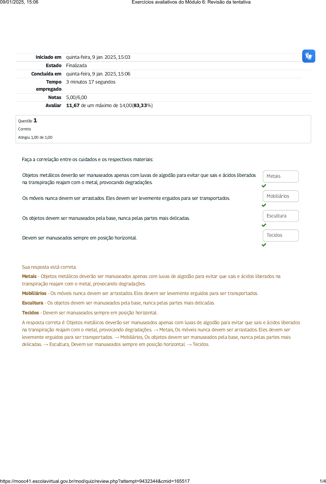 Iniciado em quinta-feira, 9 jan. 2025, 15:03 Estado Finalizada Concluída em quinta-feira, 9 jan. 2025, 15:06 Tempo empregado 3 minutos 17 segundos Notas 5,00/6,00 Avaliar 11,67 de um máximo de 14,00(83,33%) Questão 1 Correto Atingiu 1,00 de 1,00 Faça a correlação entre os cuidados e os respectivos materiais: Objetos metálicos deverão ser manuseados apenas com luvas de algodão para evitar que sais e ácidos liberados na transpiração reajam com o metal, provocando degradações. Os móveis nunca devem ser arrastados. Eles devem ser levemente erguidos para ser transportados. Os objetos devem ser manuseados pela base, nunca pelas partes mais delicadas. Devem ser manuseados sempre em posição horizontal. Metais Mobiliários Escultura Tecidos Sua resposta está correta. Metais - Objetos metálicos deverão ser manuseados apenas com luvas de algodão para evitar que sais e ácidos liberados na transpiração reajam com o metal, provocando degradações. Mobiliários - Os móveis nunca devem ser arrastados. Eles devem ser levemente erguidos para ser transportados. Escultura - Os objetos devem ser manuseados pela base, nunca pelas partes mais delicadas. Tecidos - Devem ser manuseados sempre em posição horizontal. A resposta correta é: Objetos metálicos deverão ser manuseados apenas com luvas de algodão para evitar que sais e ácidos liberados na transpiração reajam com o metal, provocando degradações. → Metais, Os móveis nunca devem ser arrastados. Eles devem ser levemente erguidos para ser transportados. → Mobiliários, Os objetos devem ser manuseados pela base, nunca pelas partes mais delicadas. → Escultura, Devem ser manuseados sempre em posição horizontal. → Tecidos. 09/01/2025, 15:06 Exercícios avaliativos do Módulo 6: Revisão da tentativa https://mooc41.escolavirtual.gov.br/mod/quiz/review.php?attempt=9432344&cmid=165517 1/4 Questão 2 Correto Atingiu 1,00 de 1,00 Questão 3 Incorreto Atingiu 0,00 de 1,00 Sobre o manuseio de obras, é incorreto a�rmar: Escolha uma opção: a. Manusear os objetos sempre por lotes. b. As normas de manuseio deverão ser de conhecimento geral e devem estar acessíveis a toda a equipe. c. Fazer uso de EPIs adequados ao suporte dos objetos e ao procedimento a ser realizado. d. As obras/objetos deverão ser manuseadas o mínimo possível e com a menor frequência. Sua resposta está correta. A resposta correta é: Manusear os objetos sempre por lotes. Caso seja necessário transportar objetos de grandes dimensões de um espaço a outro do museu, deve-se evitar: Escolha uma opção: a. Usar carrinhos de carga com rodinhas de borracha ou silicone. b. O transporte deverá ser feito por uma única pessoa. c. Ter atenção ao trajeto a ser percorrido. d. Acondicionar o objeto em embalagem segura, mesmo que provisória. Sua resposta está incorreta. Não é recomendável que o transporte de objetos de grandes dimensões seja feito por uma pessoa apenas. O procedimento deverá ser realizado com o uso de equipamentos adequados, evitando colocar o objeto em risco. A resposta correta é: O transporte deverá ser feito por uma única pessoa. 09/01/2025, 15:06 Exercícios avaliativos do Módulo 6: Revisão da tentativa https://mooc41.escolavirtual.gov.br/mod/quiz/review.php?attempt=9432344&cmid=165517 2/4 Questão 4 Correto Atingiu 1,00 de 1,00 Questão 5 Correto Atingiu 1,00 de 1,00 Questão 6 Correto Atingiu 1,00 de 1,00 De acordo com o texto, obras raras ou com suporte fragilizado deverão: Escolha uma opção: a. Ser empilhadas com outras obras de diversos tamanhos e técnicas, para transporte e acondicionamento. b. Ser transportadas individualmente. c. Manuseadas sem a necessidade de uso de EPIs. d. Ser manuseadas por qualquer funcionário do museu. Sua resposta está correta. Obras raras ou com suporte fragilizado deverão ser transportadas individualmente dentro de uma caixa ou suporte rígido. A resposta correta é: Ser transportadas individualmente. O ambiente climático para acondicionar e expor as obras não interfere na conservação dos bens. Escolha uma opção: Verdadeiro Falso É fundamental considerar o ambiente climático onde as obras estão acondicionadas ou expostas, e do local para onde serão transportadas. A resposta correta é 'Falso'. São recomendações para a segurança do museu, exceto: Escolha uma opção: a. Toda equipe de segurança e os monitores deverão ser devidamente treinados para agir de forma adequada a cada situação. b. A equipe não deverá efetuar vistoria para conferência dos objetos expostos e identi�cação de possíveis danos. c. Bolsas e sacolas deverão ser deixadas na portaria ou guarda-volumes a �m de evitar possíveis acidentes ou furtos. d. As áreas de acesso ao público deverão estar constantemente sob vigilância, com instalação de câmeras. Sua resposta está correta. A resposta correta é: A equipe não deverá efetuar vistoria para conferência dos objetos expostos e identi�cação de possíveis danos. 09/01/2025, 15:06 Exercícios avaliativos do Módulo 6: Revisão da tentativa https://mooc41.escolavirtual.gov.br/mod/quiz/review.php?attempt=9432344&cmid=165517 3/4 09/01/2025, 15:06 Exercícios avaliativos do Módulo 6: Revisão da tentativa https://mooc41.escolavirtual.gov.br/mod/quiz/review.php?attempt=9432344&cmid=165517 4/4