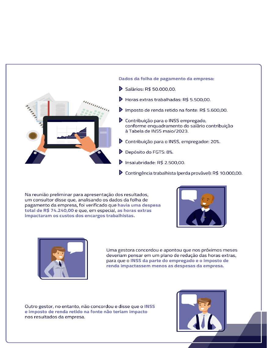 Contabilização da folha de pagamento Desafio A correta contabilização da folha de pagamento é fundamental para que as empresas possam monitorar o seu orçamento, além de promover maior transparência e fidedignidade às informações prestadas às principais partes interessadas (credores, funcionários, investidores, entre outros). Entender os efeitos da contabilização nas demonstrações financeiras é uma habilidade que o administrador, contador ou gestor precisa compreender para uma tomada de decisão assertiva. Você faz parte do grupo de trabalho que está revisando as demonstrações financeiras da empresa Encargo Muito S.A. Depois dessas observações, você se manifestará. A você, foram atribuídas as responsabilidades de: a) Validar as opiniões do consultor e dos dois gestores. b) Apresentar a contabilização correta dos eventos e cálculos demonstrados na folha de pagamento da Encargo Muito S.A. c) Opinar sobre a contingência trabalhista levantada pela equipe de trabalho. Qual tratamento se deve dar a esse evento? Qual é a contabilização? Padrão de Resposta Esperado a) O consultor está correto em suas conclusões e em seus cálculos; e ambos os gestores estão equivocados em suas conclusões. Veja cada linha da folha de pagamento apresentada: - Imposto retido na fonte = encargo do empregado, mas o recolhimento é feito pelo empregador. - Contribuição para o INSS, empregado encargo do empregado e conforme tabela a seguir. Sendo o teto para cálculo o valor de R$ 7.507,49, com a alíquota de 14%. - Contribuição para o INSS, empregador: 20% = encargo do empregador. - Depósito FGTS: 8% = encargo do empregador. Dessa forma, o total da despesa/custo com a folha no período será: Remuneração: R$ 58.000,00 (salários + horas extras + adicional de insalubridade). FGTS: R$ 4.640,00 (8% x remuneração). INSS (empregador): R$ 11.600,00 (20% x remuneração). (=) TOTAL: R$ 74.240,00. b) A contabilização será da seguinte forma: Salários, horas extras e adicional de insalubridade. D – Despesa de salários: R$ 58.000,00. C – Salários a pagar: R$ 58.000,00. IRRF: D – Salários a pagar: R$ 5.600,00. C – IRRF a recolher: R$ 5.600,00. INSS: C – INSS a recolher (empregado): D – Salários a pagar: R$ (conforme cálculos de salários e tabela) C – INSS a recolher (empregador): R$ 11.600,00. D – Despesa com encargos sociais: R$ 11.600,00. FGTS: C – FGTS a recolher: R$ 4.640,00. D – Despesa com encargos sociais: R$ 4.640,00. c) Segundo o CPC 25, as contingências com perda estimada em provável devem ser reconhecidas contabilmente. A contabilização reconhecerá uma provisão (passivo) com contrapartida em conta de resultado — provisão para contingências: C - Provisão para contingência trabalhista: R$ 10.000,00. D - Despesa com provisões trabalhistas: R$ 10.000,00. As medições subsequentes levarão em consideração a atualização da provisão pelos índices oficiais de correção. No caso de tributos federais, será corrigido pela taxa Selic. image1.png image2.png