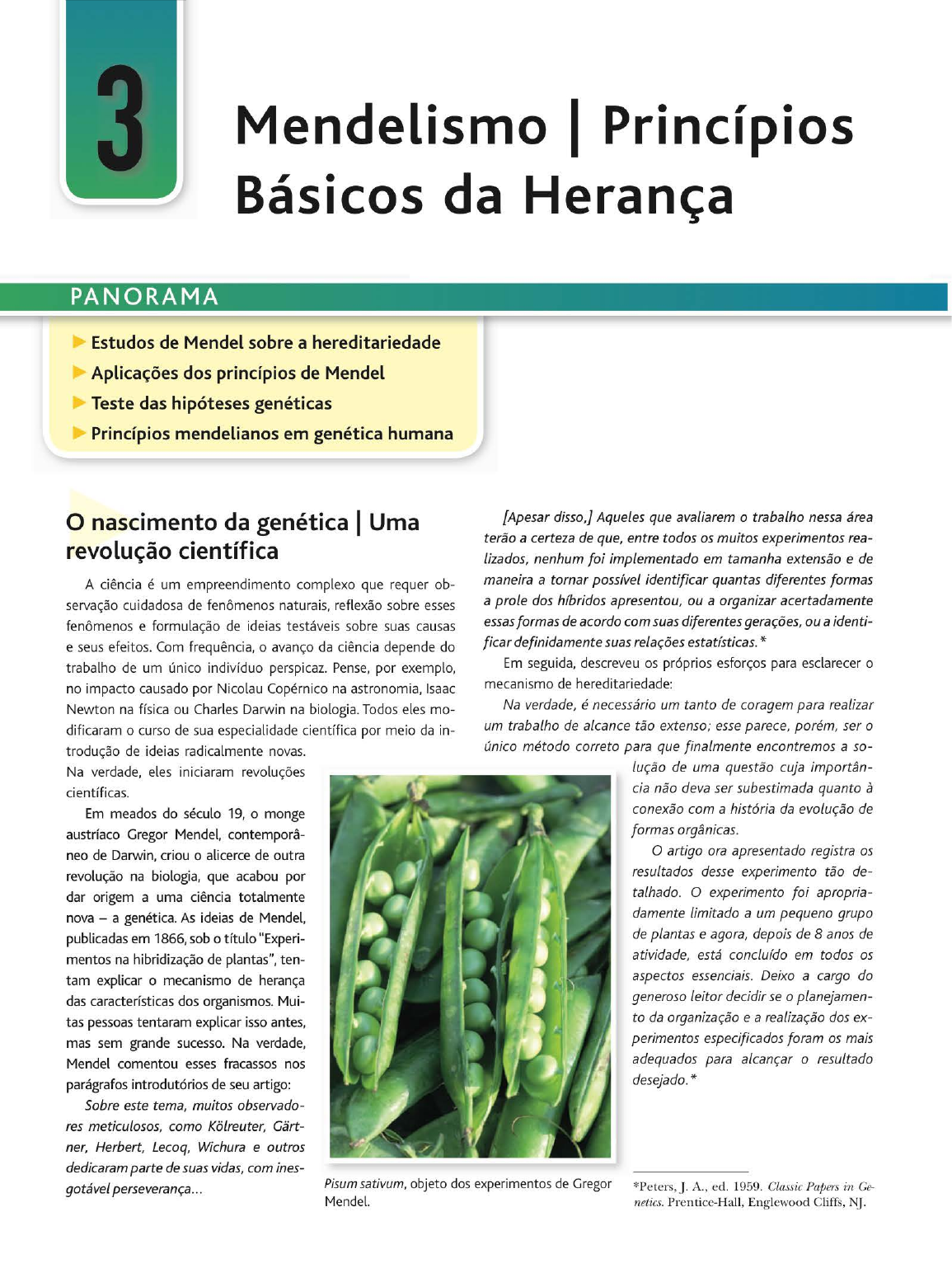 • . , • e ismo r1nc1 IOS , . as1cos PANORAMA Estudos de Mendel sobre a hereditariedade Aplicações dos princípios de Mendel Teste das hipóteses genéticas Princípios mendelianos em genética humana O nascimento da genética 1 Uma revolução científica A ciência é um empreendimento complexo que requer ob- servação cuidadosa de fenômenos naturais, reflexão sobre esses fenômenos e formulação de ideias testáveis sobre suas causas e seus efeitos. Com frequência, o avanço da ciência depende do trabalho de um único indivíduo perspicaz. Pense, por exemplo, no impacto causado por Nicolau Copérnico na astronomia, Isaac Newton na física ou Charles Darwin na biologia. Todos eles mo- dificaram o curso de sua especialidade científica por meio da in- trodução de ideias radicalmente novas. Na verdade, eles iniciaram revoluções científicas. Em meados do século 19, o monge austríaco Gregor Mendel, contemporâ- neo de Darwin, criou o alicerce de outra revolução na biologia, que acabou por dar origem a uma ciência totalmente nova - a genética. As ideias de Mendel, publicadas em 1866, sob o título "Experi- mentos na hibridização de plantas", ten- tam explicar o mecanismo de herança das características dos organismos. Mui- tas pessoas tentaram explicar isso antes, mas sem grande sucesso. Na verdade, Mendel comentou esses fracassos nos parágrafos introdutórios de seu artigo: eran [Apesar disso,] Aqueles que avaliarem o trabalho nessa área terão a certeza de que, entre todos os muitos experimentos rea- lizados, nenhum foi implementado em tamanha extensão e de maneira a tornar possível identificar quantas diferentes formas a prole dos híbridos apresentou, ou a organizar acertadamente essas formas de acordo com suas diferentes gerações, ou a identi- ficar definida mente suas relações estatísticas.* Em seguida, descreveu os próprios esforços para esclarecer o mecanismo de hereditariedade: Na verdade, é necessário um tanto de coragem para realizar um trabalho de alcance tão extenso; esse parece, porém, ser o único método correto para que finalmente encontremos a so- lução de uma questão cuja importân- cia não deva ser subestimada quanto à conexão com a história da evolução de f armas orgânicas. O artigo ora apresentado registra os resultados desse experimento tão de- talhado. O experimento foi apropria- damente limitado a um pequeno grupo de plantas e agora, depois de 8 anos de atividade, está concluído em todos os aspectos essenciais. Deixo a cargo do generoso leitor decidir se o planejamen- to da organização e a realização dos ex- perimentos especificados foram os mais adequados para alcançar o resultado desejado.* Sobre este tema, muitos observado- res meticulosos, como Kolreuter, Gart- ner, Herbert, Lecoq, Wichura e outros dedicaram parte de suas vidas, com ines- gotável perseverança ... Pisum sativum, objeto dos experimentos de Gregor Mendel. *Peters,J. A., ed. 1959. Classic Paj1ers in Ge- netics. Pren tice-Hall, Engle,.vood Clifis, NJ. Capítulo 3 1 Mendelismo 1 Princípios Básicos da Herança 39 Estudos de Mendel sobre a hereditariedade Os experimentos de Gregor Mendel com ervilhas eluci- daram como as características são herdadas. A vida de Gregor Johann Mendel (1822-1884) atra,res- sou o século 19. Seus pais eram fazendeiros i1a Morávia, então parte do Império dos Habsburgo na Europa Cen- tral. A educação rural ensinou-lhe o culti''º de plantas e a criação de animais e i11spirou o interesse na natureza. Aos 21 anos, Mendel deixou a fazenda e ingressou em um mosteiro católico na cidade de Br110 (hoje cidade da República Tcheca). Em 1847, ordenou-se padre, adotan- do Gregor como nome religioso. Mais tarde, deu aulas na escola secundária local, licenciando-se entre 1851 e 1853 para estudar na Uni,rersidade de Viena. De volta a Br110, retomou a vida como monge professor e i11iciou os experimentos ge11éticos que acabaram por tor11á-lo famoso. Mendel fez experimentos com várias espécies de plan- tas de jardim e até tentou alguns experime11tos com abelhas. Obte,,e maior sucesso, porém, com as ervilhas. Ele co11cluiu os experimentos com er,rilhas em 1864. Em 1865, Mendel apresentou os resultados à Sociedade de História Natural local e no ano seguinte publicou um relatório detalhado nos anais da sociedade. Infelizmen- te, esse artigo permaneceu na obscuridade até 1900, quando foi redescoberto por três botânicos - Hugo de Vries, na Hola11da, Carl Correns, i1a Alemanha, e Eric / von Tschermak-Seysenegg, na Austria. Ao pesquisarem na literatura científica dados que respaldassem suas pró- prias teorias de hereditariedade, todos eles constataram que Mendel realizara uma análise detalhada e meticulosa 35 anos a11tes. Rapidamente, as ideias de Mendel tiveram aceitação, sobretudo graças aos esforços de promoção de um biólogo britânico, William Bateson. Esse defensor das descobertas de Mendel cunhou um novo termo para des- crever o estudo da hereditariedade: genética, derivada da palavra grega que significa "gerar". ORGANISMO EXPERIMENTAL DE MENDEL, A ERVILHA Uma razão para o sucesso de Mendel foi a escolha pers- picaz do objeto experimental. A ervilha, Pisitm sativum, é facilmente cultivada em hortas experime11tais ou em''ª- sos i1a estufa. As flores têm órgãos masculi110 e femini110. As a11teras, os órgãos masculinos, produzem póle11 co11- tendo células espermáticas, e o ovário, o órgão feminino, produz oosferas. Uma peculiaridade da reprodução de ervilhas é que as pétalas da flor fecham-se com firmeza, impedindo a entrada ou a saída dos grãos de póle11. Isso impõe um sis- tema de autofertilização, no qual os gametas masculino e feminino da mesma flor se unem e produzem semen- tes. Assim, há elevada endogamia em cada linhagem de ervilha, com variação genética mínima ou nula de uma geração para a outra. Em vista da u11iformidade, dizemos que essas linhagens são genetica