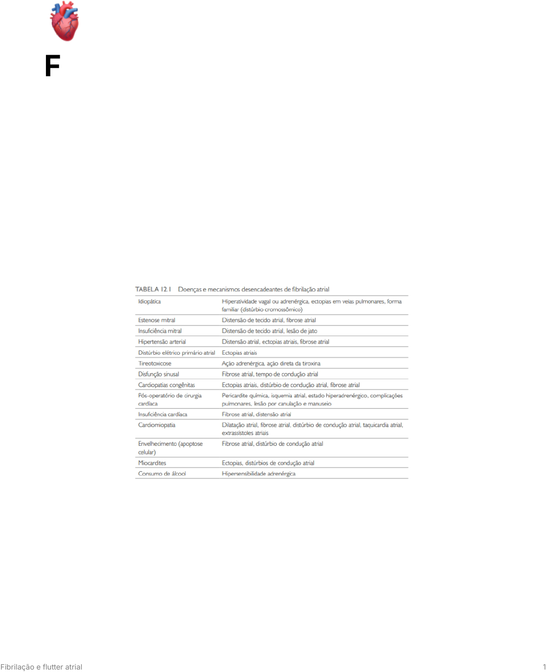 Fibrilação e flutter atrial 1 🫀 Fibrilação e flutter atrial Introdução Fibrilação atrial FA: arritmia mais frequente atualmente. Sociedade Europeia de Cardiologia: indica realização de screening com medição de pulso e ECG para população a partir de 65 anos para diagnóstico precoce de FA. Se associada a doenças HAS, valvopatias ou coronariopatia → instabilidade atrial → causa ectopias atriais e remodelamento atrial funcional e estrutural que gera FA. Importância da FA Maior risco de morte comparado aos indivíduos de mesma faixa etária, podendo duplicar o risco de óbito de pacientes acometidos, aumento de morbidade, risco de IC ou descompensação de IC pré-existente, fenômenos tromboembólicos, AVE. Sintomas Fibrilação e flutter atrial 2 Variados, de assintomáticos a sintomas associados a complicações → a maioria dos sintomas surge pela FC elevada, irregularidade da resposta ventricular e ausência de contração atrial (palpitações), diminuição da tolerância a esforço e da qualidade de vida. Classificação Classificação Descrição Primeira detecção FA pela 1ª vez, independe do tempo de duração da arritmia e presença ou gravidade dos sintomas. FA paroxística Autolimitada (48h). Pode durar até 7 dias (menor reversão espontânea, necessita de anticoagulação). FA persistente FA dura mais que 7 dias ou requer término por cardioversão (drogas ou elétrica). FA persistente de longa duração FA dura mais que 1 ano com estratégia de controle de ritmo. FA permanente Presença de arritmia aceita pelo pciente e médico, sem busca de controle de ritmo. Fibrilação e flutter atrial 3 Causas Se a condição for bem estabelecida, o tratamento das causas de base pode ser a única medida necessária para restaurar o ritmo sinusal e resolver o quadro. As condições associadas predispõem e perpetuam a FA e seu controle tem contribuição no tratamento. Flutter atrial Taquiarritmia atrial macrorreentrante pp no AD, com frequência atrial organizada 240 bpm. Flutter atrial típico Flutter atrial atípico Ou istmo-dependente Abrange todas as taquiarritmias atriais do conceito de flutter Ondas F negativas em DII, DII e aVF ondas F positivas em V1 ECG não característico da descrição anterior Ondas F positivas em DII, DIII e aVF ondas F negativas em V1 Sem linha isoelétrica Fibrilação e flutter atrial 4 Avaliação inicial e manejo agudo FA conhecida ou suspeita: colher história clínica completa � Exercício, emoções, ingestão de álcool � Frequência e duração dos episódios � Comorbidades associadas � História familiar e intensidade dos sintomas Score EHRA de sintomas Manejo de casos agudos Avaliar sinais de instabilidade hemodinâmica relacionada à FA reversão imediata para ritmo sinusal ou alívio dos sintomas. Fibrilação e flutter atrial 5 FA 48h (paroxística) → cardioversão (química ou elétrica), com uso de anticoagulação. FA 48h ou dúvida quanto a ela → presença de trombo deve ser previamente afastada ECO transesofágico ou manutenção de anticoagulação plena 3 semanas antes da cardioversão) programando-se para um tratamento posterior. Avaliação e acompanhamento clínico � Determinação da gravidade dos sintomas ERHA score, CCSSAF score) � Determinação do risco de eventos embólicos � Busca por condições que predisponham FA � Complicações determinadas pelas arritmias a� Eventos embólicos prévios, sintomas de IC, piora de qualidade de vida e desempenho físico. � Avaliação do ECG de 12 derivações a� Quanto a sinais de doenças estruturais IAM, isquemia, sobrecarga, distúrbios de condução, pré-excitação ventricular) � ECO transtorácico a� Útil na detecção de doenças valvares, miocárdicas ou congênitas � Testes de função tireoidiana, hemograma e glicemia são úteis � Avaliação de isquemia não invasiva a� Pacientes com sinais e fatores de risco para coronariopatia Tratamento Buscar a redução dos sintomas e prevenção de complicações graves associadas à FA. Prevenção de complicações: terapia antitrombótica, controle de frequência ventricular e terapia adequada de comorbidades. Terapia antitrombótica Fibrilação e flutter atrial 6 FA valvar: casos de valvopatia reumática (pp estenosa mitral) e próteses valvares → todos os estudos foram de CASOS NÃO VALVARES.