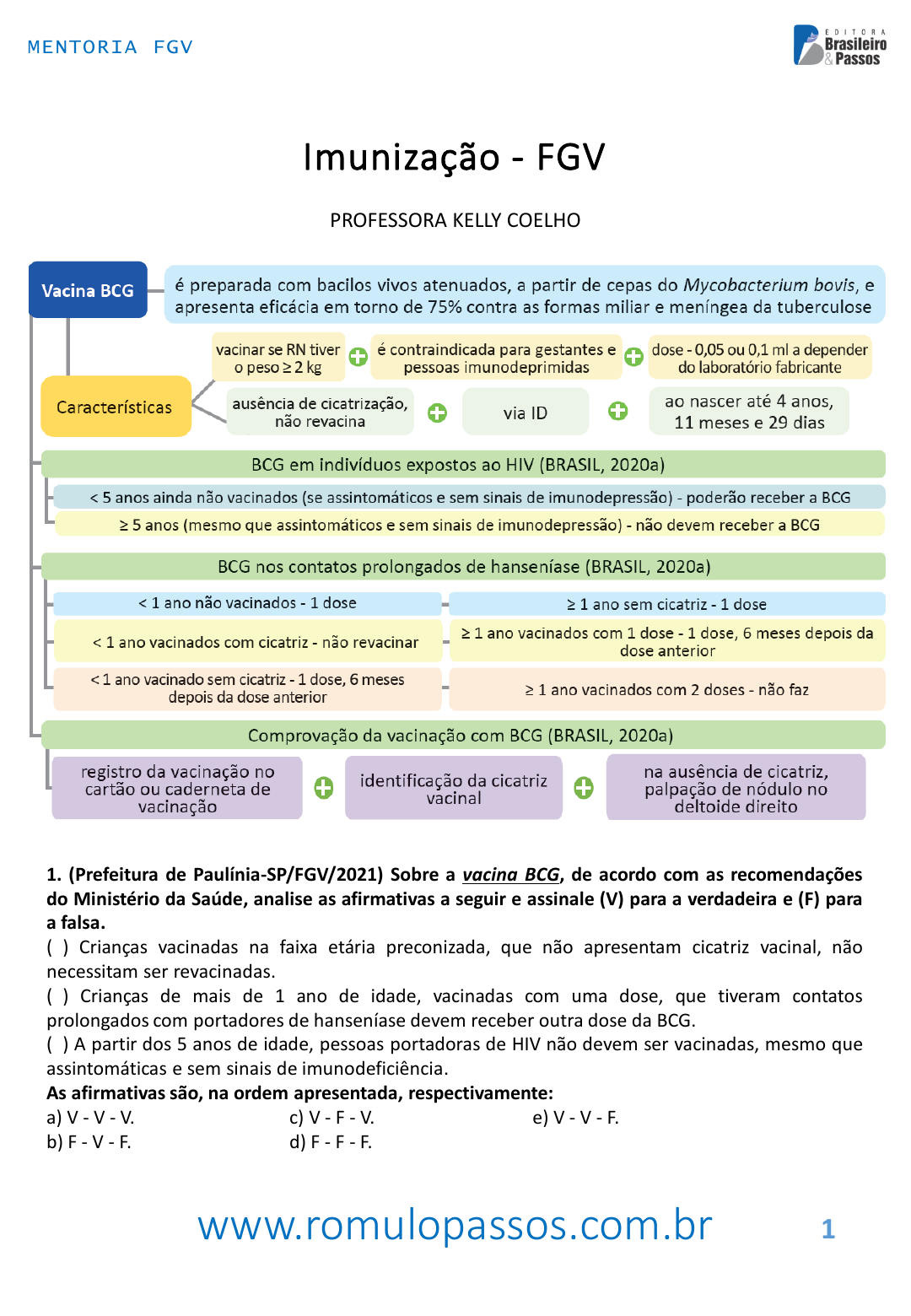 www.romulopassos.com.br MENTORIA FGV 1 1. (Prefeitura de Paulínia-SP/FGV/2021) Sobre a vacina BCG, de acordo com as recomendações do Ministério da Saúde, analise as afirmativas a seguir e assinale (V) para a verdadeira e (F) para a falsa. (_) Crianças vacinadas na faixa etária preconizada, que não apresentam cicatriz vacinal, não necessitam ser revacinadas. (_) Crianças de mais de 1 ano de idade, vacinadas com uma dose, que tiveram contatos prolongados com portadores de hanseníase devem receber outra dose da BCG. (_) A partir dos 5 anos de idade, pessoas portadoras de HIV não devem ser vacinadas, mesmo que assintomáticas e sem sinais de imunodeficiência. As afirmativas são, na ordem apresentada, respectivamente: a) V - V - V. c) V - F - V. e) V - V - F. b) F - V - F. d) F - F - F. Imunização - FGV PROFESSORA KELLY COELHO Tatiane Bastos Carius - 14764736764 www.romulopassos.com.br MENTORIA FGV 2 2. (Prefeitura de Osasco-SP/FGV/2014) Assinale a opção que apresenta a evolução da lesão vacinal da BCG (vacina contra tuberculose) de forma correta. a) Mácula, cicatriz, pústula e úlcera. b) Úlcera pústula, cicatriz e mácula. c) Pústula, mácula, úlcera e cicatriz. d) Mácula, pústula, úlcera e cicatriz. e) Úlcera, mácula, cicatriz e pústula. Se isolada, na apresentação adulta e infantil, pode ser adm. em 1 ou 2 doses de 0,5 ml. 3. (Prefeitura de Osasco-SP/FGV/2014) A primeira dose da vacina contra a hepatite B deve ser administrada na criança após o nascimento, de preferência ainda na maternidade. De acordo com a orientação do Ministério da Saúde, o local de aplicação deve ser a) a região dorso-glútea. b) a região do deltoide. c) a face lateral da coxa d) o músculo retofemoral. e) a região ventroglútea. Tatiane Bastos Carius - 14764736764 www.romulopassos.com.br MENTORIA FGV 3 4. (TRT-PB/FGV/2022) Entre as vacinas indicadas aos profissionais de saúde que atuem na assistência direta ao paciente estão a contra a Hepatite B recombinante e a vacina contra o Tétano (dT). A respeito dessas vacinas, analise as afirmativas a seguir. I. O intervalo recomendado entre a primeira e a terceira dose da vacina contra a Hepatite B é de seis meses. II. Na gestante, a vacina dupla adulto (dT) pode ser administrada a partir da comprovação da gravidez, em qualquer período gestacional. III. Tanto a vacina contra a Hepatite B como a vacina contra o Tétano não podem ser administradas simultaneamente com outras vacinas. Está correto o que se afirma em a) I, apenas. b) II, apenas c) III, apenas. d) I e II, apenas. e) I, II e III. 5. (TJ/AM/FGV/2013) A vacina dupla tipo adulto (dT) é indicada a partir dos sete anos de idade, para prevenção do tétano acidental e da difteria. É também indicada para a vacinação de mulheres em idade fértil (12 a 49 anos) e gestantes, principalmente para a prevenção do tétano neonatal. O esquema básico da vacina dupla tipo adulto (dT) é de a) duas doses, com intervalo mínimo de 60 dias entre as doses. b) três doses, com intervalo mínimo de 60 dias entre as doses. Tatiane Bastos Carius - 14764736764 www.romulopassos.com.br MENTORIA FGV 4 5. (TJ/AM/FGV/2013) c) duas doses, com intervalo mínimo de 30 dias entre as doses. d) três doses, com intervalo mínimo de 30 dias entre as doses. e) uma dose, com reforço a cada 10 anos. 6. (Câmara Municipal de Aracaju/SE/FGV/2021) Os idosos com 60 anos ou mais que já tenham histórico vacinal da dT (dupla adulto): a) devem tomar uma dose de reforço apenas se sofrerem alguma exposição. b) necessitam, por serem mais vulneráveis, de uma dose de reforço a cada cinco anos. c) devem tomar uma dose de reforço da vacina a cada dez anos. d) já possuem imunidade adequada, não sendo necessário doses de reforço. e) devem tomar o esquema completo a cada dez anos. 7. (TJ/DFT/FGV/2022) Sobre a administração de vacinas, é correto afirmar que: a) a vacina contra sarampo, caxumba e rubéola é contraindicada para idosos; b) a tríplice viral é indicada para grávidas a partir do segundo trimestre de gestação, devendo ser evitada no primeiro trimestre. c) o esquema básico da vacina contra o HPV para meninas é de 3 doses, na faixa etária entre 11 e 14 anos. d) a vacina dT adulto deve ser administrada em gestantes na dose de 0,5 ml e com intervalo mínimo de 30 dias entre as doses. e) idosos de 60 anos ou mais devem receber 2 doses da vacina pneumocócica 23-valente, com intervalo mínimo de 60 dias entre as doses. 8. (Senado Federal/FGV/2012) (QUESTÃO ATUALIZADA) O tétano neonatal é uma doença grave, não transmissível e imunoprevenível que acomete recém-nascidos geralmente na 1ª semana de vida ou nos primeiros 15 dias. Uma das formas de prevenção à vacinação da gestante durante o período pré-natal. De acordo o Ministério da Saúde, essa imunização, em gestantes que não tenha registro da vacina, deve constar de três doses que serão aplicadas obedecendo à seguinte sequência: Tatiane Bastos Carius - 14764736764 www.romulopassos.com.br MENTORIA FGV 5 8. (Senado Federal/FGV/2012) (QUESTÃO ATUALIZADA) a) precoce - 30 dias após a 1ª dose - a partir da 20ª semana de gestação, o mais precocemente possível. Respeitar intervalo mínimo de 30 dias entre as doses. b) precoce - 20 dias após a 1ª dose - 30 dias após a 2ª dose. c) precoce - 15 dias após a 1ª dose - 20 dias após a 2ª dose. d) precoce - 15 a 20 dias após a 1ª dose - 40 dias após a ª dose. e) precoce - 20 a 30 dias após a 1ª dose - na 20ª semana de gestação após 30 dias da 2ª dose. Tatiane Bastos Carius - 14764736764 www.romulopassos.com.br MENTORIA FGV 6 9. (TJ/SC/FGV/2018) Devido a um aumento significativo dos casos de gripe na população de um determinado estado, alguns órgãos públicos, onde existem serviços de saúde próprios, resolveram, em parceria com a Secretaria Estadual de Saúde, vacinar o público-alvo de sua organização, o que inclui também as crianças que