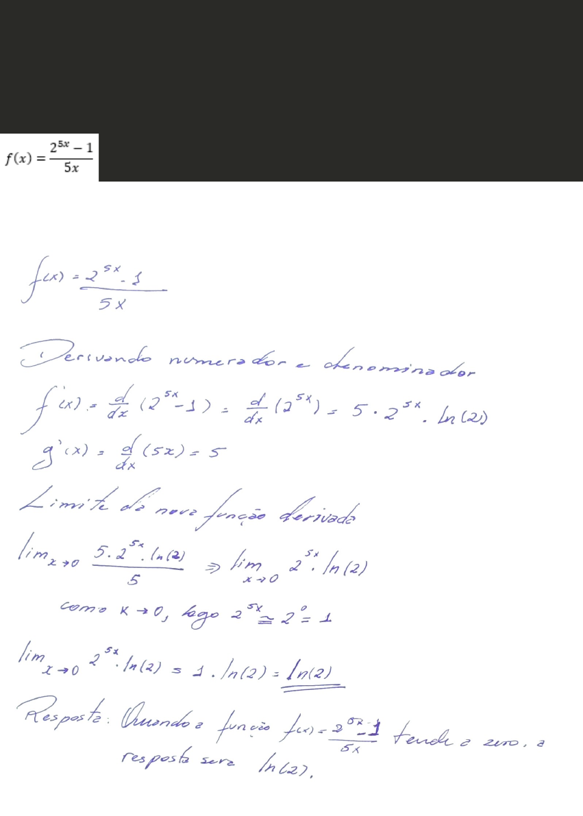 No cálculo de limites, algumas funções permitem apresentar o valor do limite de forma direta. Damos a isso o nome de limites fundamentais. Estes limites, na maior parte das vezes, estão ligados a elementos trigonométricos, exponenciais ou logarítmicos. Baseado nestes limites fundamentais, determine o limite da função a seguir, quando x tende a zero. Com relação ao conceito de integral, existem várias aplicações que podemos destacar, principalmente na área das engenharias. A relação entre as derivadas e integrais tornou-se uma das ferramentas mais poderosas para analisar diversos fenômenos. O primeiro passo para se construir o conceito de integral é estudar alguns critérios de cálculo. Sem assim, resolva a integral indefinida a seguir. Obs.: não esqueça de realizar todos os passos necessários para a resolução desta questão. image1.png image2.png image3.png