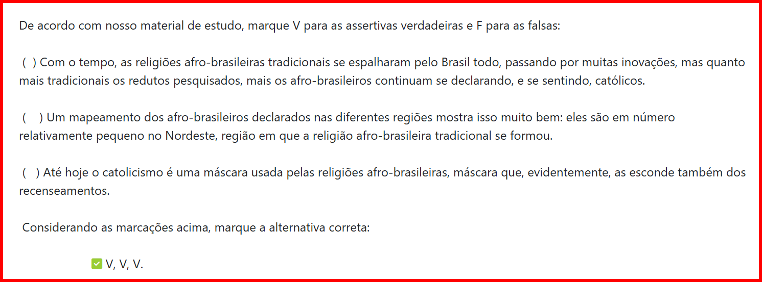 De acordo com nosso material de estudo, marque V para as assertivas verdadeiras e F para as falsas: Com tempo, as religiões afro-brasileiras tradicionais se espalharam pelo Brasil todo, passando por muitas inovações, mas quanto mais tradicionais os redutos pesquisados, mais os afro-brasileiros continuam se declarando, e se sentindo, católicos. ( ) Um mapeamento dos afro-brasileiros declarados nas diferentes regiões mostra isso muito bem: eles são em número relativamente pequeno no Nordeste, região em que a religião afro-brasileira tradicional se formou. Até hoje catolicismo é uma máscara usada pelas religiões afro-brasileiras, máscara que, evidentemente, as esconde também dos recenseamentos. Considerando as marcações acima, marque a alternativa correta: V, V, V.