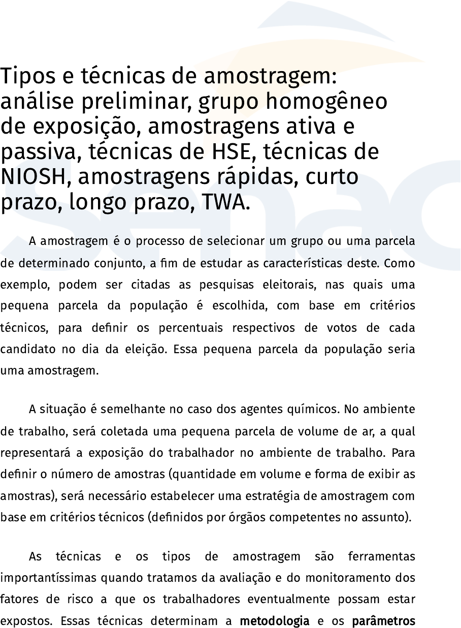 Tipos e técnicas de amostragem: análise preliminar, grupo homogêneo de exposição, amostragens ativa e passiva, técnicas de HSE, técnicas de NIOSH, amostragens rápidas, curto prazo, longo prazo, TWA. A amostragem é o processo de selecionar um grupo ou uma parcela de determinado conjunto, a fim de estudar as características deste. Como exemplo, podem ser citadas as pesquisas eleitorais, nas quais uma pequena parcela da população é escolhida, com base em critérios técnicos, para definir os percentuais respectivos de votos de cada candidato no dia da eleição. Essa pequena parcela da população seria uma amostragem. A situação é semelhante no caso dos agentes químicos. No ambiente de trabalho, será coletada uma pequena parcela de volume de ar, a qual representará a exposição do trabalhador no ambiente de trabalho. Para definir o número de amostras (quantidade em volume e forma de exibir as amostras), será necessário estabelecer uma estratégia de amostragem com base em critérios técnicos (definidos por órgãos competentes no assunto). As técnicas e os tipos de amostragem são ferramentas importantíssimas quando tratamos da avaliação e do monitoramento dos fatores de risco a que os trabalhadores eventualmente possam estar expostos. Essas técnicas determinam a metodologia e os parâmetros corretos que tornam válidos os resultados de testes, destinados às avaliações quantitativas que podem ser realizadas no meio ambiente de trabalho, no próprio trabalhador ou até mesmo por meio de exames biológicos, como sangue e urina. As técnicas e os tipos de amostragem são utilizados no processo e na avaliação dos fatores de riscos ocupacionais. No processo de monitoramento, a avaliação tem como objetivo verificar os agentes no ambiente, medir os níveis de exposição dos trabalhadores a esses agentes para então comparar com os limites de tolerância fornecidos nas normas e nas demais legislações, analisando e propondo então, as melhorias necessárias e observando a hierarquia das medidas de controle. O princípio norteador de qualquer avaliação é termos claramente o que será avaliado, por exemplo, se a avaliação será com base na exposição sofrida pelo trabalhador, na exposição desencadeada por processos produtivos ou para simples verificação de eficiência em sistemas de proteção. Neste sentido, a clareza do objetivo da amostragem será determinante para a definição dos métodos de amostragem. A definição dos métodos poderá considerar uma avaliação individual ou coletiva. Os métodos de avaliação podem basear-se em normas nacionais (NBR, NR, NHO) ou em normas de outros países (OSHA, NIOSH, HSE), objetivando a comparação dos resultados com estudos científicos, os quais indicam os valores máximos de exposição de determinado agente para que não haja nenhum dano à saúde do trabalhador. O tempo de duração da coleta de cada amostra deve ser suficiente para amostrar um volume adequado e obter uma quantidade de volume dentro da faixa de trabalho do método de análise a ser utilizado. O número de amostras a serem coletadas está relacionado ao dispositivo de coleta utilizado e à capacidade de retenção do dispositivo, variando conforme o tipo de amostra. As amostragens podem ser: Diárias Instantâneas Em minutos Em horas Em turnos Em diversos turnos por dias alternados Segundo a Norma de Higiene Ocupacional (NHO) 8 da Fundacentro (Fundação Jorge Duprat e Figueiredo), no anexo C, as amostragens podem ocorrer em turnos integrais ou parciais, desde que elas representem o equivalente a 70% da jornada de trabalho diária. Esse conceito pode variar de uma norma para outra. Tratando-se de um agente químico com limite do tipo média ponderada no tempo (oito horas), devem-se realizar amostras (uma ou mais), a fim de cobrir o máximo de tempo da jornada. Tal anexo apresenta um diagrama do número e do tipo de amostras, segundo o período de coleta. Figura 1: – Tipos de amostragens no ambiente de trabalho Alguns fatores importantes devem ser levados em consideração, como a descrição das tarefas executadas, tais como: tempo de permanência do trabalhador no ambiente exposto, movimentos efetuados, pausas e descansos e condições da exposição. As amostras devem ser coletadas durante o desenvolvimento normal do trabalho, nos períodos em que as tarefas estão sendo realizadas e sempre levando em consideração suas características específicas. Os resultados das amostragens devem ser comparados com parâmetros que chamamos de limites de exposição ocupacional ou limites de tolerância. Esses limites podem ser encontrados na legislação nacional ou na literatura da ACGIH (American Conference of Governmental Industrial Hygienists), por exemplo, para agentes químicos sem limite de exposição no Brasil. As exposições que se situam acima dos limites de tolerância necessitam de medidas corretivas urgentes. Quando a exposição está abaixo do limite de tolerância, mas acima do nível de ação, medidas preventivas precisam ser adotadas. Tais medidas têm por objetivo evitar que o trabalhador se exponha a níveis que ultrapassem o limite de tolerância (devido à variabilidade natural dos processos) ou que, por uma característica individual (suscetibilidade), prejudiquem a saúde. Medidas preventivas envolvem, no mínimo, monitoramento do agente, controle médico e informação ao trabalhador. Além do limite, é preciso estar atento também ao tempo de exposição, pois o tempo de exposição a agentes agressivos e a possibilidade de desenvolver uma doença ocupacional estão intimamente conectados. Consideramos tempo real de exposição o resultado encontrado por meio do estudo da tarefa realizada pelo trabalhador, pois leva em consideração fatores como jornada de trabalho, posicionamento do trabalhador e descanso. Os efeitos nocivos à saúde do trabalhador serão maiores conforme o aumento do tempo de exposição a