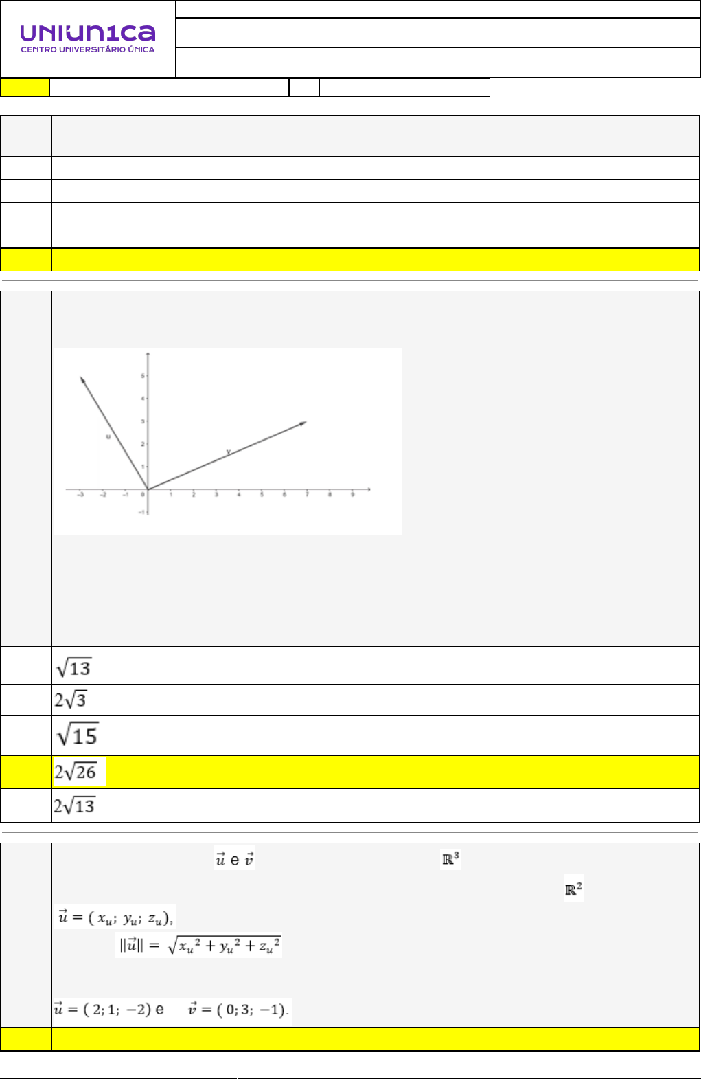 11/01/2025 22:47:04 1/3 REVISÃO DE SIMULADO Nome: ROGERIO DE OLIVEIRA SOARES Disciplina: Álgebra Linear Respostas corretas são marcadas em amarelo X Respostas marcardas por você. Questão 001 Um menino possui 29 moedas de 10 centavos e 15 moedas de 25 centavos. O número de maneiras diferentes que ele tem para formar 5 reais é igual a: A) 2 B) 6 C) 5 D) 4 X E) 3 Questão 002 Dois vetores representam graficamente, no plano cartesiano, com suas extremidades os deslocamentos de dois corpos (deslocamento na unidade km) feitos a partir de um ponto em comum (origem do sistema de coordenadas cartesianas). Veja: Podemos então afirmar que a distância entre esses dois corpos após o deslocamento será de: A) B) C) X D) E) Questão 003 Considere dois vetores e pertencentes ao espaço . Podemos encontrar a norma de cada um deles, usando um raciocínio análogo ao usado para encontrar no , ou seja se , podemos então determinar a sua norma (ou módulo) usando a seguinte fórmula: . Da mesma forma podemos proceder para o encontro do produto escalar. De posse dessas afirmações, encontre, aproximadamente, então o ângulo formado emtre os vetores do espaço que têm as seguintes componentes e A) 58,2º 11/01/2025 22:47:04 2/3 B) 69,2º X C) 36,8° D) 108,3 E) 24,9º Questão 004 Sendo dados os vetores do que é resultante da combinação linear abaixo: A) B) X C) D) E) Questão 005 X A) B) C) D) E) Questão 006 Dois animais estão amarrados a cordas distintas e irão realizar um trabalho, onde vão aparecer tensões em tais cordas. Estas tensões estão sendo representadas no plano cartesiano abaixo: Determine qual é então a medida do ângulo, que é na verdade o ângulo existente entre os vetores que estão representando as tensões nas cordas: X A) 106,3º 11/01/2025 22:47:04 3/3 B) 12,7º C) 92,8º D) 85,2º E) 100,1º Questão 007 Considere as afirmações a seguir que são a respeito do ângluo formado entre dois vetores e logo a seguir julgue-as em verdadeiras ou falsas. I – Quando apresentamos dois vetores no e as suas componentes são tais que esses vetores estão exatamante sobre os eixos coordenados. Podemos afirmar que eles são necessariamente perpendiculares. II – Dois vetores do são perpenciculares, o que acarreta de a norma de cada um deles ser nula. III - Ao calcularmos,segundo a fórmula apresentada, o valor do cosseno do ângulo formado entre dois vetores do , se encontrarmos um valor negativo, resulta em termos um ângulo também negativo. Podemos então concluir que: A) somente as afirmativas II e III estão corretas. B) as afirmativas I,II e III estão corretas. X C) somente a afirmativa I está incorreta. D) as afirmativas I e II estão corretas. E) todas as afirmativas estão incorretas. Questão 008 Sabemos que o produto vetorial é aqule em que tomados dois vetores do , iremos obter um outro vetor também do . Importante afirmar que essa operção é exclusiva do espaço . Sendo dessa operação dada, e lembrando que a obtenção do vetor resultante é dado por: X A) (3; 2; -1) B) (0; 2; 1) C) (3; -2; -1) D) (3;0; -1) E) (3; -1;0)