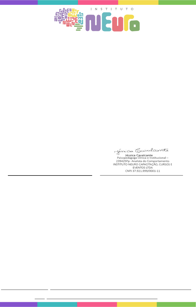 Prezado(a) Sr(a). Declaramos para devidos finas que o (a) aluna (a) ___________ _____________________ de CPF_______________ concluiu o curso de DIFICULDADES E TRANSTORNOS DE APRENDIZAGEM DA LEITURA E ESCRITA, na plataforma de cursos INSTITUTO NEURO CAPACITAÇÃO CURSOS E EVENTOS LTDA - CNPJ 37921999000111, na modalidade de curso livre conforme decreto Presidencial N° 5154, de 23 de julho de 2004, art. 14. Carga horária de 100 horas no período de ___/___/___ a ___/___/___. Com 100 % de aproveitamento e participação. DECLARAÇÃO DE CONCLUSÃO DE CURSO *Esta declaração deve ser anexado ao certificado emitido na plataforma institutoneuro.com.br ASSINATURA DO ALUNO ASSINATURA DO RESPONSÁVEL TÉCNICO DO INSTITUTO NEURO OS CURSOS LIVRES TÊM COMO BASE LEGAL O DECRETO PRESIDENCIAL N° 5.154, DE 23 DE JULHO DE 2004, ART. 1° E 3° E PORTARIA Nº 008, DE 25/06/2002 PUBLICADO NO DIÁRIO OFICIAL – SC – Nº 16.935 – 27.06.2002. ASSIM AS ORGANIZAÇÕES QUE OFERECEM ESTE TIPO DE CURSO TÊM DIREITO DE EMITIR CERTIFICADO AO ALUNO EM CONFORMIDADE COM A LEI Nº 9394/96; DECRETO Nº 5.154/04; DELIBERAÇÃO CEE 14/97 (INDICAÇÃO CEE 14/97). ESSES CERTIFICADOS TÊM VALIDADE LEGAL PARA DIVERSOS FINS. DESTA FORMA A JURISPRUDÊNCIA DO CONSELHO NACIONAL DE EDUCAÇÃO TEM SIDO NO SENTIDO DE DECLARAR-LHES A EQUIVALÊNCIA, DE ACORDO COM REGRAS AMPLAS E FLEXÍVEIS.