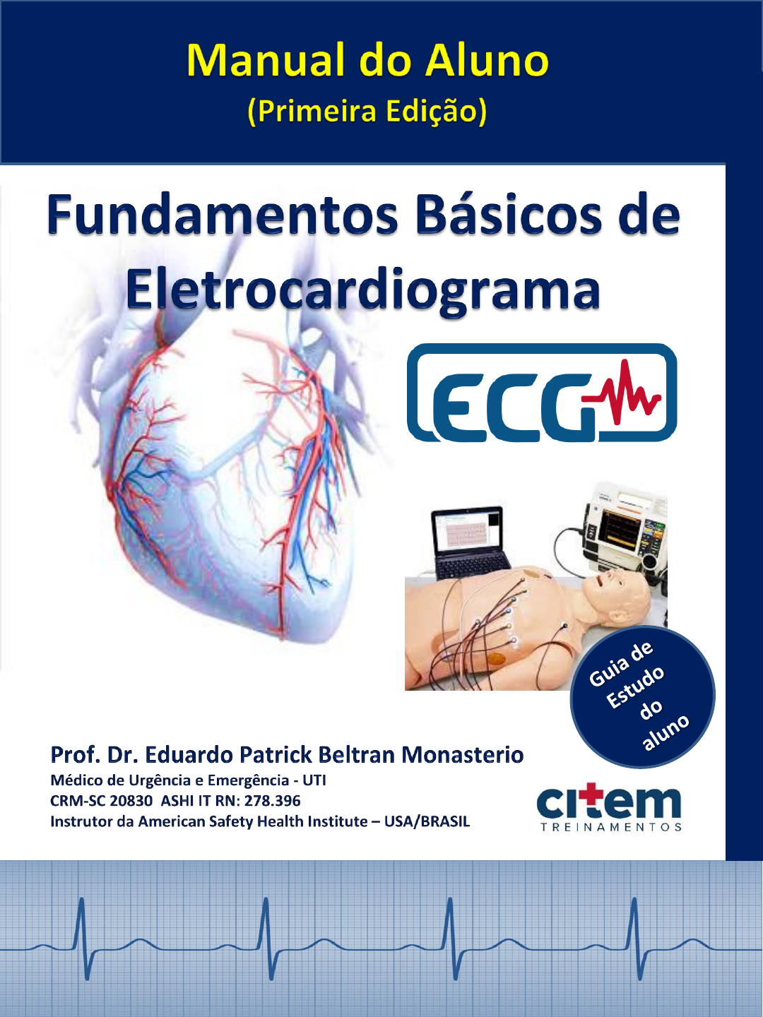 Primeira Edição 2017 Dr. Eduardo Patrick Beltran Monasterio nasceu em Trípoli, Líbia (Norte da África) onde morou até os 13 anos. Ele posteriormente emigrou para os estados unidos de norte américa. Ele é formado em Medicina e teve a oportunidade de fazer seu fellowship em Medicina de Urgência e Emergência no Natividad Medical Center, centro afiliado com a Universidade de Califórnia de São Francisco UCSF, Estados Unidos. Ele emigrou para o Brasil em 2006 com sua família e fez a revalidação em medicina pela Universidade Federal do Ceara. Ele posteriormente fez especialização em Terapia Intensiva e Dermatologia. Em 2007 fundou o C.I.T.E.M. (Centro Internacional de Treinamento em Emergências Médicas) no Brasil, centro atualmente credenciado pela ASHI (American Safety & Health Institute) do qual ele é instrutor e formador de instrutores tanto no Brasil como nos Estados Unidos. Dr. Eduardo tem uma longa trajetória na área de capacitação profissional e atualmente existem mais de 10,000 pessoas capacitadas por ele no Brasil e no exterior. Ele elaborou e implementou um projeto de lei chamado SBV (Suporte Básico de Vida) nas escolas do município de Palhoça, Santa Catarina. Também é autor de vários manuais como, ACLS para todos, BLS Student Handbook, APH para Socorristas e Fundamentos Básicos de Eletrocardiograma. Dr. Eduardo tem uma paixão grande pelo ensino das ciências médicas. Um dos objetivos dele é poder motivar e inspirar outros em alcançar seus objetivos acadêmicos e profissionais através de metodologias inovadoras de ensino com aulas didáticas e de maior impacto de aproveitamento para seus alunos. A metodologia que ele prega e baseado no sistema Feynman. Dr. Eduardo Patrick Beltran Monasterio Dr. Eduardo trabalhou durante vários anos na área de emergências medicas (Pré-hospitalar e Intra-Hospitalar) e também cuidou de pacientes críticos na Unidade de Terapia Intensiva. Trabalhou um tempo com grandes queimados (UTQ) e atualmente vem ministrando vários cursos de capacitação para médicos e enfermeiros no Brasil e também no exterior. Primeira Edição 2017 ´´ O bom professor é sempre um facilitador, ele apenas abre as portas para o aluno. Mais é o aluno que deverá entrar no quarto sozinho para adquirir seu conhecimento, o seu grande ´´tesouro´.´ Pois este tesouro sempre acompanhará seu dono a todos os lugares do mundo até o fim da sua vida´´. Primeira Edição 2017 É expressamente proibida a reprodução deste material com intuito lucrativo, seja de forma parcial ou total; conforme lei 9.610/98 (sobre Direitos Autorais). O eletrocardiograma já tem mais de 100 anos de existência, ainda é o primeiro exame complementar solicitado pelos profissionais de saúde para avaliação cardiológica. Ainda assim continua sendo uma ferramenta de alto valor diagnostico e esta cada vez mais ao alcance de todos. Vemos hoje em dia que o Eletrocardiograma é uma ferramenta que já esta disponível para computadores, tablets e telefones de comunicação celular inteligentes (smartphone). Basta apenas baixar um aplicativo do seu celular e você já tem um ECG portátil na mão. Realmente vivemos em uma era digital incrível que facilita o acesso tecnológico para o profissional de saúde e seus pacientes. De nada serve ter acesso a uma tecnologia, se não sabemos como usar ela. É aqui a vital importância de saber como interpretar o ECG. Cabe ao profissional da saúde treinar o suficiente até aprender a arte da interpretação do eletrocardiograma. Cabe ressaltar que este manual (apostila) não é um substituto para os grandes tratados de eletrocardiograma. Este manual serve apenas para facilitar o aprendizado do curso de Fundamentos Básicos de Eletrocardiograma do CITEM. Como o ECG muitas vezes é uma matéria bastante extensa, confusa e de difícil compreensão para algumas pessoas, foi desenvolvido uma metodologia de abordagem sistemática e simplificada em 6 passos (pelo Dr. Eduardo Beltran), permitindo organizar de forma rápida e simplificada a identificação dos diversos ritmos encontrados em pacientes. O curso de Fundamentos Básicos de Eletrocardiograma está composto em dois módulos (Teórico/Prático) permitindo ao aluno poder praticar a metodologia dos 6 passos. Esperamos que o seu treinamento conosco, seja satisfatório e que no final do curso você tenha aprendido a detectar todas as anormalidades comuns que podem ocorrer em um ECG, e estará preparado para seu próximo paciente! Primeira Edição 2017 C ITEM - P re fácio Introdução-------------------------------------------------------------------------- página 1 Potencial de Ação ---------------------------------------------------------------- página 2 Nexos e Vetores ------------------------------------------------------------------ página 3 Princípios do Galvanômetro -------------------------------------------------- página 4 Anatomia do Coração ----------------------------------------------------------- página 6 Ondas, Segmentos e Intervalos ---------------------------------------------- página 11 METODOLOGIA DOS 6 PASSOS: PASSO 1: Impressão Geral ------------------------------------------------------ página 12 PASSO 2: Calibração -------------------------------------------------------------- página 13 PASSO 3: Interpretação do Ritmo --------------------------------------------- página 19 Calculando a Frequência Cardíaca ------------------------------ página 19 Intervalo PR ------------------------------------------------------------ página 24 Bloqueio Átrio Ventricular I ̊-------------------------------------- página 25 Bloqueio Átrio Ventricular II ̊------------------------------------- página 27 Bloqueio Átrio Ventricular III ̊------------------------------------ página 32 PASSO 4: Interpretação de QRS ----------------------------------------------- página 34 Progressão de Onda R ---------------------------------------------- págin