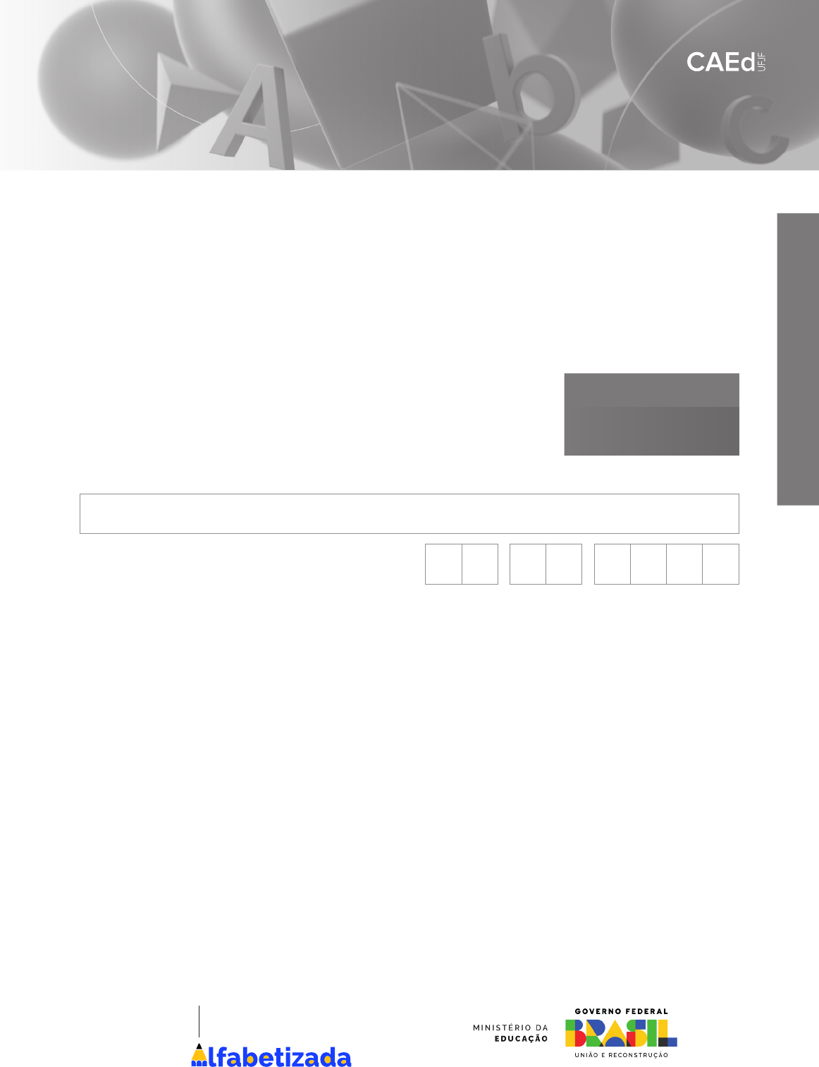 CA D E R N O Data de Nascimento do(a) estudante Nome do(a) estudante D 0 2 0 5 AVALIAÇÃO CONTÍNUA DA APRENDIZAGEM CICLO I 2024 2º ano do Ensino Fundamental FLUÊNCIA C A D E R N O D O A P LI C A D O R CADERNO DO APLICADOR Criança Compromisso Nacional Caro(a) estudante, Você está participando da Avaliação Contínua da Aprendizagem - Ciclo I - 2024. Sua participação é muito importante para sabermos como está a nossa educação. C Este caderno é composto de questões de Fluência. Bom teste! 88009988330055661100 D0205 . 1/3 NÃO LEU ACERTOU INVENTOU LETRA/ PALAVRA SOLETROU/ NOMEOU LETRAS SILABOU ERROU 01 GELADO A B C D E F 02 SALA A B C D E F 03 CAMADA A B C D E F 04 LATA A B C D E F 05 PILOTO A B C D E F 06 JOGO A B C D E F 07 TAPETE A B C D E F 08 LOJA A B C D E F 09 COLEGA A B C D E F 10 REDE A B C D E F 11 CEREJA A B C D E F 12 SOPA A B C D E F 13 VOLUME A B C D E F 14 LUVA A B C D E F 15 COLETE A B C D E F 16 TELA A B C D E F 17 MENINO A B C D E F 18 PELE A B C D E F 19 BURACO A B C D E F 20 LITERATURA A B C D E F 21 MURO A B C D E F 22 ANEL A B C D E F 23 PLANTA A B C D E F 24 TERRA A B C D E F 25 BODE A B C D E F 26 ESCURO A B C D E F 27 BLOCO A B C D E F 28 SALADA A B C D E F 29 DOIS A B C D E F 30 TELEFONE A B C D E F 31 COLA A B C D E F NÃO LEU ACERTOU INVENTOU LETRA/ PALAVRA SOLETROU/ NOMEOU LETRAS SILABOU ERROU 32 CINZA A B C D E F 33 FILME A B C D E F 34 TABELA A B C D E F 35 PALESTRA A B C D E F 36 RECADO A B C D E F 37 FAXINA A B C D E F 38 PALMEIRA A B C D E F 39 GELO A B C D E F 40 BOTE A B C D E F 41 PÉ A B C D E F 42 PISO A B C D E F 43 AMIZADE A B C D E F 44 VISITA A B C D E F 45 NUCA A B C D E F 46 CAPACETE A B C D E F 47 BEM A B C D E F 48 SOL A B C D E F 49 MODELO A B C D E F 50 LÁ A B C D E F 51 CABO A B C D E F 52 GINÁSTICA A B C D E F 53 PASTA A B C D E F 54 ME A B C D E F 55 CURIOSO A B C D E F 56 LARANJA A B C D E F 57 ARANHA A B C D E F 58 GIGANTE A B C D E F 59 NATURAL A B C D E F 60 NOVATO A B C D E F Total de palavras em cada situação de leitura Motivo para não ter lido: A o(a) estudante se recusou a ler. B o(a) estudante disse que não consegue ler. C o(a) estudante disse que não sabe ler. QUESTÃO 1: LISTA DE PALAVRAS Aluno: Turma: Data: / / FICHA DE ACOMPANHAMENTO INDIVIDUAL – 2EF AVALIAÇÃO CONTÍNUA DA APRENDIZAGEM – CICLO I – 2024 1842D02051 88778877113333998844 D0205 . 2/3 NÃO LEU ACERTOU ERROU 01 DALA A B C 02 CITARA A B C 03 LENO A B C 04 FATIGA A B C 05 SORA A B C 06 TILO A B C 07 REBOJO A B C 08 VINA A B C 09 MALUFO A B C 10 FOJO A B C 11 BACANO A B C 12 RUFO A B C 13 BIPENE A B C 14 GILA A B C 15 VELETA A B C 16 BIGA A B C 17 LUZIDO A B C 18 SELE A B C 19 GIRINO A B C 20 TOLEDANO A B C 21 TESLA A B C NÃO LEU ACERTOU ERROU 22 CAMBRA A B C 23 MATULA A B C 24 RECONFORTO A B C 25 MACRAMÉ A B C 26 VÊ A B C 27 TRIS A B C 28 GERBERA A B C 29 NIZA A B C 30 CABOTINO A B C 31 CABILA A B C 32 SE A B C 33 ASTROMETRIA A B C 34 TU A B C 35 ARAGONESA A B C 36 TALUDA A B C 37 LURA A B C 38 PALATINO A B C 39 CHÁ A B C 40 CRU A B C Total de palavras em cada situação de leitura Motivo para não ter lido: A o(a) estudante se recusou a ler. B o(a) estudante disse que não consegue ler. C o(a) estudante disse que não sabe ler. FICHA DE ACOMPANHAMENTO INDIVIDUAL – 2EF AVALIAÇÃO CONTÍNUA DA APRENDIZAGEM – CICLO I – 2024 QUESTÃO 2: LISTA DE PALAVRAS POSSIVELMENTE DESCONHECIDAS 1842D02052 66220099119988883366 Motivo para não ter lido: A o(a) estudante se recusou a ler. B o(a) estudante disse que não consegue ler. C o(a) estudante disse que não sabe ler. Qual é a posição da última palavra lida pelo estudante na linha indicada? Total de palavras lidas de modo errado O estudante obedeceu às pausas de sentido? A Sim B Não Pergunta 1 D ECBA Pergunta 2 D ECBA Pergunta 3 D ECBA REGISTRO DE LEITURA DE TEXTO D0205 . 3/3 Nº da linha Texto Nº de palavras lidas de modo errado em cada linha 01 O1 SAPO2 02 UM3 BELO4 DIA,5 VÁRIOS6 AMIGOS7 FORAM8 PASSEAR,9 ENTRE10 ELES11 03 ESTAVAM12 O13 SAPO,14 O15 PINTINHO,16 O17 RATO,18 A19 FORMIGA20 E21 O22 INSETO.23 04 TODOS24 PASSEAVAM25 E26 BRINCAVAM27 ATÉ28 QUE29 CHEGARAM30 AO31 RIO.32 05 – VAMOS33 NADAR!34 – DISSE35 O36 SAPO37 E38 PULOU39 NA40 ÁGUA.41 06 “NÃO42 SABEMOS43 NADAR”,44 DISSERAM45 O46 PINTINHO,47 O48 RATO,49 A50 07 FORMIGA51 E52 O53 INSETO.54 08 O55 PINTINHO,56 O57 RATO,58 A59 FORMIGA60 E61 O62 INSETO63 FICARAM64 TRISTES65 09 PORQUE66 NÃO67 PODIAM68 ATRAVESSAR69 O70 RIO71 E72 COMEÇARAM73 A74 PENSAR.75 10 ENTÃO76 SURGIU77 UMA78 IDEIA!79 11 O80 PINTINHO81 TROUXE82 UM83 PEDAÇO84 DE85 FOLHA86 DE87 ÁRVORE.88 O89 12 RATINHO,90 UMA91 CASCA92 DE93 NOZ.94 A95 FORMIGA96 TROUXE97 UM98 CANUDO.99 E100 O101 13 INSETO102 TROUXE103 UMA104 LINHA.105 14 E106 O107 TRABALHO108 COMEÇOU:109 ENFIARAM110 UM111 CANUDO112 NA113 CASCA,114 15 AMARRARAM115 UM116 PEDAÇO117 DE118 PAPEL119 COM120 UM121 BARBANTE122 – E123 16 CONSTRUÍRAM124 UM125 BARCO!126 17 ELES127 EMPURRARAM128 O129 BARCO130 PARA131 A132 ÁGUA.133 ELES134 SE135 SENTARAM136 18 E137 O138 BARCO139 COMEÇOU140 A141 NAVEGAR!142 19 O143 SAPO,144 QUE145 NÃO146 PARAVA147 DE148 RIR,149 NÃO150 VIU151 QUE152 O153 BARCO154 JÁ155 HAVIA156 20 NAVEGADO157 PARA158 LONGE.159 IMPORTANTE: As questões de compreensão só devem ser aplicadas aos estudantes que conseguem realmente ler o texto até o final e que não estejam silabando ou dizendo apenas letras. QUESTÃO 3: LEITURA DE TEXTO FICHA DE ACOMPANHAMENTO INDIVIDUAL – 2EF AVALIAÇÃO CONTÍNUA DA APRENDIZAGEM – CICLO I – 2024 1842D02053 BL05D02 APLICADOR, SIGA AS AÇÕES DESCRITAS E LEIA PARA O ESTUDANTE SOMENTE a(s) informação(ões) que apresenta(m) o desenho de um megafone m. ORIENTAÇÕES PARA A APLICAÇÃO DAS TAREFAS DE FLUÊNCIA • Iniciando a aplicação, diga para o estudante: M Vou pedir para que você leia várias palavras até o momento em que eu disser para você parar, mas antes vamos ver como você vai fazer para ler, ok? • Feito isso, direcione o estudante 