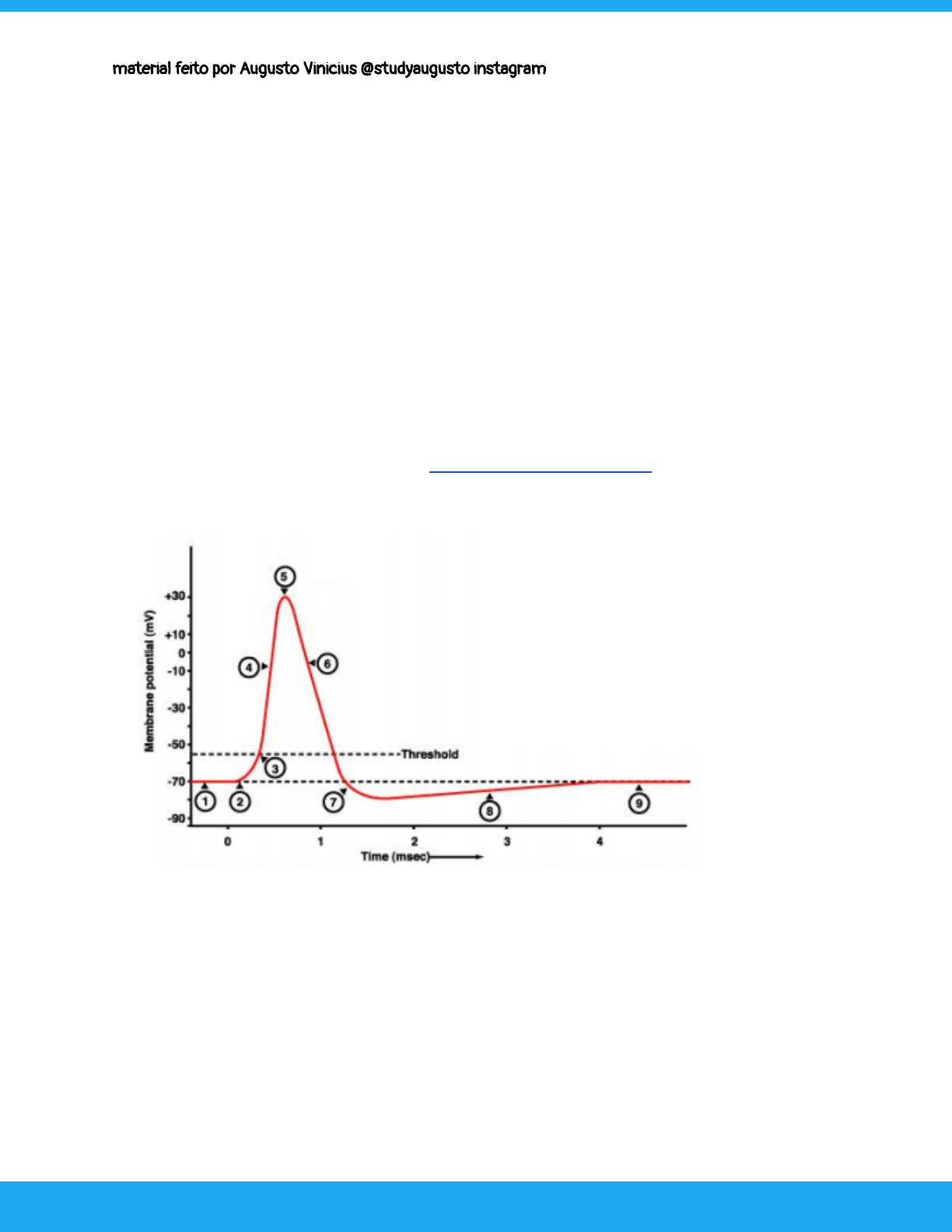material feito por Augusto Vinicius @studyaugusto instagram 1º PERÍODO PSICOLOGIA 2019 PROVA DE BASES BIOLÓGICAS DO COMPORTAMENTO Simulado para a prova discursiva de BBC 24/06/2019 Preparado por instagram @studyaugusto video no canal explicando esse material = https://youtu.be/KBKKnKnlGRI 1- Indique o que acontece em cada número desse gráfico de potencial de ação. 1- Potencial de membrana/repouso, neurônio polarizado, meio intracelular negativo e com K+, meio extracelular positivo e com Na+ 2- Neurotransmissor abrindo canais químicos dependente de Na+, início da despolarização 3- Limiar, abertura dos canais voltagem dependente de Na+, influxo de Na+ 4- Neurônio tornando-se positivo devido ao influxo de Na+ 5- Neurônio despolarizado, abertura dos canais voltagem dependente de K+, fechamento dos canais de Na+, efluxo de K+ 1 https://youtu.be/KBKKnKnlGRI material feito por Augusto Vinicius @studyaugusto instagram 6- Repolarização, neurônio tornando-se negativo novamente devido a saída de K+ 7- Início da hiperpolarização porque o canal de K+ é lento, então saiu mais K+ do que entrou Na+ 8- A ação da bomba de Na+/K+ torna-se mais evidente 9- Igual o número 1 2- Explique o que é Potencial de ação. É uma inversão de cargas, inicia-se devido a ação de neurotransmissores abrindo canais químicos dependente de Na+ que possibilitam a despolarização do neurônio. É marcada por uma rápida troca iônica entre sódio e potássio. 3- Qual a função do cálcio (Ca2+) na sinapse? Sinalizar para o neurônio que é o momento de liberar os neurotransmissores 4- Preencha todos os retângulos com as informações correspondentes a cada espaço em branco. 5- Quais são os principais íons inibitórios e excitatórios? Qual é o principal neurotransmissor inibitório e excitatório? Os íons inibitórios são o K+ e o Cl-, os íons excitatórios são os Na+ e o Ca+, o principal neurotransmissor 2 material feito por Augusto Vinicius @studyaugusto instagram excitatório é a noradrenalina e o principal neurotransmissor inibitório é o gabba. 6- Por que o organismo adquire resistência ao uso de drogas? Porque as drogas liberam neurotransmissores,entretanto devido ao downregulation, a cada uso da droga, o número de receptores diminui, sendo necessário usar mais drogas para ter o mesmo efeito da primeira vez, devido ao aumento da resistência pela diminuição do número de receptores. 7- Qual a relação entre drogas e exercício físico? Ambos liberam neurotransmissores, entretanto drogas possuem muitos efeitos colaterais danosos 8- Para que o impulso nervoso ocorra, quais estruturas presentes nos neurônios precisam estar em boas condições? O neurônio pré sináptico precisa de concentrações de cálcio para ter a comunicação e ele tem que ser eficiente em produzir neurotransmissor, já o pós sináptico precisa de receptores funcionais. 9- Como acontece o ato reflexo? O neurônio aferente recebe e transmite o estímulo sensitivo para o interneurônio que o transmite para o neurônio eferente, realizando o ato reflexo por meio da contração muscular 10- Por que a dor é sentida, somente após o ato de retirada? Por que o interneurônio precisa enviar a informação para o cérebro que vai interpretar e desencadear uma resposta que vai de enviada para o interneurônio e depois para o neurônio sensitivo. É um caminho mais longo, portanto demora mais. 11- O que é potencial de membrana/repouso? É quando o neurônio está polarizado, com K+ no interior e Na+ fora, mais predominância de carga negativa dentro e carga positiva fora 12- Durante o potencial de ação, o neurônio passa por diferentes períodos: despolarização, repolarização e hiperpolarização. Defina cada um deles. Despolarização é quando a entrada de Na+ deixa a célula mais positiva, repolarização é quando a saída de K+ deixa a célula mais negativa e hiperpolarização é quando o canal de K+ é muito lento então vai sair mais K+ do que entrou Na+, tornando a célula mais negativa do que em fase polarizada. 13- Quais os neurotransmissores atuantes no sistema nervoso periférico autônomo simpático e parassimpático? No simpático na fibra pré ganglionar é a acetilcolina e na pós ganglionar é a noradrenalina, já no parassimpático na fibra pré e pós ganglionar é a acetilcolina. 14- Escreva o que cada número dessa imagem representa. 3 material feito por Augusto Vinicius @studyaugusto instagram O número 1 são terminações nervosas do neurônio aferente, o número 2 é o neurônio aferente, o número 3 é o interneurônio, o número 4 é o neurônio eferente e o número 5 são as terminações nervosas do neurônio eferente. 15- Como um anestésico tem a capacidade de impedir a transmissão de dor? Anestésicos podem abrir canais de cloreto ou potássio e hiperpolarizar a célula ou bloquear canais excitatórios, impedindo a despolarização. Dessa forma impedem a transmissão de dor, pois o impulso nervoso não irá ocorrer sob o efeito de anestésicos. 16- Por que não se pode retirar uma droga abruptamente? Não pode retirar abruptamente porque o neurônio está sob efeito de downregulation, ou seja com pouco receptor e não vai conseguir ser excitado, como estava sendo antes, é necessário esperar um tempo para que o downregulation e o upregulation possam equilibrar a quantidade de receptores, caso contrário o indivíduo apresentará sintomas de abstinência devido à falta de excitação do neurônio. 17- Explique o princípio do “tudo ou nada” Quando o neurônio muda de carga, todas as partes da célula também mudam, isso demonstra que apenas é necessário estímulo que seja forte o suficiente para atingir o limiar, a partir desse ponto, ocorre a despolarização. 18- Qual a função da hiperpolarização? Permitir que a célula retorne aos seus gradientes químicos, é o tempo da célula se preparar pro novo potencial de ação. 19- Qual a função da bomba de pot