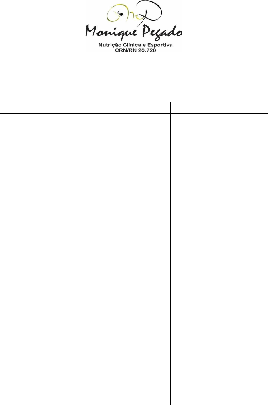 DIETA SÓLIDA – SLEEVE 30 dias de duração HORÁRIO REFEIÇÃO QUANTIDADE 07:00h - Fruta (1 banana ou 1 fatia de mamão ou 2 col de sopa de abacate) - Cuscuz (molhado com leite desnatado) - Ovo cozido ou queijo coalho light - Leite desnatado ou iogurte light - 1 porção - 2 colheres de sopa - 1 und ou 1 fatia de 30g - 100 ml 09:00h - Salada de fruta Ou - Fruta – maçã ou pera ou kiwi ou goiaba ½ xicara – 100g ½ und 12:00h - Carne ou frango ou peixe - Feijão - Purê de legumes ou legumes cozidos - 1 porção de 80 gramas - 2 colheres de sopa - 2 colheres de sopa 15:00h - Iogurte light Ou - Polenguinho light ou queijo coalho light - 180 ml - 1 und de 15 gramas ou 1 fatia de 30 gramas 18:00h - Panqueca de frango ou carne com queijo coalho light - Leite desnatado ou suco - 1 und pequena, fazer do tamanho de uma panquequeira) - 100 ml 21:00h - Vitamina ou suco de fruta + - 1 medida de whey protein - 200 ml • Panqueca: Misture bem 2 colheres de sopa de farinha de trigo com 100 ml de leite desnatado e 1 ovo inteiro. Ao formar a massa com a consistência de mingau, leve ao fogo em uma frigideira aquecida (de preferencia antiaderente) untada com 1 fio de azeite. Vire a massa para que ela asse dos dois lados. Em seguida, adicione o recheio frango ou carne bem cozidos e desfiados com requeijão light e uma colher de sopa de queijo coalho light picado. • Todas as frutas já estão liberadas Medidas das porções das frutas Melancia – 1 fatia média ou 150g (contando a casca); Melão ou Mamão formosa – 1 fatia média ou 100 gramas; Maçã/Pera/Kiwi/Goiaba/Tangerina – 1 unidade; Uva – 1 cacho pequeno ou 100 gramas; Mamão papaya – ½ unidade média ou 120 gramas; Manga – ½ em média ou 120 gramas.