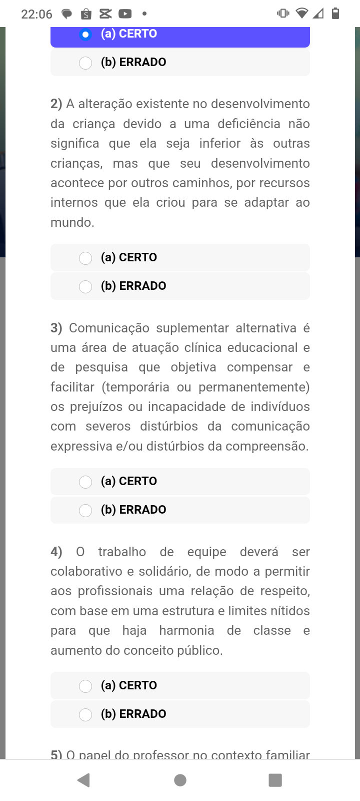 22:06 (a) CERTO (b) ERRADO 2) A alteração existente no desenvolvimento da criança devido a uma deficiência não significa que ela seja inferior às outras crianças, mas que seu desenvolvimento acontece por outros caminhos, por recursos internos que ela criou para se adaptar ao mundo. (a) CERTO (b) ERRADO 3) Comunicação suplementar alternativa é uma área de atuação clínica educacional e de pesquisa que objetiva compensar e facilitar (temporária ou permanentemente) os prejuízos ou incapacidade de indivíduos com severos distúrbios da comunicação expressiva e/ou distúrbios da compreensão. (a) CERTO (b) ERRADO 4) o trabalho de equipe deverá ser colaborativo e solidário, de modo a permitir aos profissionais uma relação de respeito, com base em uma estrutura e limites nítidos para que haja harmonia de classe e aumento do conceito público. (a) CERTO (b) ERRADO 5) o do professor no contexto familiar