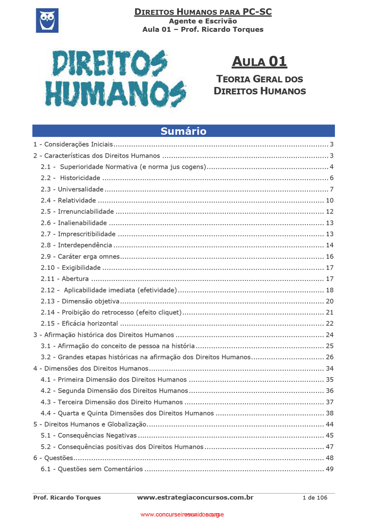 Prof. Ricardo Torques www.estrategiaconcursos.com.br 2 de 106 DIREITOS HUMANOS PARA PC-SC Agente e Escrivão Aula 01 – Prof. Ricardo Torques 6.2 – Gabarito ........................................................................................................... 60 6.3 - Questões Comentadas ........................................................................................ 62 7 - Lista de questões comentadas ao longo do conteúdo .................................................... 91 8 - Resumo da Aula ....................................................................................................... 96 9 - Considerações Finais .............................................................................................. 106 www.concurseirosunid s.orgwww.concursewww.concurs Prof. Ricardo Torques www.estrategiaconcursos.com.br 4 de 106 DIREITOS HUMANOS PARA PC-SC Agente e Escrivão Aula 01 – Prof. Ricardo Torques Não desanimem! Muitas dessas características são intuitivas e estão relacionadas umas às outras. Além disso, ao final de cada uma delas selecionamos as principais informações e as sistematizamos em um esquema que você guardará para a prova! 2.1 - Superioridade Normativa (e norma jus cogens) No direito interno brasileiro, os tratados internacionais de Direitos Humanos possuem estatura de normas constitucionais ou, pelo menos, supralegais, denotando a importância que nosso legislador conferiu à matéria. No direito internacional, os Direitos Humanos são considerados como norma imperativa em sentido estrito (“jus cogens”), que significa que os Direitos Humanos contêm um conjunto de valores considerados essenciais para a comunidade, de maneira que possuem superioridade normativa em relação às demais normas internacionais. Por conta disso, a norma cogente de direitos humanos não pode ser alterada pela vontade de um Estado e a revogação de norma imperativa somente é possível por intermédio de norma de igual hierarquia, ou seja, somente por outra norma jus cogens, elaborada pelas mesmas partes. O jus cogens está consagrado na Convenção Internacional sobre o Direito dos Tratados de Viena de 1969 nos arts. 53, 64 e 71. O primeiro dispositivo conceitua a norma imperativa de direitos humanos (jus cogens). Artigo 53 - Tratado em Conflito com uma Norma Imperativa de Direito Internacional Geral (jus cogens) É nulo um tratado que, no momento de sua conclusão, conflite com uma norma imperativa de Direito Internacional geral. Para os fins da presente Convenção, uma norma imperativa de Direito Internacional geral é uma norma aceita e reconhecida pela comunidade internacional dos Estados como um todo, como norma da qual nenhuma derrogação é permitida e que só pode ser modificada por norma ulterior de Direito Internacional geral da mesma natureza (destacamos). Do art. 64 se extrai que o tratado superveniente que contrariar “jus cogens” anterior será nulo. Artigo 64 - Superveniência de uma Nova Norma Imperativa de Direito Internacional Geral (jus cogens) Se sobrevier uma nova norma imperativa de Direito Internacional geral, qualquer tratado existente que estiver em conflito com essa norma torna-se nulo e extingue- se. O art. 71 estabelece as consequências da nulidade de um tratado internacional. Artigo 71 - Consequências da Nulidade de um Tratado em Conflito com uma Norma Imperativa de Direito Internacional Geral 1. No caso de um tratado nulo em virtude do artigo 53, as partes são obrigadas a: a) eliminar, na medida do possível, as consequências de qualquer ato praticado com base em uma disposição que esteja em conflito com a norma imperativa de Direito Internacional geral; e www.concurseirosunid s.orgwww.concursewww.concurs Prof. Ricardo Torques www.estrategiaconcursos.com.br 6 de 106 DIREITOS HUMANOS PARA PC-SC Agente e Escrivão Aula 01 – Prof. Ricardo Torques 2.2 - Historicidade A historicidade traduz o fato de que os Direitos Humanos decorrem de um processo de formação histórica, de modo que, com o tempo, os direitos humanos surgem e se solidificam em razão das lutas da sociedade em defesa da dignidade da pessoa. Assim, não podemos afirmar que o conjunto de direitos que compõe nossa matéria surge em determinado momento fixo. Pelo contrário, eventos como a Declaração dos Direitos do Homem e as grandes Guerras Mundiais foram marcantes para o surgimento gradual e para a expansão dos Direitos Humanos. A historicidade é base para o estudo das dimensões (ou gerações) dos Direitos Humanos, que veremos adiante. Um aspecto interessante, relacionado com a historicidade, é a discussão acerca da relação entre o Direito Natural e os Direitos Humanos. Vimos acima que um dos fundamentos dos direitos humanos é a concepção jusnaturalista. Vimos, também, que a principal crítica ao jusnaturalismo como fundamento é o fato de não se adequar à ideia de historicidade! Não vamos aqui tecer maiores considerações acerca do Direito Natural. Todavia, devemos compreender que o Direito Natural traduz um conjunto de normas fundadas na natureza das coisas, trata-se de um direito ideal, acima de todas as leis, integrado por regras e por princípios que objetivam àquilo que é justo e correto, tendo por finalidade legitimar as leis positivas. Assim, toda Constituição, toda lei, todo tratado internacional – como diplomas normativos – deve partir do Direito Natural (fundamento de legitimidade). Em razão disso, a doutrina afirma que o Direito Natural é fixo, absoluto, universal e atemporal. É exatamente esta última característica (atemporalidade) que nos interessa! Afirma-se que o Direito Natural, em razão de estar acima do direito positivo de cada Estado, se relacionaria com os Direitos Humanos. Isso, hoje, não é considerado correto! Acabamos de estudar que os Direitos Humanos são históricos, fruto do desenvolvimento da sociedade, que se constroem e se solidificam com o tempo. Por outro lado, vimos, também, qu