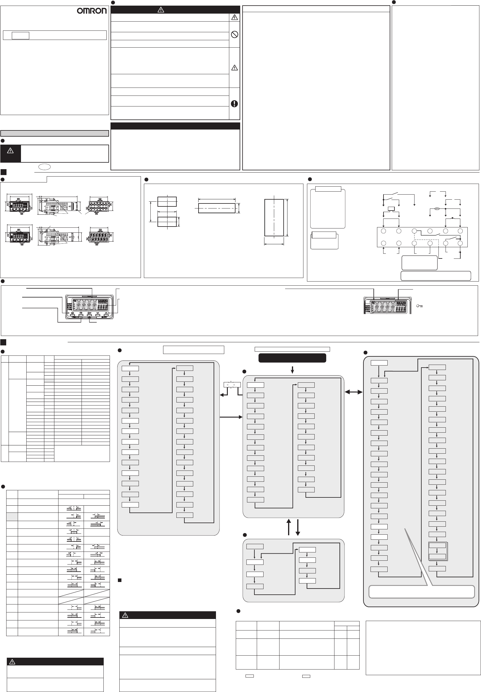 ■ 联系方式 ● 制造商 ● 技术咨询 欧姆龙(上海)有限公司 地址 : 中国(上海)自由贸易试验区金吉路789号 电话 : (86)21-50509988 欧姆龙自动化(中国)有限公司 地址 : 中国上海市浦东新区银城中路200号中银大厦2211室 电话 : (86)21-5037-2222 网址 : http://ww w . f a.omron.com.cn 技术咨询热线 400-820-4535 Indicates a potentially hazardous situation which, if not avoided, is likely to result in minor or moderate injury or property damage. Read this manual carefully before using the product. E5GC Digital Controller Be sure to observe the following precautions to prevent operation failure, malfunction, or adverse affects on the performance and functions of the product. Not doing so may occasionally result in unexpected events. Use the product within specifications. (1) The product is designed for indoor use only. Do not use the product outdoors. Do not use or store the product in any of the following locations. •Places directly subject to heat radiated from heating equipment. •Places subject to splashing liquid or oil atmosphere. •Places subject to direct sunlight. •Places subject to dust or corrosive gas (in particular, sulfide gas and ammonia gas). •Places subject to intense temperature change. •Places subject to icing and condensation. •Places subject to vibration and large shocks. (2) Use/store within the rated temperature and humidity ranges. Provide forced-cooling if required. (3) To allow heat to escape, do not block the area around the product. Do not block the ventilation holes on the product. (4) Be sure to wire properly with the correct signal name and polarity of terminals. (5) Use the specified size of crimped terminals (M3 with width of 5.8 mm or less) for wiring. * For open-wired connections to Digital Controllers with screw terminal blocks, use stranded or solid copper wires with a gauge o f AWG24 to AWG18 (equal to a cross-sectional area of 0.205 to 0.823 mm 2 ). (The stripping length is 6 to 8 mm.) For open-wired connections to Digital Controllers with screwless clamp terminal blocks, use stranded or solid copper wires with a gauge of AWG24 to AWG18 (equal to a cross-sectional area of 0.205 to 0.823 mm 2 ). (The stripping length is 8 to 12 mm.) Up to two wires of the same size and same type or two crimp terminals can be inserted into a single terminal. When connecting two wires to one terminal on a Digital Controller with a screwless clamp terminal block, use two crimped ferrules with a diameter of 0.8 to 1.4 mm and an exposed conductor length of 8 to 12 mm. * * The Digital Controller with screwless clamp terminals underwent UL testing with one stranded wire connected. (6) Do not wire the terminals which are not used. (7) Allow as much space as possible between the controller and devices that generate a powerful high- frequency or surge. Separate the high-voltage or large-current power lines from other lines, and avoid parallel or common wiring with the power lines when you are wiring to the terminals. (8) Use this product within the rated load and power supply. (9) Make sure that the rated voltage is attained within two seconds of turning ON the power using a switch or relay contact. If the voltage is applied gradually, the power may not be reset or output malfunctions may occur. (10) Make sure that the Digital Controller has 30 minutes or more to warm up after turning ON the power before starting actual control operations to ensure the correct temperature display. (11) When executing self-tuning, turn the load and the unit ON simultaneously, or turn the load ON before you turn the controller ON. (12) A switch or circuit breaker should be provided close to this unit. The switch or circuit breaker should be within easy reach of the operator, and must be marked as a disconnecting means for this unit. (13) Wipe off any dirt from the Digital Controller with a soft dry cloth. Never use thinners, benzine, alcohol, or any cleaners that contain these or other organic solvents. Deformation or discoloration may occur. (14) Design system (control panel, etc) considering the 2 second of delay that the controller’s output to be set after power ON. (15) The output will turn OFF when you move to the Initial Setting Level. Take this into consideration when performing control. (16) The number of non-volatile memory write operations is limited. Therefore, use RAM write mode when frequently overwriting data during communications or other operations. (17) When disassembling the Digital Controller for disposal, use suitable tools. (18) Do not simultaneously connect cables to the two setting tool ports. Risk of failure and malfunctioning. (19) Do not exceed the communications distance that is given in the specifications and use the specified communications cable. Refer to the E5 @ C Digital Controllers User’s Manual (Cat. No.H174) for the communications distance and cable specifications. (20) Do not turn the power supply to the Digital Controller ON or OFF while the USB-Serial Conversion Cable is connected. The Digital Controller may malfunction. (21) The maximum terminal temperature is 65°C. Use wires with heat resistance of 65°C min to wire the terminals. (22) Observe the following precautions when you remove the terminal block or pulling out (draw out) the interior of the Digital Cont roller. •Always follow the instructions provided in the E5 @ C Digital Controllers User’s Manual (Cat. No. H174). •Turn OFF the power supply before you start and never touch nor apply shock to the terminals or electric components. When you insert the interior body of the Digital Controller, do not allow the electronic components to touch the case. •Check for any corrosion on the terminals. •When you insert the interior body into the rear case, confirm that the hooks on the top and bottom are securely engaged with th e case. Precautions for Safe Use Refer to the E5 □ C Digital Controllers User’s Manual (Cat. No.