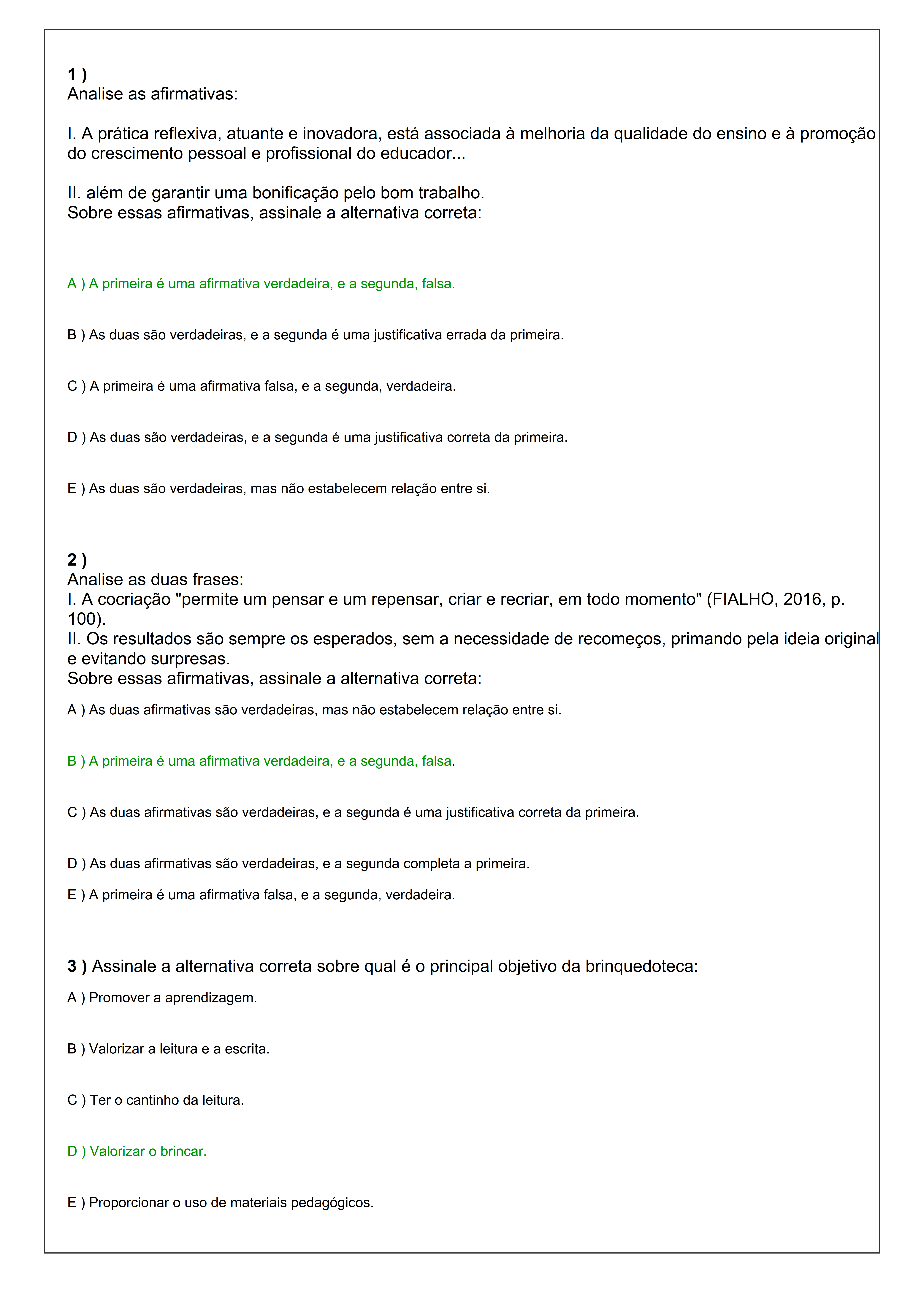 1) Analise as afirmativas: I. A prática reflexiva, atuante e inovadora, está associada à melhoria da qualidade do ensino e à promoção do crescimento pessoal e profissional do educador... II. além de garantir uma bonificação pelo bom trabalho. Sobre essas afirmativas, assinale a alternativa correta: A) A primeira é uma afirmativa verdadeira, e a segunda, falsa. B ) As duas são verdadeiras, e a segunda é uma justificativa errada da primeira C ) A primeira é uma afirmativa falsa, e a segunda, verdadeira. D As duas são verdadeiras, e a segunda é uma justificativa correta da primeira. E) As duas são verdadeiras, mas não estabelecem relação entre si. 2) Analise as duas frases: I. A cocriação "permite um pensar e um repensar, criar e recriar, em todo momento" (FIALHO, 2016, p. 100). II. Os resultados são sempre os esperados, sem a necessidade de recomeços, primando pela ideia original e evitando surpresas. Sobre essas afirmativas, assinale a alternativa correta: A) As duas afirmativas são verdadeiras, mas não estabelecem relação entre si. A primeira é uma afirmativa verdadeira, e a segunda, falsa. C ) As duas afirmativas são verdadeiras, e a segunda é uma justificativa correta da primeira. ) As duas afirmativas são verdadeiras, e a segunda completa a primeira. E) A primeira é uma afirmativa falsa, e a segunda, verdadeira. 3) Assinale a alternativa correta sobre qual é o principal objetivo da brinquedoteca: A Promover a aprendizagem. B) Valorizar a leitura e a escrita. C ) Ter o cantinho da leitura. D ) Valorizar o brincar. E) Proporcionar o uso de materiais pedagógicos.