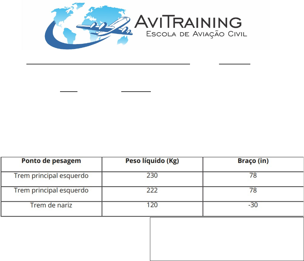 ALUNO: ___________ TURMA: _______ DATA: ____/_____ /_____ NOTA: ________ AV1 – PESO E BALANCEAMENTO 1) Após realizar o procedimento de pesagem da aeronave, a tabela abaixo foi montada. Com base nos dados da tabela, determine a posição do centro de gravidade da aeronave com relação ao plano de referência. IN = POLEGADAS CG = MOMENTO TOTAL : PESO TOTAL MOMENTO = PESO X BRAÇO A) Aproximadamente 55,34 in B) Aproximadamente 67,93 in C) Aproximadamente 81,24 in. D) Aproximadamente 24,24 in. 2) Quando todos os braços relacionados ao PR (DATUM) forem positivos, onde estará localizado esse PR? A) no bordo de ataque B) em uma posição mais traseira C) no nariz ou adiante dele D) em nenhuma posição 3) Os limites do passeio do CG operacional __________________ . A) representam porcentagem (%) da CAM ou distância em polegadas da linha DATAM B) representam porcentagem (%) do braço, podendo ser positivo ou negativo C) representam porcentagem (%) da FS (Fuselage Station) D) representam porcentagem (%) do Momento 4) O ___________ é o ponto de intersecção formado pelos três eixos imaginários do avião. A) centro de pressão B) campo de gravidade C) centro de gravidade D) corda média aerodinâmica 5) Um carregamento inadequado reduz a eficiência da aeronave com respeito a: A) quantidade de carga, limite de passageiros e perda de espaço B) tempo ruim e manobras em temporais C) teto, manobrabilidade, razão de subida, velocidade e consumo de combustível D) pouso em pista molhada e decolagem com chuva. 6) A finalidade principal e secundária do controle de peso e balanceamento, respectivamente é? A) economia e segurança B) eficiência e economia C) segurança e eficiência D) segurança e estabilidade 7) Como é denominada a variação permissível entre os limites máximo e mínimo do CG? A) deslocamento do CG B) passeio do CG C) trabalho do CG D) distorção do CG 8) O braço é a distância horizontal entre o plano de referência (Datum) e a estação de interesse. Pode ser precedido do sinal (+) ou (-), respectivamente, quando: A) Sua posição for para atrás do plano de referência e adiante do plano de referência B) Sua posição for adiante do plano de referência e para atrás do plano de referencia C) Sua posição for exatamente em cima do plano de referencia D) Sua posição for à esquerda do plano de referencia 9) Um peso de 75 libras localizado para atrás do plano de referência tem um braço de 40 polegadas. Isto significa que o Momento será igual a ___________. A) – 3000 lbs.pol B) 3000 lbs.pol C) -3000 lbs D) 3000 pol 10) Subtraindo do peso _____________ do peso ________, obtemos a __________ da aeronave: A) total, mínimo, tolerância B) máximo, vazio, carga útil C) calculado, estrutural, carga inútil D) de trabalho, de estocagem, carga útil 11) Um equipamento localizado na mesma posição do plano de referência (PR) tem o braço igual: A) a distância do equipamento ao C.G B) zero C) ao braço da C.G D) ao braço da aeronave 12) Em quais situações se faz necessário refazer a pesagem de uma aeronave: A) Toda vez que for carregada e quando for para a revisão B) Quando for para revisão e quando atingir 1000 horas de voo C) Quando acumular muita sujeira, graxa, etc. em lugares poucos acessíveis e depois de grandes reparos D) Depois de grandes reparos e depois de inspeções 13) A CMA de uma aeronave começa na estação 620 e termina na estação 780. A estação do CG é a 677,6 e seus limites dianteiro e traseiro são respectivamente, 10 % e 35 % da CMA, respectivamente. Conclui-se que: A) O CG está á frente do limite dianteiro B) O CG está atrás do limite traseiro C) O CG está dentro dos limites operacionais D) O limite traseiro do CG é a estação 620 14) É recomendado o uso de lastro quando se quer____________ . A) que a aeronave não voe muito leve B) ultrapassar o peso máximo C) obter o balanceamento do CG desejado D) para trazer o CG a uma posição mais à frente 15) O peso vazio de uma aeronave inclui: A) Aeronave limpa sem sujeira. B) Aeronave sem combustível. C) Todos os equipamentos operacionais que possuem localização fixa e, que estejam ou não instalados na aeronave. D) Todos os equipamentos operacionais que possuem localização fixa e, que estejam realmente instalados na aeronave. 16) Os regulamentos aerodinâmicos não são aplicáveis, em se tratando de Peso e Balanceamento, a que tipo de aeronave? A) táxi aéreo B) empresas de transportes de cargas C) aeronaves privadas D) somente para helicópteros da FAB 17) O controle de Peso e Balanceamento de uma aeronave é matematicamente comprovado através de cálculo para estabelecer se os limites de carregamento estão corretos. Se instalarmos ou removermos qualquer equipamento de uma aeronave, poderemos estar alterando: A) o seu peso vazio e o CG da aeronave B) alternando o consumo de combustível C) alterando a razão de subida da aeronave D) alterando a velocidade de cruzeiro da aeronave 18) Calcular a STA (estação) do CG de acordo com os dados abaixo: Início CMA – STA 300 Fim CMA – STA 400 CG = 25% da CMA A) 300 B) 400 C) 325 D) 125 19) No planejamento de um voo, é importante que, além do peso máximo permitido para o avião, sejam também respeitados os limites de centragem, isto é, a manutenção do CG dentro dos limites máximos permitidos. Esses limites são normalmente fornecidos em termos de percentuais da corda média aerodinâmica da asa, mas qualquer outro ponto de referência pode ser utilizado. Considere que você vai fazer um voo num pequeno avião e necessita saber se o peso e o CG estão dentro dos limites de tolerância. Dados: I. peso máximo permitido do avião: 1.540 kg II. limites do CG em relação ao bordo de ataque da corda média aerodinâmica: entre 1,8 m e 2,01 m. Os pesos e as distâncias (braços) de cada item ao ponto de referência são dados na tabela Escolha a opção correta. O CG está: A) quase no limite máximo dianteiro, port