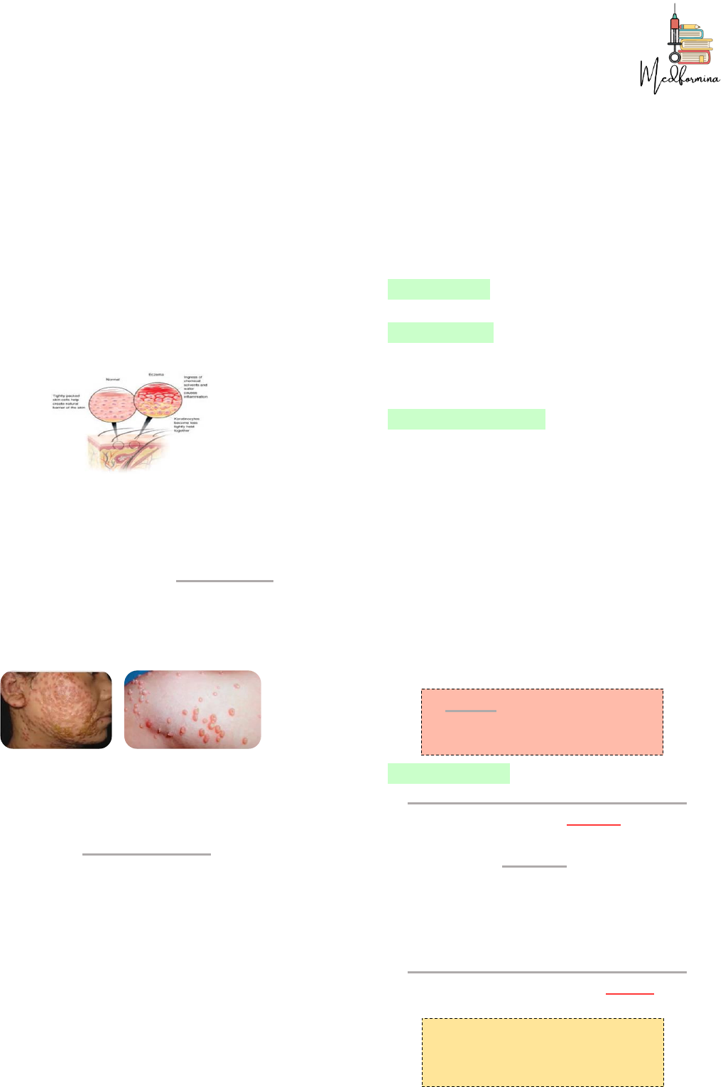 [Eczema atópico[ DEFINIÇÃO: Presença de queratinócitos frouxos e tecido inflamado. A dermatite atópica, frequentemente está associada à asma e/ou rinite alérgica e eventualmente a urticária. − Cerca de 30% possuem asma ou rinite e 15% surtos de urticária. − Quando presente as 3 patologias = MARCHA ATÓPICA. Caracteriza-se por períodos de crises e de acalmia. Presença de elevação de IgE e eosinófilos (eosinofilia), redução de IgA e da resposta celular, com isso, há um maior risco de infecções bacterianas ou outras. Em geral acomete CRIANÇAS > 3 MESES (atópica (episódios, gravidade, localização e frequência), nos adultos é importante buscar a interferência dos fatores ocupacionais. TRATAMENTO: − CUIDADOS GERAIS: Evitar banhos muito quentes ou muito frios e de longa duração (entre 3-5 minutos), hidratação e lubrificação. ↪ VESTUÁRIO: Evitar o uso de roupas sintéticas, pois impedem que o suor seja eliminado de forma adequada, evitar o uso de sabões com cheiro para a lavagem das roupas ↪ Manter as unhas sempre cortadas; ↪ O ambiente não deve ter cheiro ou poeira, devido a provável associação com a atopia respiratória. ↪ ALIMENTOS: Alguns alimentos podem interferir na doença atópica, como o leite, ovos, trigo, crustáceos. − MEDICAMENTOS TÓPICOS: Formas mais leves com poucas lesões. 1. CORTICOIDES: Regula de acordo com a área que será aplicada. 2. IMUNOMODULARES: Crises mais frequentes, medicamento usado para poupar o uso de corticoides. * Tacrolimus (usado a partir de 2 anos) 3. ANTIBIÓTICOS: Colonização do S. aureus 4. HIDRATAÇÃO: Hidratantes sem conservantes, parabenos e cheiro. − MEDICAMENTOS SISTÊMICOS: Como uso eletivo é utilizado os anti-histamínicos para evitar o prurido. ↪ Corticoide oral (prednisona 1-2 mg/Kg/dia) em casos mais graves. ↪ Antibióticos ↪ IMUNOMODULADORES SISTÊMICOS: Casos mais graves. ↪ FOTOTERAPIA: UVB narrow+ band − DERMATITE ATÓPICA SEVERA: A droga de escolha é a ciclosporina, mas pode ser utilizado o metotrexato. − PACIENTES COM CRISES FREQUENTES: Recomenda-se a psicoterapia. − HOSPITALIZAÇÃO: Casos graves e disseminados. − PROBIÓTICOS: Acredita-se que a barreira cutânea também está alterada no TGI. − DUPILUMABE: É um anticorpo monoclonal humanizado, utilizado nos casos graves (podendo substituir a ciclosporina), que bloqueia as IL 4 e IL 13 (relacionada ao prurido). [Eczema de contato[ É uma dermatose causada por substâncias do meio ambiente entrando em contato com a pele. ECZEMA DE CONTATO POR IRRITANTE PRIMÁRIO (DCIP): Mais comum, sendo responsável por > 60% das doenças ocupacionais. − O irritante (substância), provoca diretamente uma lesão na pele (inflamação). ↪ O responsável é a substância e não o indivíduo. ↪ Ocorre apenas no local da exposição. − A resposta imune é inata, ou seja, não há sensibilização prévia = LESÃO OCORRE NO PRIMEIRO CONTATO. Dano tecidual pela exposição a agentes cáusticos, em que a pele do indivíduo fica intolerante ao produto. − Não existe mecanismo imunológico. − Os irritantes são absolutos (em apenas um contato, a substância causa irritação) e relativos (produtos de limpeza). − DCPI ABSOLUTO: Pode apresentar-se com eritema, rachadura, descamação, bolhas, exulceração, aspecto de cronicidade. ↪ A dermatite de mãos inicia nas polpas digitais e eminencias palmares, causando xerodermia, fissura e descamação. − DERMATITE DAS FRALDAS: A urina e as fezes, funcionam como irritantes relativos. ↪ IRRITAÇÃO EM W: Poupa as dobras. ↪ As lesões possuem diagnóstico diferencial com cândida e dermatite seborreica. ↪ Clinicamente há eritema intenso, pápulas, vesículas, descamação e até exulceração nas formas mais graves. − TRATAMENTO: Emolientes e corticoide tópico. ECZEMA DE CONTATO ALÉRGICO: Possui uma reação imunológica tipo IV (reação tardia). − Sensibilidade apresentada à substância que entra em contato com a pele. − A lesão pode passar a área de contato (estender-se para outras áreas). DERMATITE DE MÃOS: Conhecida como mãos de lavadeira, ocorre por exposição prolongada a produtos de limpeza. − FASE AFERENTE: Substância nunca utilizada entra em contato com a pele, a qual é apresentada aos linfócitos através das células de langerhans ⇨ produção de linfócitos T de memória ⇨ disseminação pela pele. ↪ Fase que pode durar de 14-21 dias. ↪ Preparo da sensibilização. ↪ Além do contato contínuo, pode ser desencadeada por reação cruzada com substâncias de estruturas análogas = sulfas, derivados de procaína. − FASE ELICITAÇÃO: Ativação rápida da imunidade ao antígeno. ↪ Duração de 24-48 horas. − FASE DE RESOLUÇÃO: Resolução do processo inflamatório. ECZEMA DE CONTATO FOTOTÓXICO: Variante da dermatite por irritação quando a substância é exposta ao sol e em contato com a pele. − FITOFOTODERMATOSE: Causada por frutas cítricas, principalmente o limão. ECZEMA DE CONTATO FOTOALÉRGICO: Ocorre o mesmo mecanismo da DCA, mas a modificação da substância ocorre pelo sol. − Reação tipo IV na presença de radiação solar. − Em geral, ocorre em áreas expostas. − Pode ser causada por perfumes, anti-histamínicos tópicos, antimicóticos. DIAGNÓSTICO: História clínica (80% das dermatites de mãos são causadas por irritação), quadro clínico. − PATCH TEST: Teste de contato alérgico, deve ser feito fora das crises. ↪ Confirma o diagnóstico e investiga a etiologia. Possui uma S e E >85% e são utilizados 30 substâncias padrão (internacionais e nacionais). * Em casos de dúvidas são adicionadas mais substâncias. * Feito uma leitura ente 48 h e 96 h. * Não deve ser feito na fase aguda e nem após exposição solar intensa, devido ao eritema induzido. BOLHA: Reação mais forte − BIÓPSIA: Avaliação histopatológica (verificar a presença de eczema). TRATAMENTO: Evitar o contato, uso de 