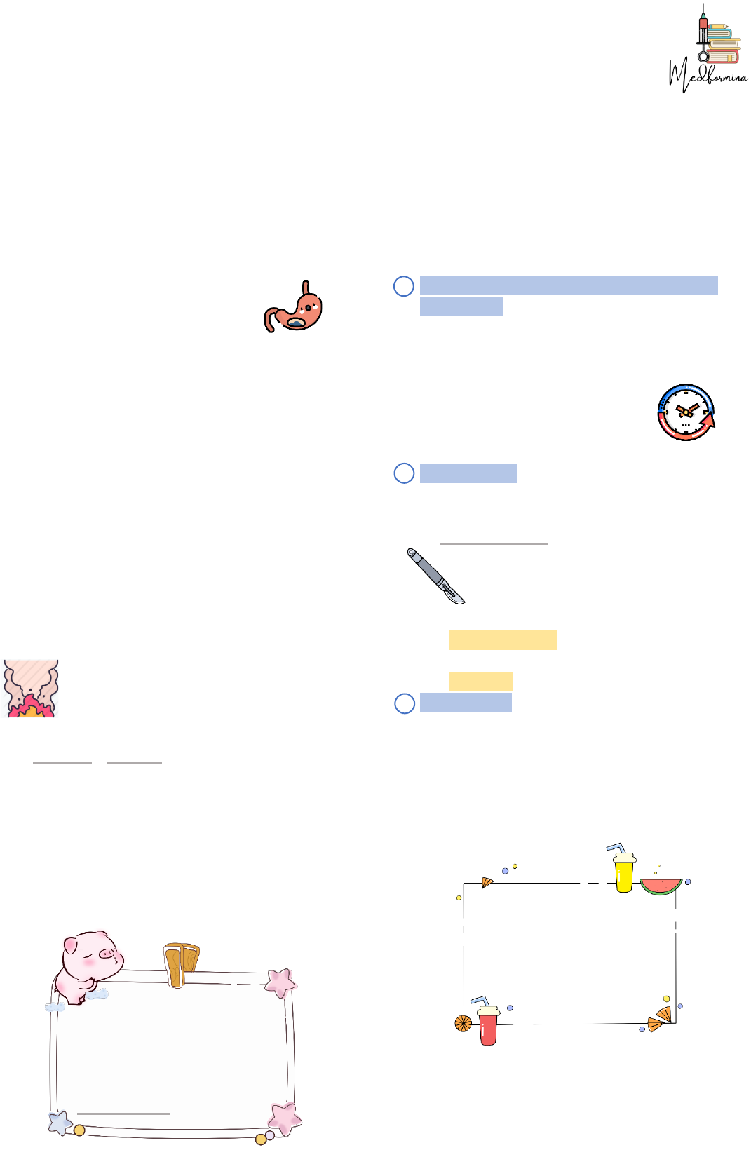 [Definição[ Retorno do conteúdo gástrico pelo esfíncter esofagiano inferior (EEI). O refluxo casual, é fisiológico com curta duração e que ocorre durante as refeições. REFLUXO INTERPRANDIAL RECORRENTE: Possui longa duração e origina sintomas como pirose e regurgitação. − Agressão à mucosa esofágica. DOENÇA DO REFLUXO GASTROESOFÁGICO: Doença crônica secundária ao refluxo de parte do conteúdo gástrico para esôfago ou órgãos adjacentes. − Presença de sinais e sintomas que podem ser acompanhados de lesões teciduais. [Epidemiologia[ Distúrbio mais comum do TGI alto. PIROSE: Queimação retroesternal ascendente, está presente em 20% da população. Pode surgir em qualquer faixa etária, mas a prevalência aumenta com a idade. Os sintomas são mais frequentes e intensos em pacientes com OBESIDADE e GESTAÇÃO. − Na gravidez ocorre o relaxamento do EEI promovido pela progesterona, em conjunto com o aumento da pressão IA pelo útero gravídico. ESOFAGITE EROSIVA: Fator de risco para adenocarcinoma de esôfago. − Em alguns casos a cicatrização ocorre por meio de metaplasia intestinal. [Patogênese[ CAUSAS: 1. RELAXAMENTO TRANSITÓRIO DO EEI, NÃO RELACIONADO A DEGLUTIÇÃO: Mecanismo mais comum da DRGE. Presente em pacientes sem esofagite ou com esofagite leve. ↪ Os relaxamentos são mediados pelo reflexo vagovagal anômalo, o qual é estimulado pela distensão gástrica. ↪ > 10 segundos de duração ↪ Não são seguidos de peristalse esofagiana eficaz. 2. HIPOTONIA DO EEI: Pressão média do EEI 50% após 1-2 semanas em uso de IBP. ENDOSCOPIA DIGESTIVA ALTA: Identificar as complicações da DRGE (esofagite, estenose péptica, esôfago de Barrett e adenocarcinoma). − Utilizado para diagnóstico diferencial. − ESOFAGITE DE REFLUXO: Presença de alterações inflamatórias na mucosa esofagiana. ↪ Possui importância clinica quando há presença de erosões, com pelo menos 3 mm de extensão. * Realizar biópsia da mucosa esofágica. ↪ CLASSIFICAÇÃO DE LOS ANGELES: Utilizada para estadiar a gravidade da esofagite. PHMETRIA DE 24 H: Método padrão-ouro para confirmação diagnóstica de DRGE (S e E > 90%). NÃO TEM SINTOMAS TÍPICOS? = Baixa probabilidade de DRGE DIAGNÓSTICO DIFERENCIAL: 1. Esofagite infeciosa (CMV, HSV, cândida); 2. Esofagite eosinofilica 3. Dispepsia não ulcerosa 4. Úlcera péptica gastroduodenal 5. Doença do trato biliar 6. Distúrbios motores do esôfago 7. Doenas coronariana A maioria dos pacientes sintomáticos apresentam EDA normal − O refluxo é detectado pela queda do pH intraesofágico 14,7. ESOFAGOMANOMETRIA: Não faz o diagnóstico de DRGE, mas auxilia no planejamento cirúrgico. − Esclarece o diagnóstico diferencial, identificando um distúrbio motor primário do esôfago. − Quantifica o número e a intensidade das ondas peristálticas e mede o tônus do EEI. ESOFAGOGRAFIA BARITADA: Imagens radiológicas que mostram a anatomia do esôfago. Sua principal função é caracterizar as hérnias de Hiato. [Complicações[ ESTENOSE PÉPTICA DO ESÔFAGO: Presente em 5% dos pacientes com esofagite erosiva pela intensa cicatrização fibrótica. − DISFAGIA POR OBSTRUÇÃO MECÂNICA: Predominante em sólidos, sendo a característica mais marcante. ↪ Aparece de forma insidiosa, precedida com pirose. − Os pacientes perdem pouco ou nenhum peso. − TRATAMENTO: Dilatação endoscópica por balão, até obter um diâmetro luminal de 13- 17 mm. ↪ As estenoses que são refeitas rapidamente, recebem injeção endoscópica de glicocorticoide (triancinolona). ↪ Pacientes fazem uso de IBP por um longo prazo. ↪ CIRURGIA ANTIRREFLUXO: Realizada quando há fibrose do 1/3 distal do esôfago, o qual está comprometendo o EEI. ÚLCERA ESOFÁGICA: São lesões mais profundas que alcançam a submucosa e a muscular. − Paciente com odinofagia e hemorragia digestiva oculta, evidenciado por uma anemia ferropriva. − Localizam-se em áreas de epitélio metaplásico. − DIAGNÓSTICO DIFERENCIAL: Síndrome de Zollinger-Ellison e úlceras induzidas por comprimidos. ASMA RELACIONADA À DRGE: O refluxo pode causar broncoespasmo, o DRGE pode exacerbar uma asma previamente existente. − Os agonistas beta-adrenérgicos, relaxam o EEI. − Na suspeita, indica-se pHmetria de 24h para estabelecer a correlação entre o refluxo e os sintomas respiratórios. Mas se já existirem sintomas típicos de DRGE, é feito o teste terapêutico com IBP em dose dobrada, 2x ao dia por 2-3 meses. − TRATAMENTO: Manutenção para o resto da vida com IBP na menor dose eficaz ou cirurgia antirrefluxo. − CRITÉRIOS DE MELHORA CLÍNICA: Melhora de pelo menos 20% no VEF1, redução na dose de corticoide inalatório superior a 20%. EPITÉLIO COLUNAR- ESÔFAGO DE BARRETT: É encontrado em 10-15% dos pacientes submetidos a EDA. Mais comum em homens brancos, aumentando sua prevalência com a idade até o pico entre 40-60 anos. − Pode estar presente 20 anos antes de ser reconhecida. − Obesidade é um fator de riscoe a maioria dos pacientes são oligo ou assintomáticos. − FATORES DE PROTEÇÃO: Consumo de vinho tinto, infecção crônica por H. pylori e raça negra. − DIAGNÓSTICO: Terço inferior com as “línguas” de coloração vermelho-salmão. A confirmação é feita pelo histopatológico com a presença de células caliciformes. − TRATAMENTO: A terapia intervencionista é realizada quando houver displasia na biópsia. ↪ Todos devem receber Inibidores de bomba de prótons. [Tratamento[ MEDIDAS ANTIRREFLUXO: São indicadas de maneira individualizada, conforme as queixas do paciente. TRATAMENTO FARMACOLÓGICO: − BLOQUEADORES H2: Bloqueia os receptores de H2 de histaminas nas células parietais gástricas, inibindo uma via de estímulo para secreção ácida. ↪ Não devem ser prescritos em casos de esofagite grave ou outras complicações como esôfago de barrett. − INIBIDORES DA BOMBA DE PRÓTONS: Inibem a H+/K+ATPase e assim bl