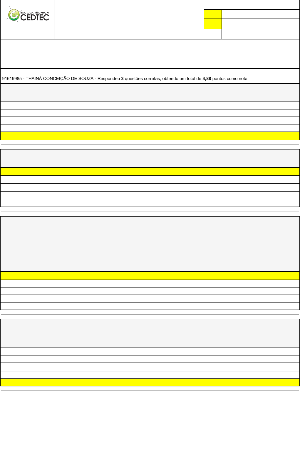 Pincel Atômico - 19/01/2025 11:38:25 1/1 THAINÁ CONCEIÇÃO DE SOUZA Exerc?cio Caminho do Conhecimento - Etapa 4 (25537) Atividade finalizada em 06/06/2024 18:57:22 (2097544 / 2) LEGENDA Resposta correta na questão # Resposta correta - Questão Anulada X Resposta selecionada pelo Aluno Disciplina: ELETRICIDADE [1113238] - Avaliação com 4 questões, com o peso total de 6,50 pontos [capítulos - 112] Turma: Curso Técnico: Eletrotécnica - Grupo: EAD - 06/24 - EAD ELE [124174] Aluno(a): 91619985 - THAINÁ CONCEIÇÃO DE SOUZA - Respondeu 3 questões corretas, obtendo um total de 4,88 pontos como nota [440_175140] Questão 001 Os elétrons se organizam e distribuem-se pelas camadas eletrônicas, estando uns mais próximos do núcleo e outros mais distantes. Qual o número máximo de camadas eletrônicas que um elemento químico pode ter? 9 5 6 8 X 7 [440_175139] Questão 002 O ferro é um elemento químico de número atômico 26. Na distribuição eletrônica do átomo de ferro no estado fundamental, qual o subnível mais energético e o subnível mais externo, respectivamente? X 3d6 e 4s2 3p6 e 4s2 4s2 e 4s2 3d6 e 3p6 4s1 e 4s3 [277_175135] Questão 003 A aceitação histórica da ideia de que a matéria é composta de átomos foi lenta e gradual. Na Grécia antiga, Leucipo e Demócrito são lembrados por terem introduzido o conceito de átomo, mas suas propostas foram rejeitadas por outros filósofos e caíram no esquecimento. No final do século XVIII e início do século XIX, quando as ideias de Lavoisier ganhavam aceitação generalizada, surgiu a primeira teoria atômica moderna, proposta por _______. Essa teoria postulava que os elementos eram constituídos de um único tipo de átomo, enquanto que as substâncias compostas eram combinações de diferentes átomos segundo proporções determinadas. Quase cem anos depois, estudos com raios catódicos levaram J. J. Thomson à descoberta do _______, uma partícula de massa muito pequena e carga elétrica _______, presente em todos os materiais conhecidos. Alguns anos depois, por meio de experimentos em que uma fina folha de ouro foi bombardeada com partículas alfa, Rutherford chegou à conclusão de que o átomo possui em seu centro um _______ pequeno, porém de massa considerável. As palavras que preenchem as lacunas correta e respectivamente estão reunidas em: X Dalton – elétron – negativa – núcleo Bohr – cátion – positiva – elétron Dalton – próton – positiva – núcleo Bohr – fóton – negativa – ânion Dalton – nêutron – neutra – próton [277_175133] Questão 004 Considere as seguintes afirmações a respeito do experimento de Rutherford e do modelo atômico de Rutherford-Bohr. I - A maior parte do volume do átomo é constituída pelo núcleo denso e positivo. II - Os elétrons movimentam-se em órbitas estacionárias ao redor do núcleo. III- O elétron, ao pular de uma órbita mais externa para uma mais interna, emite uma quantidade de energia bem definida. Quais estão CORRETAS? Apenas III Apenas I X I, II e III Apenas II Apenas II e III