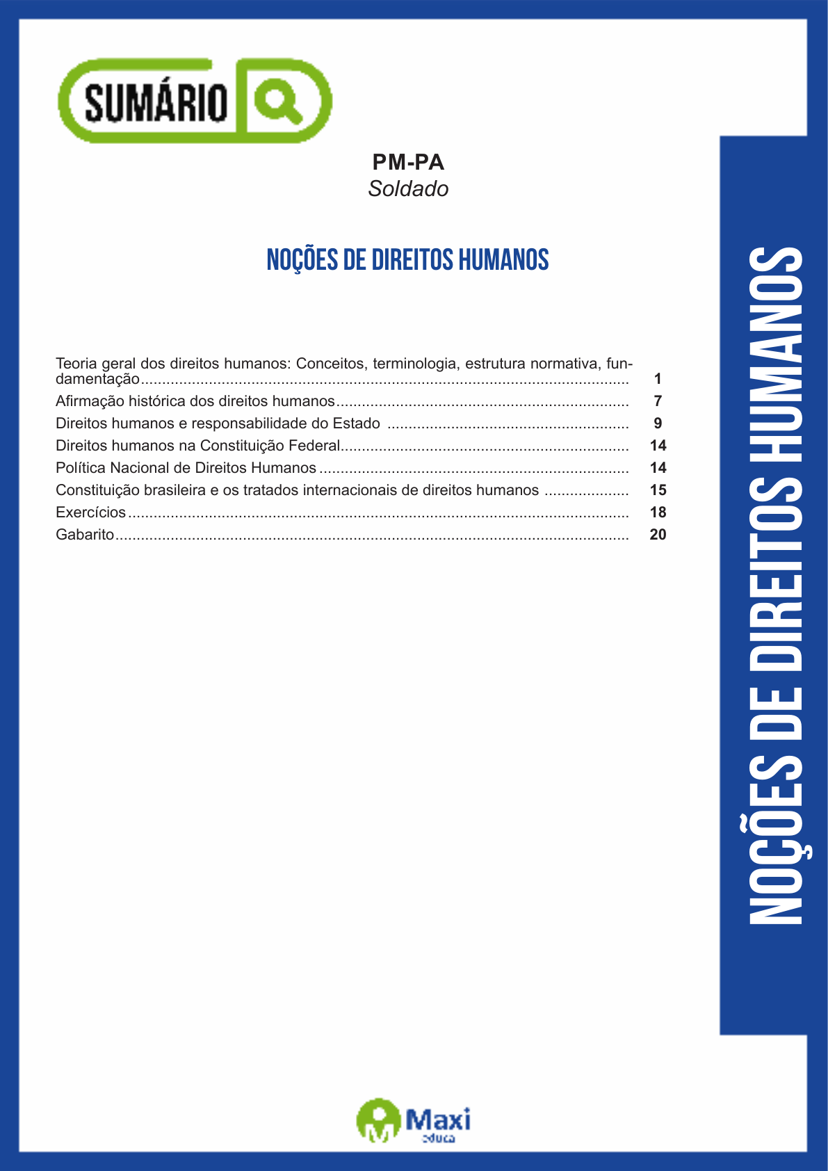 No çõ es d e D ir ei to s H um an os PM-PA Soldado Noções de Direitos Humanos Teoria geral dos direitos humanos: Conceitos, terminologia, estrutura normativa, fun- damentação ................................................................................................................... 1 Afirmação histórica dos direitos humanos ..................................................................... 7 Direitos humanos e responsabilidade do Estado ......................................................... 9 Direitos humanos na Constituição Federal.................................................................... 14 Política Nacional de Direitos Humanos ......................................................................... 14 Constituição brasileira e os tratados internacionais de direitos humanos .................... 15 Exercícios ...................................................................................................................... 18 Gabarito ......................................................................................................................... 20 Apostila gerada especialmente para: Eulália oliveira batista 084.617.114-75 1 Teoria geral dos direitos humanos: Conceitos, terminologia, estrutura normativa, fun- damentação Conceito O homem ao longo da história percorreu um longo caminho marcado por lutas, principalmente causadas pelo desejo de lucro e poder, visto que traz a herança da personalidade humana desde os primórdios dos tem- pos, de extinto animal. Para eliminar, ou pelo menos diminuir essa personalidade “não social” é indispensável a educação para “retirar o homem dos resquícios de sua condição primitiva”. Os direitos humanos surgiram como um dos fatores mais importantes para a convivência do homem em sociedade, refinando seu comportamento. A expressão direitos humanos representa o conjunto das atividades realizadas de maneira consciente, com o objetivo de assegurar ao homem a dignidade e evitar que passe por sofrimentos. A concepção contemporânea de direitos humanos, foi estabelecida internacionalmente nem 1948, pela Declaração Universal de Direitos Humanos, pouco tempo depois das crueldades cometidas pelos nazistas na Segunda Guerra Mundial. Referida declaração foi ratificada pela Declaração dos Direitos Humanos de Viena, em 1993, onde os direitos humanos e as liberdades fundamentais foram declarados direitos naturais de todos os seres humanos, bem como definiu que a proteção e promoção dos direitos humanos são responsabilidades primordiais dos Governos. Além disso, os direitos humanos são universais e indivisíveis, visando proteger os direitos a vida, a liberda- de, igualdade e segurança pessoal, o que leva ao respeito integral a dignidade humana. Os direitos humanos se orientam pelas seguintes expressões: - Direitos do homem: empregada aos direitos conexos ao natural, direito a vida. - Direitos humanos em sentido estrito: direitos conexos positivados em tratados e convenções interna- cionais - Direitos fundamentais: quando os tratados dos direitos humanos foram incorporados no ordenamento jurídico do Estado. A doutrina aponta certa distinção entre direitos humanos e direitos fundamentais, sustentando que direitos fundamentais são os direitos reconhecidos positivamente pela ordem constitucional. Direitos Humanos são a concretização das exigências de liberdade, igualdade e dignidade humana, as quais devem ser reconhecidas nos ordenamentos jurídicos nacionais e internacionais, em cada momento histórico. Desta forma, é possível notar que os direitos fundamentais são direitos humanos positivados no ordena- mento jurídico. Para que os direitos humanos sejam concretizados é necessário que o Estado cumpra seu dever de respei- tar a liberdade e autonomia do homem e, por outro lado, implementar ações aptas a proporcionar a dignidade humana. Em linhas gerais, direitos humanos são aqueles que pertencem à pessoa humana, independente- mente de leis, sendo considerados os principais: a vida, a liberdade, a igualdade e a segurança pesso- al. São direitos universais e indivisíveis. Terminologia Os direitos essenciais do indivíduo contam com ampla diversidade de termos e designações: direitos hu- manos, direitos fundamentais, direitos naturais, liberdades públicas, direitos do homem, direitos individuais, di- reitos públicos subjetivos, liberdades fundamentais. A terminologia varia tanto na doutrina quanto nos diplomas nacionais e internacionais. Apostila gerada especialmente para: Eulália oliveira batista 084.617.114-75 2 O ilustre doutrinador José Afonso da Silva explica que a ampliação e transformação dos direitos fundamen- tais do homem são as grandes responsáveis pela dificuldade para se obter um conceito sintético e preciso a respeito desta espécie, até porque os direitos humanos fundamentais, em sua concepção atualmente conheci- da, surgiram como produto da fusão de várias fontes, desde a conjugação de pensamentos filosófico-jurídicos até as ideias surgidas com o cristianismo e com o direito natural. Todavia, a melhor doutrina vem apontando para o fim da heterogeneidade, ambiguidade e ausência de consenso no tocante à esfera conceitual e terminológica, rechaçando a utilização, ao menos como termos ge- néricos, das expressões: liberdades públicas, direitos individuais e direitos subjetivos públicos. A expressão “direitos individuais”, por exemplo, mostra-se insuficiente para figurar como gênero dos direitos, pois, limita-se ao rol das liberdades e direitos civis. De igual modo, a expressão “direitos subjetivos públicos” denota o exercício do direito de acordo com a vontade do titular, o que fere as características de inalienabilidade e irrenunciabilidade típicas destes direitos. Contudo, ainda que estas expressões não sejam adequadas para abarcar todas as dimensões dos direitos objetos deste estudo, elas não se excl