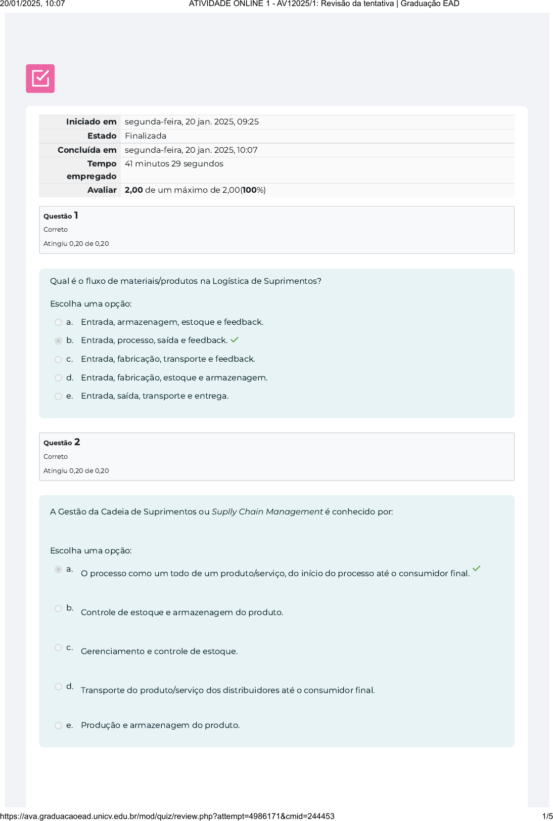 Iniciado em segunda-feira, 20 jan. 2025, 09:25 Estado Finalizada Concluída em segunda-feira, 20 jan. 2025, 10:07 Tempo empregado 41 minutos 29 segundos Avaliar 2,00 de um máximo de 2,00(100%) Questão 1 Correto Atingiu 0,20 de 0,20 Questão 2 Correto Atingiu 0,20 de 0,20 Qual é o �uxo de materiais/produtos na Logística de Suprimentos? Escolha uma opção: a. Entrada, armazenagem, estoque e feedback. b. Entrada, processo, saída e feedback. ✓ c. Entrada, fabricação, transporte e feedback. d. Entrada, fabricação, estoque e armazenagem. e. Entrada, saída, transporte e entrega. A Gestão da Cadeia de Suprimentos ou Suplly Chain Management é conhecido por: Escolha uma opção: a. O processo como um todo de um produto/serviço, do início do processo até o consumidor �nal. ✓ b. Controle de estoque e armazenagem do produto. c. Gerenciamento e controle de estoque. d. Transporte do produto/serviço dos distribuidores até o consumidor �nal. e. Produção e armazenagem do produto. 20/01/2025, 10:07 ATIVIDADE ONLINE 1 - AV12025/1: Revisão da tentativa | Graduação EAD https://ava.graduacaoead.unicv.edu.br/mod/quiz/review.php?attempt=4986171&cmid=244453 1/5 Questão 3 Correto Atingiu 0,20 de 0,20 Questão 4 Correto Atingiu 0,20 de 0,20 O termo Supply Chain é utilizado para descrever o complexo �uxo de materiais e informações que passam pela cadeia. Para que se tenha e�ciência na gestão da cadeia, é preciso: Escolha uma opção: a. Colaborar com fornecedores e clientes, compartilhando informações sobre demanda e estoques de seus produtos, componentes e matérias-primas. ✓ b. Melhorar, isoladamente, cada ponto da cadeia de suprimentos, de forma a maximizar a e�ciência de cada operação, garantindo a e�ciência global da cadeia de suprimentos. c. Estabelecer programas de lotes econômicos de compra e produção, para equilibrar os custos de transporte e armazenagem, responsáveis pelos principais custos que incidem na cadeia de suprimentos. d. Integrar verticalmente a produção, evitando a dependência de muitos fornecedores ao longo da cadeia. e. Implementar uma estratégia de especialização em suas principais competências, deixando a produção de componentes e subprodutos não essenciais para outros fornecedores. Quais são os benefícios de uma Cadeia de Suprimentos de acordo com os autores Ching, Ballou e Novaes? Escolha uma opção: a. Redução de Custos, possibilidade de oferecer fornecimento global e agregar valor ao cliente. ✓ b. Controle de estoques, redução de custos e informações compartilhadas. c. Redução de Custos, controle de estoques e armazenagem. d. Armazenagem, Redução de Custos e Estoque. e. Possibilidade de oferecer fornecimento global e armazenagem. 20/01/2025, 10:07 ATIVIDADE ONLINE 1 - AV12025/1: Revisão da tentativa | Graduação EAD https://ava.graduacaoead.unicv.edu.br/mod/quiz/review.php?attempt=4986171&cmid=244453 2/5 Questão 5 Correto Atingiu 0,20 de 0,20 Questão 6 Correto Atingiu 0,20 de 0,20 Qual alternativa conceitua de forma correta o termo Logística? Escolha uma opção: a. Logística é o processo de gerenciar o estoque de produtos, peça e matérias primas, em fase de acabamento através dos canais de marketing. b. Logística é o processo de gerenciar de forma estratégica a aquisição, movimentação e armazenagem dos materiais, peças e produtos acabados, através da organização e seus canais de marketing, maximizando os lucros. ✓ c. Logística é o processo que controla somente estoque e armazenagem dos produtos. d. Logística é uma parte do processo da cadeia de abastecimento que controla o �uxo de matérias primas até o produto acabado. e. Logística é o processo que gerencia estoque, peças e matérias primas em seus canais de marketing. Modal de alta �exibilidade, pois oferece o serviço porta a porta, porém com capacidade limitada de carga de acordo com a lotação do caminhão, recomendado para distâncias médias de 300 quilômetros. Apresenta custo elevado. Em geral atende todo o tipo de mercadorias: Escolha uma opção: a. Rodoviário. ✓ b. Aéreo. c. Dutoviário. d. Hidroviário. e. Ferroviário. 20/01/2025, 10:07 ATIVIDADE ONLINE 1 - AV12025/1: Revisão da tentativa | Graduação EAD https://ava.graduacaoead.unicv.edu.br/mod/quiz/review.php?attempt=4986171&cmid=244453 3/5 Questão 7 Correto Atingiu 0,20 de 0,20 Questão 8 Correto Atingiu 0,20 de 0,20 Pode-se a�rmar sobre Logística e Cadeia de Suprimentos: Escolha uma opção: a. Logística é uma das áreas da cadeia de suprimentos e compreende atividades como armazenagem e distribuição de produtos e materiais. ✓ b. Logística e Cadeia de Suprimentos são atividades distintas e não tem relação no processo de produção. c. Na cadeia de suprimentos, os parceiros atuam de forma estratégica buscando apenas a redução de custos. d. Cadeia de suprimentos é uma das áreas que responde somente área de compras e serviços aos clientes. e. Logística e Cadeia de Suprimentos são áreas que buscam somente a entrega do produto perfeito. Quais são os benefícios na implantação da gestão de Suprimentos? Escolha uma opção: a. Departamentos com trabalhos individuais e �exibilidade. b. Relacionamento com fornecedores e gerenciamento de processos. c. Relacionamento com fornecedores e qualidade de produtos. d. Departamentos com trabalhos individuais, qualidade de produto e redução de tempo. e. Combinação de atividades, integração e �exibilidade. ✓ 20/01/2025, 10:07 ATIVIDADE ONLINE 1 - AV12025/1: Revisão da tentativa | Graduação EAD https://ava.graduacaoead.unicv.edu.br/mod/quiz/review.php?attempt=4986171&cmid=244453 4/5 Questão 9 Correto Atingiu 0,20 de 0,20 Questão 10 Correto Atingiu 0,20 de 0,20 Quais são as quatro fases evolutivas da Logística? Escolha uma opção: a. Era da divisão do trabalho, era da diversi�cação do produto, era da redução de custos e era da variedade dos produtos. b. Era da