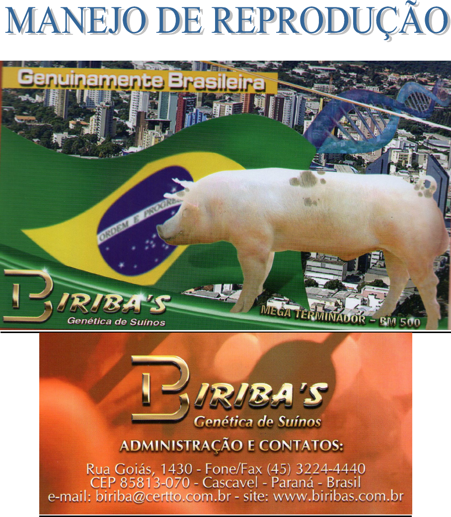 BIRIBA´S Genética de Suínos BIRIBA´S Genética de Suínos 1 MANEJO DE REPRODUÇÃO MANEJO E PREPARAÇÃO DE MARRÃS: Puberdade: A puberdade da fêmea suína é caracterizada pelo primeiro cio fértil, que poderá ocorrer entre 165 a 169 dias de idade, podendo ter variações devido a fatores ambientais, sanidade, genótipo, nutrição, etc. INDICAÇÃO 1: A fêmea suína apresenta esta comodidade reprodutiva, é um animal poliéstrico não estacional, ou seja, o estro se apresenta a cada 21 dias (18 – 23 dias) sem interferência da estação do ano. Os ciclos começam na puberdade e continuam durante toda sua vida, sendo somente interrompidos pela gestação e lactação. Para estimular a puberdade, aconselha-se usar um macho a partir dos 150 dias de idade da fêmea. Esta estimulação é feita colocando-se diariamente um macho dentro da baia com as marrãs por cerca de 10 a 15 minutos duas vezes ao dia. Para estimulo do cio é importante um macho maduro de alto libido (apetite sexual) e não muito pesado. O macho com estas características possui maior liberação de feromônio e por isso facilita a indicação do cio. O macho utilizado para este trabalho não deve ficar alojado em local que permita contato constante com as marrãs, ou mesmo em local em que as marrãs sintam freqüentemente sua presença e seu cheiro. O ideal é que esteja em uma instalação separada. Marrãs que não apresentam cio junto com as demais do grupo, devem ser reagrupadas para que depois recebam novos estímulos. CARACTERISTICAS DOS MACHOS (Rufiões): - Dominância hierárquica sobre as fêmeas; - Salivação com liberação de feromônios; - Freqüência de urina em pequenas quantidades; - Que pare diante das fêmeas durante o manejo; - Respeitar e ser obediente às indicações do operador; - Não ter problemas de casco e articulações; REQUISITOS MÍNIMOS PARA MARRÃS À 1ª COBERTURA: Cio Terceiro ou quarto Idade 210 a 230 dias Peso 130 a 150g Espessura do toucinho 16 a 18mm INDICAÇÃO DE CIO NAS MARRÃS: A exposição física do macho de boa libido constitui-se na melhor forma de induzir uma expressão de cio satisfatório. O contato, “focinho a focinho” entre machos e fêmeas é a melhor maneira de estimular o cio. COMO FAZER? - Fazer ficha de cada baia com a identificação das marrãs e datas do cio. - Fazer detecção de cio duas vezes ao dia com intervalos de 12 horas. - Faça pressão com as mãos na parte dorsal da fêmea, quando na presença do macho. Também massageie as fêmeas e a linha dos tetos. BIRIBA´S Genética de Suínos 2 SINAIS DE CIO : � Orelhas levantadas � Perda de apetite � Se deixa montar por outros machos � Emissão de grunhidos � Nervosismo geral � Reflexo de tolerância ao macho � Lombo erguido � Tremores � Olhar brilhante � Cauda levantada e balançando para cima e para baixo � Descarga vulvar de muco claro � Vulva com coloração avermelhada e levemente inchada � Resposta positiva ao teste de pressão na parte dorsal � Duração média de um à dois dias para leitoas, e de dois a três para porcas MONTA NATURAL: - Realize três montas por cio da fêmea. - Transporte as fêmeas com calma. O stress pode provocar perdas embrionárias. A ovulação ocorre de 32 a 36 horas depois do começo do estro, adiantando-se 2 – 3 horas nas fêmeas mulíparas. A ovulação dura umas 6 horas e o tempo de sobrevivência dos óvulos dentro do útero é de 8 a 12 horas. O tempo de sobrevivência do espermatozóide de uma monta natural é de 24 a 32 horas, e dos espermatozóides já diluídos para IA é de 12 a 14 horas. Os espermatozóides demoram 2 horas par passar do colo uterino ate o oviduto, e necessitam de 5 a 6 horas para concluir. O momento mais adequado para a monta é de 26 a 28 horas após o inicio do cio. MOMENTO DA MONTA OU INSEMINAÇÃO ARTIFICIAL: 1) Se a fêmea apresentar desmame-cio em até 4 dias após o desmame o esquema é esse: a) Primeira monta ou IA – 12 horas após o inicio do cio. b) Segunda monta ou IA – 36 horas após o inicio do cio. c) Terceira monta ou IA – 48 horas após o inicio do cio. 2) Se a fêmea apresentar intervalo desmame-cio de 5 a 6 dias o esquema passa a ser: a) Primeira monta ou IA – 12 horas após o inicio do cio. b) Segunda monta ou IA – 24 horas após o inicio do cio. c) Terceira monta ou IA – 36 horas após o inicio do cio. 3) Se a fêmea apresentar intervalo desmame-cio sete dias ou mais o esquema é esse: a) Primeira monta ou IA – 0 a 12 horas após o inicio do cio. b) Segunda monta ou IA – 24 horas após o inicio do cio. c) Terceira monta ou IA – 36 horas após o inicio do cio. 4) Em marrãs (leitoa), o esquema recomendado é: a) Primeira monta ou IA – no máximo 0-12 horas após o inicio do cio. b) Segunda monta ou IA – 24 horas após o inicio do cio. c) Terceira monta ou IA – 36 horas após o inicio do cio. CUIDADOS COM O MACHO: Verifique rotineiramente a condição do aparelho locomotor. A utilização de cama é indicada para proteção de articulações e casco. Evitar pisos com excesso de umidade, irregular, escorregadio ou muito abrasivo. Machos com problemas de locomoção, apresentarão dificuldades na monta e uma pior qualidade de sêmen. BIRIBA´S Genética de Suínos 3 Tanto para inseminação artificial como monta natural a temperatura ambiente ideal para os cachaços é entre 18 a 22ºC, e umidade relativa de 70%. Temperaturas superiores a 25ºC e altas variações (superior a 6ºC), podem comprometer a qualidade do sêmen criando problemas de baixa fertilidade e prolificidade. A pessoa que trabalha com os machos deve ser paciente, cuidadosa e motivada, gosta do que faz, ter carinho pelos animais e deve ser constantemente treinada. TREINAMENTO DOS MACHOS PARA MONTA NATURAL: Efetue as coberturas na própria baia do macho. Ate 240 dias realize uma monta por semana. A partir dos 240 dias estes machos estão liberados para exercer no máximo duas montas por semana at