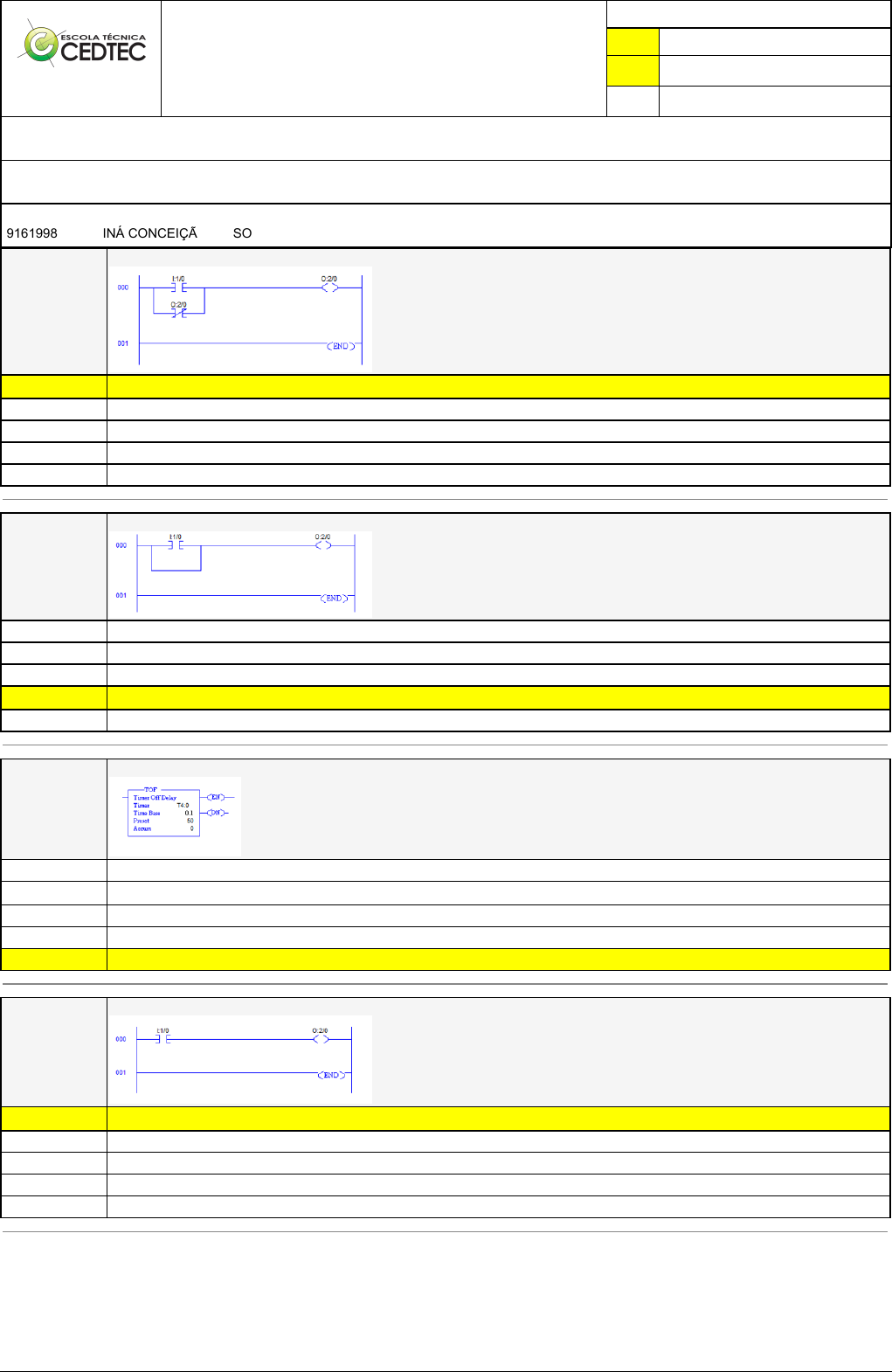 Pincel Atômico - 20/01/2025 18:38:34 1/1 THAINÁ CONCEIÇÃO DE SOUZA Exercício Caminho do Conhecimento - Etapa 12 (21123) Atividade finalizada em 23/07/2024 20:27:22 (2164744 / 2) LEGENDA Resposta correta na questão # Resposta correta - Questão Anulada X Resposta selecionada pelo Aluno Disciplina: CONTROLADOR LÓGICO PROGRAMÁVEL [1113246] - Avaliação com 4 questões, com o peso total de 13,00 pontos [capítulos - 113] Turma: Curso Técnico: Eletrotécnica - Grupo: EAD - 06/24 - EAD ELE [124174] Aluno(a): 91619985 - THAINÁ CONCEIÇÃO DE SOUZA - Respondeu 3 questões corretas, obtendo um total de 9,75 pontos como nota [350096_127504] Questão 001 Dado o Ladder abaixo, qual opção corresponde mais fielmente ao comportamento do circuito abaixo? X Independente do botão, quando a entrada vinculada a I:1/0 for energizada a saída O:2/0 será energizada. Se for acionado o botão que está sob o endereço I:1/0 a saída O:2/0 desenergizará. Quando O:2/0 for energizada, ela se manterá energizada. Se for acionado o botão que está sob o endereço I:1/0 a saída O:2/0 energizará. Independente do botão, quando a entrada vinculada a I:1/0 for energizada a saída O:2/0 será desenergizada. [350097_127501] Questão 002 Dado o Ladder abaixo, qual opção corresponde mais fielmente ao comportamento do circuito abaixo? Independentemente da entrada I:1/0 a saída O:2/0 sempre estará desenergizada. Quando a entrada de I:1/0 for desenergizada, a saída O:2/0 estará energizada. Quando a entrada de I:1/0 for energizada, a saída O:2/0 estará desenergizada. X Independentemente da entrada I:1/0 a saída O:2/0 sempre estará energizada. Quando a entrada de I:1/0 for energizada, a saída O:2/0 estará energizada. [350096_127520] Questão 003 Dado o temporizador a seguir, quando sua entrada EN for energizada, quanto tempo ele demorará para que a saída DN energize? 50 segundos X 1 segundos 0 segundos Ele nunca energizará DN 5 segundos [350096_127499] Questão 004 Dado o Ladder abaixo, qual opção corresponde mais fielmente ao comportamento do circuito abaixo? X Independente do botão, quando a entrada vinculada a I:1/0 for energizada a saída O:2/0 será energizada. Se for acionado o botão que está sob o endereço I:1/0 a saída O:2/0 energizará. Independente do botão, quando a entrada vinculada a I:1/0 for energizada a saída O:2/0 será desenergizada. Se for acionado o botão que está sob o endereço I:1/0 a saída O:2/0 desenergizará. Quando O:2/0 for energizada, ela se manterá energizada.