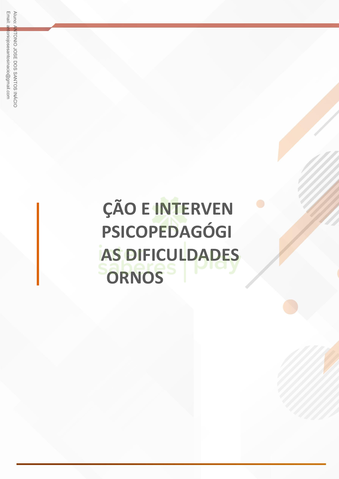 AULA 5 AVALIAÇÃO E INTERVENÇÃO NEUROPSICOPEDAGÓGICA NAS DIVERSAS DIFICULDADES E TRANSTORNOS Prof. ª Luciana Trad A luno: A N T O N IO JO S E D O S S A N T O S IN Á C IO E m ail: antoniojosesantosinacio@ gm ail.com 2 CONVERSA INICIAL Chegamos ao ponto da intervenção. Depois de realizado um cuidadoso processo de avaliação do indivíduo com dificuldades de aprendizagem, será delineado um plano de ação para realizar a intervenção. Nesse plano, o neuropsicopedagogo poderá direcionar seu trabalho para uma estimulação, um treino ou uma reabilitação cognitiva, além de dar orientações ao indivíduo, à família e à escola/instituição. Nesta aula, estudaremos os pontos importantes e as peculiaridades das propostas de intervenção. Tema 1 – Técnicas de intervenção cognitiva Tema 2 – Intervenções em estratégias de aprendizagem Tema 3 – Intervenção neuropsicopedagógica Tema 4 – Jogos educativos para estimulação cognitiva Tema 5 – Instrumentos para intervenção cognitiva CONTEXTUALIZANDO Um plano de intervenção deve ser traçado juntamente com o indivíduo, os familiares, a equipe técnica institucional e a equipe multiprofissional, com metas estabelecidas para início, meio e fim. Pode-se realizar reformulações quando necessárias, e readequar o planejamento futuro quando surgirem novas demandas no processo de intervenção. A escolha da técnica de intervenção dependerá da necessidade do indivíduo, podendo ser a da estimulação cognitiva, a do treino cognitivo ou a da reabilitação cognitiva. Outra escolha que se fará pertinente é a decisão sobre um planejamento individual ou coletivo. Aqui, apenas iniciamos os estudos sobre intervenção, assim como para avaliação neuropsicopedagógica, precisaremos de aprofundamento teórico, capacitação e habilidade para aplicação adequada das técnicas de intervenção, atentando sempre para as questões éticas. Com a finalidade de melhorar ou compensar déficits e dificuldades de aprendizagem, o neuropsicopedagogo poderá propor alternativas para a inclusão social do indivíduo com dificuldades. A luno: A N T O N IO JO S E D O S S A N T O S IN Á C IO E m ail: antoniojosesantosinacio@ gm ail.com 3 TEMA 1 – TÉCNICAS DE INTERVENÇÃO COGNITIVA Segundo Golino e Flores-Mendonza (2016), a literatura emprega terminologia diferenciada para descrever as técnicas de intervenção, sendo que os termos mais utilizados são: estimulação cognitiva, treino cognitivo e reabilitação cognitiva. Com base em estudos de literatura levantados pelas autoras sobre a classificação dos termos, ficou entendido que, embora os termos sejam usados como sinônimos, as intervenções diferem quanto às metodologias empregadas. Estimulação mental [cognitiva] ou brain training centra-se na realização repetida de tarefas padronizadas, geralmente no formato informatizado ou de jogos, quanto à ausência de uma situação de aprendizagem estruturada e direcionada. Tem como objetivo envolver o indivíduo em uma situação de esforço mental por meio da prática e repetição de tarefas. É uma ferramenta muito eficaz para intervenção com grupos clínicos. Treino cognitivo refere-se à prática guiada de um conjunto de tarefas padronizadas que refletem determinadas funções cognitivas, tais como raciocínio, atenção, memória, resolução de problemas, velocidade de processamento, dentre outros. O formato unimodal está voltado para o treino de uma habilidade específica e multimodal para o treino de várias habilidades cognitivas. Os estímulos podem ser do tipo “lápis e papel” ou computadorizados. Atividades da vida diária podem ser incluídas. O treino pode ser individual ou em grupo, ou ainda, pode ser facilitado por membros da família. Além das tarefas cognitivas, apresenta estratégias para otimização funcional mental. Reabilitação cognitiva destina-se a grupos clínicos e caracteriza-se tipicamente por envolver o paciente em uma gama de atividades gerais (incluindo a estimulação cognitiva) e discussões (comumente realizadas em grupos), visando à melhoria geral do funcionamento cotidiano, cognitivo e social. Para Gates et al. (2011, citado por Yassuda; Brum, 2015), os programas de estimulação cognitivas envolvem os indivíduos em atividades mentais complexas (como palavras cruzadas, exercícios de visuoconstrução, leitura e atividades diversas oferecidas por softwares ou videogames) e tendem a ser menos específicos. Diferentemente da estimulação, os treinos cognitivos têm A luno: A N T O N IO JO S E D O S S A N T O S IN Á C IO E m ail: antoniojosesantosinacio@ gm ail.com 4 como alvo as habilidades cognitivas específicas como memória episódica, e costumam a oferecer instrução em estratégias mnemônicas (tais como imagens mentais, categorização, associação face-nome). Os treinos cognitivos podem ser apresentados em diferentes formatos, variando em relação: 1. à modalidade de condução: sessões individuais ou coletivas; 2. a habilidades-alvo: intervenção multidomínio – delineada para estimular habilidades cognitivas de diferentes domínios – ou unimodal – quando as habilidades-alvo fazem parte de um mesmo domínio cognitivo; 3. ao formato dos estímulos: do tipo “lápis e papel” ou com tarefas computadorizadas; 4. às medidas cognitivas: que podem cobrir as habilidades-alvo da intervenção (aquelas que se pretende intervir) para investigar os efeitos de transferência proximal (near transfer), ou as habilidades não treinadas para investigar os efeitos de transferência distal (far transfer); 5. ao follow-up: exames de acompanhamento em longo prazo para verificar os efeitos de durabilidade temporal da intervenção (Molino, Flores- Mendonza, 2016). No que tange à reabilitação cognitiva, costuma ser usada para descrever as intervenções oferecidas a pacientes com danos cerebrais, tais como TCE, AVC, tumores, demências, entre outras. Para Wilson (1989