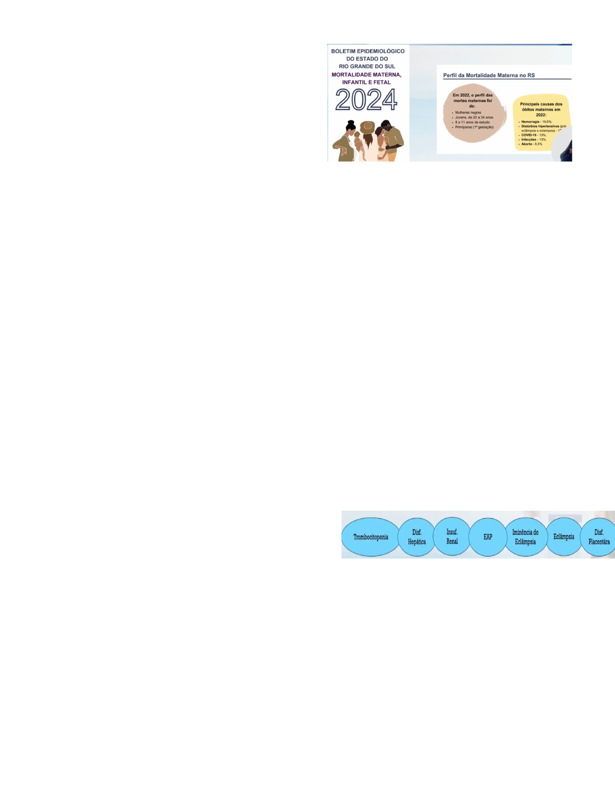 Doença hipertensiva na gestação Objetivos ● Compreender definição: critérios diagnósticos da pré -eclâmpsia. ● Reconhecer os fatores de risco e sinais clínicos ● Conhecer as complicações associadas ● Manejo e tratamento Pré eclâmpsia ● Doença do ciclo gravídico puerperal ● Síndrome multifatorial e multissistêmica ● Etiologia- desconhecida ● Fisiopatologia complexa e em esclarecimento ● Início desde a implantação do ovo - Manifestação clínica na segunda metade da gestação - Manifestação clínica variável - dependente do órgão alvo. Epidemiologia ● Hipertensão 10% das gestações no mundo ● Pre- eclampsia: - Mundo: 1,5-16,7% - BR: 7,5% ● Alta morbimortalidade materna e fetal - Mortalidade materna: 15-20% - No BR: ¼ das mortes maternas; Principal causa de prematuridade eletiva. ● Complicações cardiovasculares futuras na mãe e bebê Classificação e definição Classificação mais difundida ● Hipertensão arterial crônica - Hipertensão reportada pela gestante ou identificada antes das 20 semanas da gestação. ● Hipertensão gestacional - HAS em gestante previamente normotensa - Iniciada após 20 semanas e sem sinais de PE - Deve desaparecer até 12 semanas pós parto - Ficar atento a possibilidade de evolução desfavorável de casos inicialmente diagnosticados com hipertensão gestacional, até 25% desses pacientes apresentarão sinais e ou sintomas relacionados a PE , alterando portanto seu diagnóstico ● Pré-eclâmpsia - Hipertensão arterial identificada após 20 semana de gestação, associada a proteinúria ou disfunção de órgão-alvo ● Pré-eclâmpsia sobreposta à Hipertensão Arterial Crônica, estabelecida quando: - Após 20 semanas de gestação ocorre aparecimento ou piora da proteinúria já detectada na primeira metade da gravidez - Quando necessitam de incremento das doses terapêuticas iniciais ou associação de anti-hipertensivos - Na ocorrência de disfunção de órgãos-alvo ● Eclâmpsia - Ocorrência de crise convulsiva tônico-clônica generalizada em pacientes portadora de PE. ● Hipertensão arterial crônica sobreposta por P.E Recentemente Sociedade internacional de Estudo sobre hipertensão e gravidez admitiu ● Hipertensão do jaleco branco ● Hipertensão mascarada Diagnóstico Hipertensão arterial ● Medida seriada dos níveis pressóricos durante o pré natal ● PAS > 140 mmHg ou PAD > 90mmHg - Em duas medidas, considerando a segunda. Etiologia Permanece desconhecida, o que dificulta prevenção primária ● Em 1916, “doença das teorias” Invasão trofoblástica anormal ● A invasão trofoblástica e uma das principais teorias para explicar a pré-eclâmpsia. ● O trofoblasto é a camada externa do blastocisto, que se implanta no útero e forma a placenta. ● Em condições normais, o trofoblasto invade profundamente o endométrio, estabelecendo uma conexão vascular entre a mãe e o feto. ● Na pré-eclâmpsia, a invasão e o que impede a formação adequada da placenta podendo levar a uma serie de complicações. Disfunção endotelial ● Aumento da permeabilidade - proteinúria ● Vasoespasmo - hipertensão ● Distúrbios de coagulação - agregação Fisiopatologia Alterações/ repercussão Cerebrais ● Edema cerebral vasogênico - Cefaleia, diplopia, visão turva, escotomas e cegueira cortical . - Sd de encefalopatia posterior reversível (PRES) ● Convulsões eclampticas ● AVC - Principal causa de óbito materno na gestante hipertensa. Hematológicas ● Hemoconcentração progressiva - Extravasamento de plasma para o interstício (edema) ● Trombocitopenia - Agregação / deposição ● Hemólise/ CIVID Renais ● TFG diminuída em 30-40% ao nível não gravídicos - AUmento da creatinina, ureia e ácido úrico - Hipocalciuria (maior reabsorção tubular) - Proteinúria ● Alteração anatomopatológica - Endoteliose glomerular ● A intensidade da proteinúria se relaciona ao edema generalizado, mas não apresenta relação com a gravidade da doença. Hepáticas ● Dano tecidual pela isquemia ● Distensão da cápsula hepática (Glisson) - hematoma subescapular - Sintoma clássico de dor no QSD abd ● Lesão hepática comumente identificada - Necrose hemorrágica periportal Uteroplacentarias ● Circulação e reduzida (40-60%) -Infartos placentários , CIUR, DPP ● Atividade uterina aumentada com maior sensibilidade a ocitocina Fatores de risco Pré-eclâmpsia ● Precoce 34 semanas Biomarcadores para diagnóstico ● Dosagem de biomarcadores (produzidos pela placenta) podem auxiliar no diagnóstico e seguimento de casos suspeitos de P.E; ● Auxiliam no diagnóstico oportuno, pois seus níveis sanguíneos se alteram antes dos exames clássicos, além de ser fundamental em casos de diagnóstico diferencial como LES, HAS crônica e nefropatias. ● O uso baseia-se na fisiopatologia. • Razão sFLT-1/PLGF ● ≤38: excluir o diagnóstico por pelo menos duas semanas. (VPN >99%) ● >85/110 (≤34s/>34s): Chamar atenção para o diagnóstico. (S 88%, E 99,5%) ● >38 e 95 ● Bioquímico - Marcadores sanguíneos (sFlt-1; PIGF PAPP-A) Prevenção PE AAS ● AAS 100mg 1x/dia, à noite ● Pacientes tem indicação quando 1 critério maior ou 2 moderados ● Iniciar antes da 16a semana (antes da 2a onda) e interromper após 36a semana. ● Causa aumento da produção de prostaciclina e diminui a produção de tromboxano, além de diminuir a taxa de agregação plaquetária Cálcio: ● Revisão sistemática 2018: - Redução 55% risco PE - Efeito maior em mulheres com dieta pbre em calcio - 74% - Risco elevado para PE- 78% ● Carbonato de cálcio (1-2 g/dia) ou Citrato de cálcio (2-4 g/dia), em doses fracionadas. ● Iniciar a partir da 12a semana. Perda de peso: ● Estudos em pacientes que realizaram cirurgia bariátrica reduziram significativamente o risco de pré -eclâmpsia. Outro com mulheres com pré eclâmpsia constatou que a perda de pes