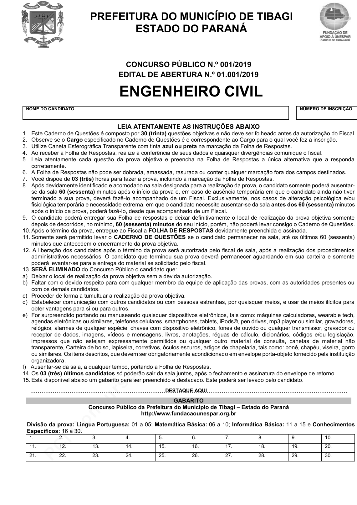 pcimarkpci MDAwMDowMDAwOjAwMDA6MDAwMDowMDAwOmZmZmY6YmFmOTpiNDVi:VGh1LCAyMyBKYW4gMjAyNSAxMDoxOTozMyAtMDMwMA== www.pciconcursos.com.br PREFEITURA DO MUNICÍPIO DE TIBAGI ESTADO DO PARANÁ CONCURSO PÚBLICO N.º 001/2019 EDITAL DE ABERTURA N.º 01.001/2019 ENGENHEIRO CIVIL NOME DO CANDIDATO NÚMERO DE INSCRIÇÃO LEIA ATENTAMENTE AS INSTRUÇÕES ABAIXO 1. Este Caderno de Questões é composto por 30 (trinta) questões objetivas e não deve ser folheado antes da autorização do Fiscal. 2. Observe se o Cargo especificado no Caderno de Questões é o correspondente ao Cargo para o qual você fez a inscrição. 3. Utilize Caneta Esferográfica Transparente com tinta azul ou preta na marcação da Folha de Respostas. 4. Ao receber a Folha de Respostas, realize a conferência de seus dados e quaisquer divergências comunique o fiscal. 5. Leia atentamente cada questão da prova objetiva e preencha na Folha de Respostas a única alternativa que a responda corretamente. 6. A Folha de Respostas não pode ser dobrada, amassada, rasurada ou conter qualquer marcação fora dos campos destinados. 7. Você dispõe de 03 (três) horas para fazer a prova, incluindo a marcação da Folha de Respostas. 8. Após devidamente identificado e acomodado na sala designada para a realização da prova, o candidato somente poderá ausentar- se da sala 60 (sessenta) minutos após o início da prova e, em caso de ausência temporária em que o candidato ainda não tiver terminado a sua prova, deverá fazê-lo acompanhado de um Fiscal. Exclusivamente, nos casos de alteração psicológica e/ou fisiológica temporária e necessidade extrema, em que o candidato necessite ausentar-se da sala antes dos 60 (sessenta) minutos após o início da prova, poderá fazê-lo, desde que acompanhado de um Fiscal. 9. O candidato poderá entregar sua Folha de respostas e deixar definitivamente o local de realização da prova objetiva somente depois de decorridos, no mínimo, 60 (sessenta) minutos do seu início, porém, não poderá levar consigo o Caderno de Questões. 10. Após o término da prova, entregue ao Fiscal a FOLHA DE RESPOSTAS devidamente preenchida e assinada. 11. Somente será permitido levar o CADERNO DE QUESTÕES se o candidato permanecer na sala, até os últimos 60 (sessenta) minutos que antecedem o encerramento da prova objetiva. 12. A liberação dos candidatos após o término da prova será autorizada pelo fiscal de sala, após a realização dos procedimentos administrativos necessários. O candidato que terminou sua prova deverá permanecer aguardando em sua carteira e somente poderá levantar-se para a entrega do material se solicitado pelo fiscal. 13. SERÁ ELIMINADO do Concurso Público o candidato que: a) Deixar o local de realização da prova objetiva sem a devida autorização. b) Faltar com o devido respeito para com qualquer membro da equipe de aplicação das provas, com as autoridades presentes ou com os demais candidatos. c) Proceder de forma a tumultuar a realização da prova objetiva. d) Estabelecer comunicação com outros candidatos ou com pessoas estranhas, por quaisquer meios, e usar de meios ilícitos para obter vantagens para si ou para outros. e) For surpreendido portando ou manuseando quaisquer dispositivos eletrônicos, tais como: máquinas calculadoras, wearable tech, agendas eletrônicas ou similares, telefones celulares, smartphones, tablets, iPods®, pen drives, mp3 player ou similar, gravadores, relógios, alarmes de qualquer espécie, chaves com dispositivo eletrônico, fones de ouvido ou qualquer transmissor, gravador ou receptor de dados, imagens, vídeos e mensagens, livros, anotações, réguas de cálculo, dicionários, códigos e/ou legislação, impressos que não estejam expressamente permitidos ou qualquer outro material de consulta, canetas de material não transparente, Carteira de bolso, lapiseira, corretivos, óculos escuros, artigos de chapelaria, tais como: boné, chapéu, viseira, gorro ou similares. Os itens descritos, que devem ser obrigatoriamente acondicionado em envelope porta-objeto fornecido pela instituição organizadora. f) Ausentar-se da sala, a qualquer tempo, portando a Folha de Respostas. 14. Os 03 (três) últimos candidatos só poderão sair da sala juntos, após o fechamento e assinatura do envelope de retorno. 15. Está disponível abaixo um gabarito para ser preenchido e destacado. Este poderá ser levado pelo candidato. ……………………………………………………………………………………………………………………………………………………. GABARITO Concurso Público da Prefeitura do Município de Tibagi – Estado do Paraná http://www.fundacaounespar.org.br Divisão da prova: Língua Portuguesa: 01 a 05; Matemática Básica: 06 a 10; Informática Básica: 11 a 15 e Conhecimentos Específicos: 16 a 30. 1. 2. 3. 4. 5. 6. 7. 8. 9. 10. 11. 12. 13. 14. 15. 16. 17. 18. 19. 20. 21. 22. 23. 24. 25. 26. 27. 28. 29. 30. DESTAQUE AQUI pcimarkpci MDAwMDowMDAwOjAwMDA6MDAwMDowMDAwOmZmZmY6YmFmOTpiNDVi:VGh1LCAyMyBKYW4gMjAyNSAxMDoxOTozMyAtMDMwMA== www.pciconcursos.com.br pcimarkpci MDAwMDowMDAwOjAwMDA6MDAwMDowMDAwOmZmZmY6YmFmOTpiNDVi:VGh1LCAyMyBKYW4gMjAyNSAxMDoxOTozMyAtMDMwMA== www.pciconcursos.com.br Cargo: ENGENHEIRO CIVIL Página -3- LÍNGUA PORTUGUESA QUESTÃO 01 Assinale a alternativa em que a regência do verbo destacado está de acordo com a norma-padrão escrita: (A) A apresentação da banda não agradou o público. (B) O médico assistiu o doente, com muito carinho. (C) Todos aspiraram ao ar poluído da cidade. (D) O atirador visou ao alvo cuidadosamente. QUESTÃO 02 Assinale a alternativa em que a pontuação está CORRETA: (A) O professor, disse: Se estudarem não terão dificuldades para resolver a prova. (B) O professor disse “Se estudarem não terão dificuldades para resolver a prova”. (C) O professor disse: “Se estudarem, não terão dificuldades para resolver a prova”. (D) O professor, dis