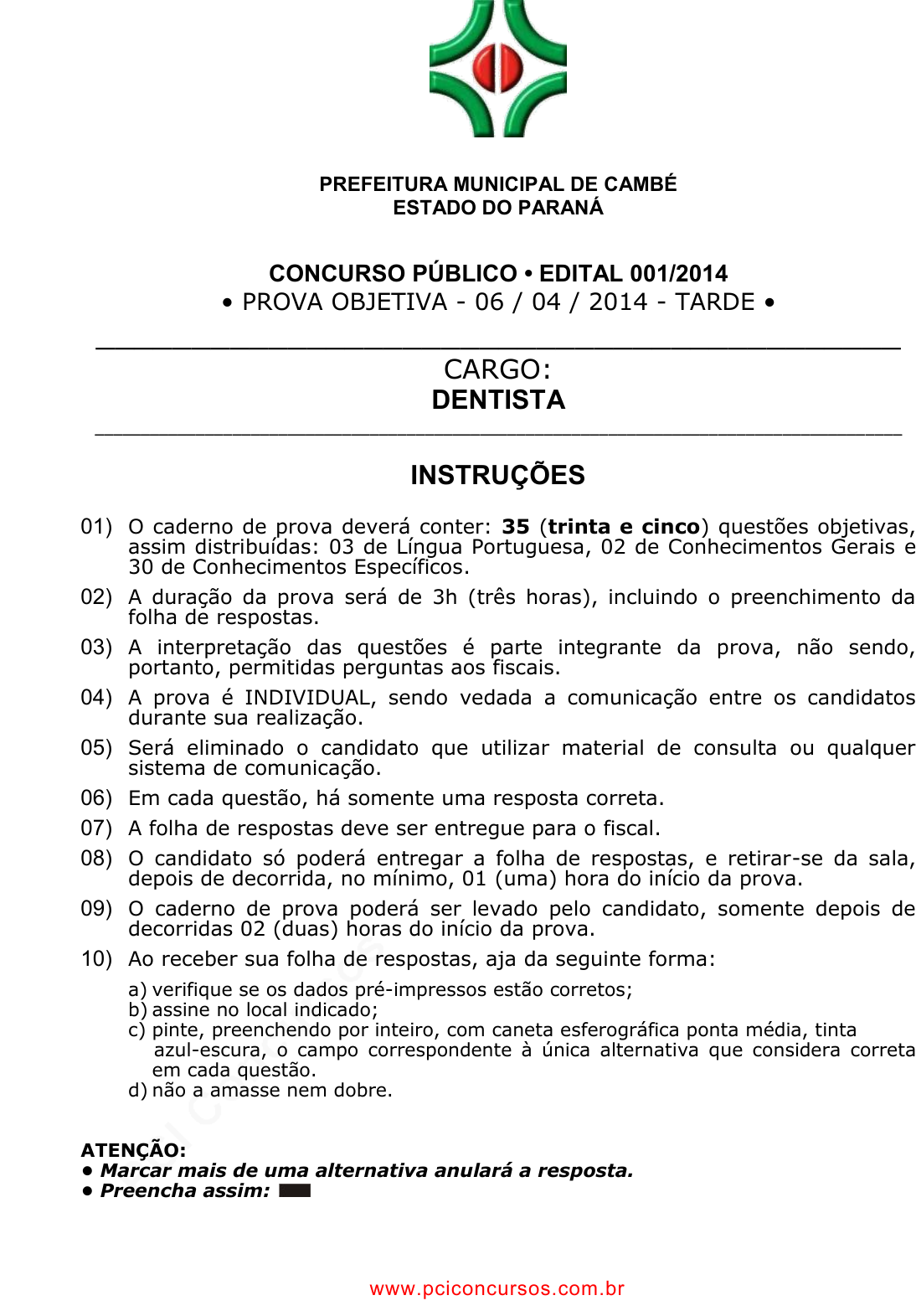 pcimarkpci MDAwMDowMDAwOjAwMDA6MDAwMDowMDAwOmZmZmY6YmFmOTpiNDVi:VGh1LCAyMyBKYW4gMjAyNSAxMzoyOToxOSAtMDMwMA== www.pciconcursos.com.br PREFEITURA MUNICIPAL DE CAMBÉ ESTADO DO PARANÁ CONCURSO PÚBLICO • EDITAL 001/2014 • PROVA OBJETIVA - 06 / 04 / 2014 - TARDE • __________________________________________ CARGO: DENTISTA ________________________________________________________________________________________ INSTRUÇÕES 01) O caderno de prova deverá conter: 35 (trinta e cinco) questões objetivas, assim distribuídas: 03 de Língua Portuguesa, 02 de Conhecimentos Gerais e 30 de Conhecimentos Específicos. 02) A duração da prova será de 3h (três horas), incluindo o preenchimento da folha de respostas. 03) A interpretação das questões é parte integrante da prova, não sendo, portanto, permitidas perguntas aos fiscais. 04) A prova é INDIVIDUAL, sendo vedada a comunicação entre os candidatos durante sua realização. 05) Será eliminado o candidato que utilizar material de consulta ou qualquer sistema de comunicação. 06) Em cada questão, há somente uma resposta correta. 07) A folha de respostas deve ser entregue para o fiscal. 08) O candidato só poderá entregar a folha de respostas, e retirar-se da sala, depois de decorrida, no mínimo, 01 (uma) hora do início da prova. 09) O caderno de prova poderá ser levado pelo candidato, somente depois de decorridas 02 (duas) horas do início da prova. 10) Ao receber sua folha de respostas, aja da seguinte forma: a) verifique se os dados pré-impressos estão corretos; b) assine no local indicado; c) pinte, preenchendo por inteiro, com caneta esferográfica ponta média, tinta azul-escura, o campo correspondente à única alternativa que considera correta em cada questão. d) não a amasse nem dobre. ATENÇÃO: • Marcar mais de uma alternativa anulará a resposta. • Preencha assim: www.pciconcursos.com.br pcimarkpci MDAwMDowMDAwOjAwMDA6MDAwMDowMDAwOmZmZmY6YmFmOTpiNDVi:VGh1LCAyMyBKYW4gMjAyNSAxMzoyOToxOSAtMDMwMA== www.pciconcursos.com.br 02 –Prefeitura Municipal de Cambé–Concurso Público 001/2014 CONTINUA NA PÁGINA SEGUINTE. www.pciconcursos.com.br pcimarkpci MDAwMDowMDAwOjAwMDA6MDAwMDowMDAwOmZmZmY6YmFmOTpiNDVi:VGh1LCAyMyBKYW4gMjAyNSAxMzoyOToxOSAtMDMwMA== www.pciconcursos.com.br Dentista – 03 LÍNGUA PORTUGUESA Texto para questões 01 a 02 João Lima Moraes, 42 anos, repete o programa quase todo dia, sem nunca se cansar. Num pequeno porto da cidade de Guaíra, oeste do Paraná, embarca em sua lancha e segue sem pressa pelas águas calmas do lago de Itaipu. João conhece o lago como poucos. O trânsito em seus passeios matinais se resume aos barcos de amigos, pescadores como ele, que identifica de longe, gritando pelo nome. Desvia com habilidade de bancos submersos de areia, sobe o lago até algumas ilhas desertas e, volta e meia, leva sua lancha a um trecho de águas bem mansas, onde galhos secos e retorcidos de árvores mortas ainda afloram à superfície. [...] A calmaria atual em nada lembra a paisagem que havia no mesmo lugar. [...] (Ronaldo Ribeiro, Terra) Questão 01) Analise o seguinte período misto “Desvia com habilidade de bancos submersos de areia, sobe o lago até algumas ilhas desertas e, volta e meia, leva sua lancha a um trecho de águas bem mansas, onde galhos secos e retorcidos de árvores mortas ainda afloram à superfície.”. I. A 1ª oração é subordinada. II. A 2ª oração é coordenada. III. A 3ª oração é coordenada em relação à 2ª oração e principal em relação à 4ª oração. IV. A 4ª oração é subordinada. Assinale a alternativa correta. A) Somente I está correta. B) Somente I e II estão corretas. C) Somente II e III estão corretas. D) Somente I, III e IV estão corretas. E) Somente II, III e IV estão corretas. Questão 02) Sob o ponto de vista da morfossintaxe, assinale a alternativa que contenha a classificação correta dos termos em destaque no trecho “e segue sem pressa pelas águas calmas do lago de Itaipu”. A) Substantivo e predicativo do sujeito. B) Adjetivo e predicativo do objeto. C) Substantivo e adjunto adnominal. D) Adjetivo e adjunto adnominal. E) Adjetivo e predicativo do sujeito. Questão 03) Considerando a norma padrão culto da Língua Portuguesa, analise as orações. I. Preferiu a dura realidade do que a ilusão de uma vida feliz. II. Há empresas que pagam comissões injustas aos funcionários. III. Três homens presidiram o júri. IV. Todo o povo brasileiro simpatizou com a ideia de plebiscito. V. Lembramos do endereço da agência de viagens. Assinale a alternativa correta. A) Somente I e II estão incorretas. B) Somente II e IV estão incorretas. C) Somente III está incorreta. D) Somente II, IV e V estão incorretas. E) Somente I, III e V estão incorretas. CONTINUA NA PÁGINA SEGUINTE www.pciconcursos.com.br pcimarkpci MDAwMDowMDAwOjAwMDA6MDAwMDowMDAwOmZmZmY6YmFmOTpiNDVi:VGh1LCAyMyBKYW4gMjAyNSAxMzoyOToxOSAtMDMwMA== www.pciconcursos.com.br Dentista – 04 CONHECIMENTOS GERAIS Questão 04) “As políticas econômicas devem atingir e beneficiar os mais necessitados da sociedade, bem como, promover igualdade social”. Dentre as funções das políticas econômicas, relacionadas abaixo, assinale aquela que resume ou define o trecho acima. A) Regulatória. B) Provedora. C) Estabilizadora. D) Redistributiva. E) Mantenedora. Questão 05) Leia atentamente as duas primeiras estrofes do Hino ao município de Cambé: Deus lembrou-se desta terra abençoada/ ofertou-nos a semente da esperança/ e ouvirá em nosso canto agradecido/ nosso preito de louvor e confiança. Muitas raças se fundiram irmanadas/ trabalhando pela pátria brasileira/ e sem falsos preconceitos dissolventes/ se aconchegaram sobre as cores da bandeira. As duas primeiras estrofes do referido hino revelam múltiplos fatores e princípios que nortearam a ocupação do território e a formação dessa comunidade. NÃO condiz com tais fatores e princípios, a afirmação de que Cambé 