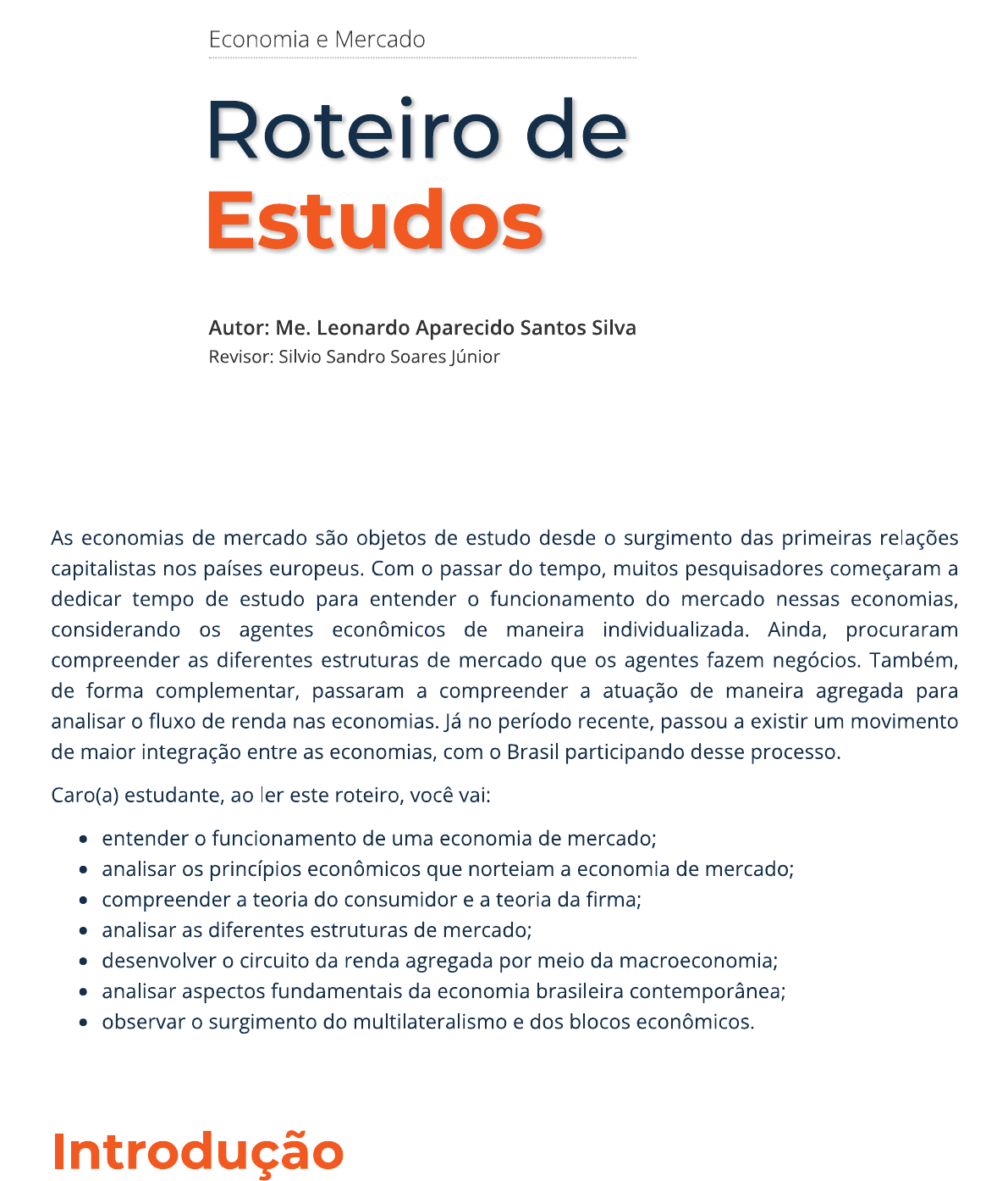 Economia e Mercado Roteiro de Estudos Autor: Me. Leonardo Aparecido Santos Silva Revisor: Silvio Sandro Soares Júnior As economias de mercado são objetos de estudo desde o surgimento das primeiras relações capitalistas nos países europeus. Com o passar do tempo, muitos pesquisadores começaram a dedicar tempo de estudo para entender o funcionamento do mercado nessas economias, considerando os agentes econômicos de maneira individualizada. Ainda, procuraram compreender as diferentes estruturas de mercado que os agentes fazem negócios. Também, de forma complementar, passaram a compreender a atuação de maneira agregada para analisar o fluxo de renda nas economias. Já no período recente, passou a existir um movimento de maior integração entre as economias, com o Brasil participando desse processo. Caro(a) estudante, ao ler este roteiro, você vai: entender o funcionamento de uma economia de mercado; analisar os princípios econômicos que norteiam a economia de mercado; compreender a teoria do consumidor e a teoria da firma; analisar as diferentes estruturas de mercado; desenvolver o circuito da renda agregada por meio da macroeconomia; analisar aspectos fundamentais da economia brasileira contemporânea; observar o surgimento do multilateralismo e dos blocos econômicos. IntroduçãoNo sistema econômico baseado no mercado (economia de mercado ou economia capitalista), os diferentes agentes econômicos, tais como famílias, empresas e governo, possuem diversas interações entre si por meio da oferta e da demanda de bens e serviços ao longo do tempo. Essas interações podem ocorrer em mercados mais ou menos concentrados, ou seja, mercados em que certo agente econômico possui maior poder em relação aos demais, impactando toda a dinâmica econômica. Nesse contexto, a Economia analisa diversas relações, além da própria interação entre os agentes econômicos, como é o caso da escassez dos recursos (terra, trabalho e capital) existentes, devendo ser utilizados de maneira eficiente e eficaz. Assim, analisa como ocorre a remuneração de cada recurso utilizado para a produção de certos bens e serviços. Portanto, ao analisar a economia, deve-se levar em consideração toda a complexidade que envolve nosso sistema econômico com base no mercado. Princípios Econômicos As economias de mercados possuem aspectos básicos e princípios que acabam por guiar os agentes econômicos envolvidos nas diversas transações que ocorrem diariamente. Você consegue imaginar quais? Por exemplo, Pindyck e Rubinfeld (2013) explicam que, em relação aos aspectos microeconômicos, os consumidores, investidores, proprietários de terra e trabalhadores são os agentes responsáveis por tomar decisões de consumo e produção. Mais especificamente, os consumidores têm renda limitada, podendo ser gasta em uma grande variedade de bens e serviços ou poupada para o futuro. Logo, com base em suas preferências, maximizam o próprio bem-estar optando por comprar mais unidades de determinado bem e, em contrapartida, adquirir menos de outros. Os trabalhadores também enfrentam restrições e fazem escolhas, ao alocar seu tempo entre trabalho ou lazer, com tipo de emprego (salário) dependendo de seu grau de educação e das habilidades acumuladas. Por fim, as empresas também enfrentam limitações em relação àquilo que podem produzir e aos recursos disponíveis para produzi-lo, em consequência das restrições financeiras, por exemplo (PINDYCK; RUBINFELD, 2013). Nessa perspectiva, a união entre esses diferentes agentes econômicos proporciona surgimento do mercado, pois as interações entre eles acabam determinando o preço do(s) produto(s). Consequentemente, a definição de um mercado parte da identificação de quais compradores, vendedores e produtos devem ser incluídos em determinado mercado (PINDYCK; RUBINFELD, 2013). Ao compreender a relação entre os agentes econômicos, é possível entender a dinâmica da economia de mercado. Contudo, existe alguma limitação para essas relações de oferta (venda), demanda (compra) e utilização de recursos?A Economia é estudo da forma como as sociedades utilizam recursos escassos para produzir bens e serviços que possuem valor para distribuí-los entre indivíduos diferentes [...]. A eficiência econômica exige que uma economia produza a mais elevada combinação de quantidade e qualidade de bens e serviços dados a sua tecnologia e seus recursos escassos. Uma economia produz de maneira eficiente quando o bem-estar econômico de nenhum indivíduo pode ser melhorado sem que o de outro indivíduo fique pior (SAMUELSON; NORDHAUS, 2012, p. 3). Portanto, em decorrência da escassez de recursos, a escolha de determinado objeto implica, necessariamente, em abrir mão de outro. Portanto, existe um custo de oportunidade de uma decisão, ou seja, é o valor do bem ou do serviço de que se abre mão. Consequentemente, uma economia consegue alcançar a eficiência produtiva quando não pode produzir mais de um bem sem que produza menos de outro bem, estando em sua fronteira de possibilidades de produção (SAMUELSON; NORDHAUS, 2012). A fronteira de possibilidades de produção (ou FPP) representa as quantidades máximas de produtos que podem ser produzidas de maneira eficiente por uma economia, dados o seu conhecimento tecnológico e a quantidade de insumos disponíveis (SAMUELSON; NORDHAUS, 2012). Assim, observe a Figura 1, a seguir, que sintetiza bem funcionamento de uma economia de mercado e a alocação dos recursos. Mercados de produtos Demanda Oferta Calçado Calçado Preços dos Habitação produtos no Habitação mercado Pizzas Pizzas Alocação do Custos orçamento dos consumidores de produção o quê CONSUMIDORES Como EMPRESAS Para quem Proprietários Produtividade dos fatores de dos insumos produção Preços dos Trabalho insumos nos Trabalho Terra mercados Terra (salários, Bens de capital rendas, juros) Bens de capital Oferta Demanda M