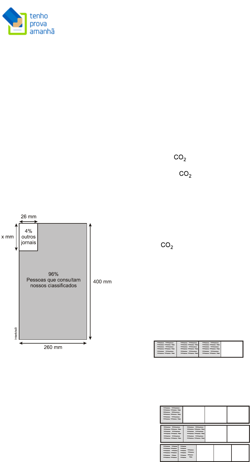 Provas ENEM Matemática www.tenhoprovaamanha.com.br www.tenhoprovaamanha.com.br 10 passaram a receber R$ 360,00 mensais, um aumento de 20% com relação ao que era pago até então. O órgão concedia 29 mil bolsas de iniciação científica até 2009, e esse número aumentou em 48% em 2010. O Globo. 11 mar. 2010. Caso o CNPq decidisse não aumentar o valor dos pagamentos dos bolsistas, utilizando o montante destinado a tal aumento para incrementar ainda mais o número de bolsas de iniciação científica no país, quantas bolsas a mais que em 2009, aproximadamente, poderiam ser oferecidas em 2010? a) 5,8 mil. b) 13,9 mil. c) 22,5 mil. d) 51,5 mil. e) 94,4 mil. 41. (Enem 2010) O jornal de certa cidade publicou em uma página inteira a seguinte divulgação de seu caderno de classificados. Para que a propaganda seja fidedigna a porcentagem da área que aparece na divulgação, a medida do lado do retângulo que representa os 4%, deve ser de aproximadamente a) 1 mm. b) 10 mm. c) 17 mm. d) 160 mm. e) 167 mm. 42. (Enem 2010) Um grupo de pacientes com Hepatite C foi submetido a um tratamento tradicional em que 40% desses pacientes foram completamente curados. Os pacientes que não obtiveram cura foram distribuídos em dois grupos de mesma quantidade e submetidos a dois tratamentos inovadores. No primeiro tratamento inovador, 35% dos pacientes foram curados e, no segundo, 45%. Em relação aos pacientes submetidos inicialmente, os tratamentos inovadores proporcionaram cura de a) 16%. b) 24%. c) 32%. d) 48% e) 64%. 43. (Enem 2ª aplicação 2010) Uma bióloga conduziu uma série de experimentos demonstrando que a cana-de-açúcar mantida em um ambiente com o dobro da concentração atual de realiza 30% mais de fotossíntese e produz 30% mais de açúcar do que a que cresce sob a concentração normal de . Das câmaras que mantinham esse ar rico em gás carbônico, saíram plantas também mais altas e mais encorpadas, com 40% mais de biomassa. Disponível em: http://revistapesquisa.fapesp.br. Acesso em: 26 set 2008. Os resultados indicam que se pode obter a mesma produtividade de cana numa menor área cultivada. Nas condições apresentadas de utilizar o dobro da concentração de no cultivo para dobrar a produção da biomassa da cana-de-açúcar, a porcentagem da área cultivada hoje deveria ser, aproximadamente, a) 80%. b) 100%. c) 140%. d) 160%. e) 200%. 44. (Enem 2010) Um professor dividiu a lousa da sala de aula em quatro partes iguais. Em seguida, preencheu 75% dela com conceitos e explicações, conforme a figura seguinte. Algum tempo depois, o professor apagou a lousa por completo e, adotando um procedimento semelhante ao anterior, voltou a preenchê-la, mas, dessa, vez, utilizando 40% do espaço dela. Uma representação possível para essa segunda situação é a) b) c) Provas ENEM Matemática www.tenhoprovaamanha.com.br www.tenhoprovaamanha.com.br 11 d) e) 45. (Enem 2010) Os dados do gráfico foram coletados por meio da Pesquisa Nacional por Amostra de Domicílios. Supondo-se que, no Sudeste, 14900 estudantes foram entrevistados nessa pesquisa, quantos deles possuíam telefone móvel celular? a) 5513 b) 6556 c) 7450 d) 8344 e) 9536 46. (Enem 2010) Os dados do gráfico seguinte foram gerados a partir de dados colhidos no conjunto de seis regiões metropolitanas pelo Departamento Intersindical de Estatística e Estudos Socioeconômicos (Dieese). Supondo que o total de pessoas pesquisadas na região metropolitana de Porto Alegre equivale a 250 000, o número de desempregados em março de 2010, nessa região, foi de a) 24 500. b) 25 000. c) 220 500. d) 223 000. e) 227 500. 47. (Enem 2010) Uma empresa possui um sistema de controle de qualidade que classifica o seu desempenho financeiro anual, tendo como base o do ano anterior. Os conceitos são: insuficiente, quando o crescimento e menor que 1%; regular, quando o crescimento é maior ou igual a 1% e menor que 5%; bom, quando o crescimento é maior ou igual a 5% e menor que 10%; ótimo, quando é maior ou igual a 10% e menor que 20%; e excelente, quando é maior ou igual a 20%. Essa empresa apresentou lucro de R$ 132 000,00 em 2008 e de R$ 145 000,00 em 2009. De acordo com esse sistema de controle de qualidade, o desempenho financeiro dessa empresa no ano de 2009 deve ser considerado a) insuficiente. b) regular. c) bom. d) ótimo. e) excelente. 48. (Enem 2010) Em 2006, a produção mundial de etanol foi de 40 bilhões de litros e a de biodiesel, de 6,5 bilhões. Neste mesmo ano, a produção brasileira de etanol correspondeu a 43% da produção mundial, ao passo que a produção dos Estados Unidos da América, usando milho, foi de 45%. Disponível em: planetasustentavel.abril.com. Acesso em: 02 maio 2009. Considerando que, em 2009, a produção mundial de etanol seja a mesma de 2006 e que os Estados Unidos produzirão somente a metade de sua produção de 2006, para que o total produzido pelo Brasil e pelos Estados Unidos continue correspondendo a 88% da produção mundial, o Brasil deve aumentar sua produção em, aproximadamente, a) 22,5%. b) 50,0%. c) 52,3%. d) 65,5%. e) 77,5%. 49. (Enem 2ª aplicação 2010) No dia 12 de janeiro de 2010, o governo da Venezuela adotou um plano de racionamento de energia que previa cortes no fornecimento em todo o país. O ministro da energia afirmou que uma das formas mais eficazes de se economizar energia nos domicílios seria o uso de lâmpadas que consomem 20% menos da energia consumida por lâmpadas normais. Provas ENEM Matemática www.tenhoprovaamanha.com.br www.tenhoprovaamanha.com.br 12 Disponível em: http://www.bbc.co.uk. Acesso em: 23 abr. 2010 (adaptado). Em uma residência, o consumo mensal de energia mproveniente do uso de lâmpadas comuns é de 63 kWh. Se todas as lâmpadas dessa residência forem trocadas pelas lâmpadas econômicas, esse consumo passará a ser de, aproximadamente, a) 9 kWh. b) 11 kWh. c) 22 kWh. d) 35 kWh. e) 50 kWh. 50. (Enem 2009) Dados da Associação Nacional de Empr