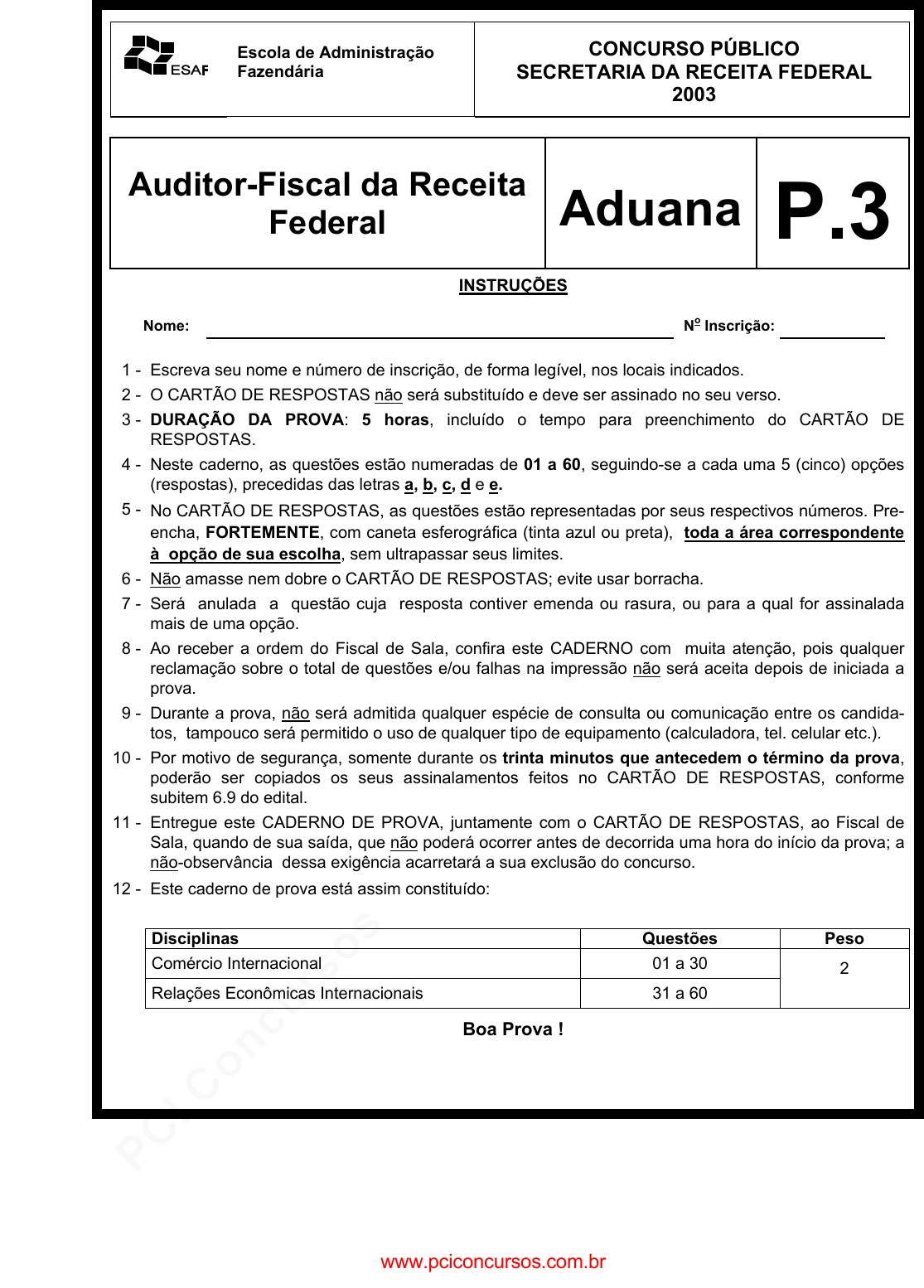 pcimarkpci MDAwMDowMDAwOjAwMDA6MDAwMDowMDAwOmZmZmY6YjViZjozZTlj:RnJpLCAyNCBKYW4gMjAyNSAwMDoxMjozNCAtMDMwMA== www.pciconcursos.com.br Escola de Administração Fazendária CONCURSO PÚBLICO SECRETARIA DA RECEITA FEDERAL 2003 Auditor-Fiscal da Receita Federal Aduana P.3 INSTRUÇÕES Nome: No Inscrição: 1 - Escreva seu nome e número de inscrição, de forma legível, nos locais indicados. 2 - O CARTÃO DE RESPOSTAS não será substituído e deve ser assinado no seu verso. 3 - DURAÇÃO DA PROVA: 5 horas, incluído o tempo para preenchimento do CARTÃO DE RESPOSTAS. 4 - Neste caderno, as questões estão numeradas de 01 a 60, seguindo-se a cada uma 5 (cinco) opções (respostas), precedidas das letras a, b, c, d e e. 5 - No CARTÃO DE RESPOSTAS, as questões estão representadas por seus respectivos números. Pre- encha, FORTEMENTE, com caneta esferográfica (tinta azul ou preta), toda a área correspondente à opção de sua escolha, sem ultrapassar seus limites. 6 - Não amasse nem dobre o CARTÃO DE RESPOSTAS; evite usar borracha. 7 - Será anulada a questão cuja resposta contiver emenda ou rasura, ou para a qual for assinalada mais de uma opção. 8 - Ao receber a ordem do Fiscal de Sala, confira este CADERNO com muita atenção, pois qualquer reclamação sobre o total de questões e/ou falhas na impressão não será aceita depois de iniciada a prova. 9 - Durante a prova, não será admitida qualquer espécie de consulta ou comunicação entre os candida- tos, tampouco será permitido o uso de qualquer tipo de equipamento (calculadora, tel. celular etc.). 10 - Por motivo de segurança, somente durante os trinta minutos que antecedem o término da prova, poderão ser copiados os seus assinalamentos feitos no CARTÃO DE RESPOSTAS, conforme subitem 6.9 do edital. 11 - Entregue este CADERNO DE PROVA, juntamente com o CARTÃO DE RESPOSTAS, ao Fiscal de Sala, quando de sua saída, que não poderá ocorrer antes de decorrida uma hora do início da prova; a não-observância dessa exigência acarretará a sua exclusão do concurso. 12 - Este caderno de prova está assim constituído: Disciplinas Questões Peso Comércio Internacional 01 a 30 Relações Econômicas Internacionais 31 a 60 2 Boa Prova ! www.pciconcursos.com.br pcimarkpci MDAwMDowMDAwOjAwMDA6MDAwMDowMDAwOmZmZmY6YjViZjozZTlj:RnJpLCAyNCBKYW4gMjAyNSAwMDoxMjozNCAtMDMwMA== www.pciconcursos.com.br Auditor-Fiscal da Receita Federal - AFRF - 2003 ADUANA - Prova 3 2 COMÉRCIO INTERNACIONAL 01- O Sistema Harmonizado distribui as mercadorias em: a) seções e capítulos, dos quais três foram re- servados para utilização futura. Possui seis regras gerais de interpretação (RGI) e duas regras gerais complementares (RGC-1 e RGC-2). O texto de descrição das mercado- rias é precedido de um código, composto de seis algarismos, separados da seguinte forma XXXX.XX, indicando os dois primeiros o ca- pítulo, os quatro primeiros a posição, e os dois últimos, a subposição, que pode ser de primeiro nível ou de segundo nível ou com- posta. b) seções e capítulos, dos quais três foram re- servados para utilização pelas partes contra- tantes, individualmente. Possui seis regras gerais de interpretação (RGI) e uma regra geral complementar (RGC-1). O texto de descrição das mercadorias é precedido de um código, composto de oito algarismos, separa- dos da seguinte forma XXXX.XX.XX, indi- cando os dois primeiros o capítulo, os quatro primeiros a posição, o 5º e o 6º, a subposi- ção, que pode ser de primeiro nível ou de segundo nível ou composta, e os dois últimos, o item e o subitem. c) seções e capítulos, dos quais um foi reser- vado para utilização pelas partes, individual- mente, e dois foram reservados para utiliza- ção futura. Possui seis regras gerais de inter- pretação (RGI) e uma regra geral complementar (RGC-1). O texto de descrição das mercadorias é precedido de um código, composto de oito algarismos, separados da seguinte forma XX.XX.XX.XX, indicando os dois primeiros o capítulo, os quatro primeiros a posição, o 5º e o 6º, a subposição, que pode ser de primeiro nível ou de segundo nível ou composta, e os dois últimos, o item e o subitem. d) seções e capítulos, dos quais três foram re- servados para utilização futura. Possui seis regras gerais de interpretação (RGI) e uma regra geral complementar (RGC-1). O texto de descrição das mercadorias é precedido de um código, composto de oito algarismos, separados da seguinte forma XXXX.XX.XX, indicando os dois primeiros o capítulo, os quatro primeiros a posição, o 5º e o 6º, a subposição, que pode ser de primeiro nível ou de segundo nível ou composta, e os dois últimos, o item e o subitem. e) seções e capítulos, dos quais um foi reser- vado para utilização futura e dois, para utili- zação pelas partes contratantes. Possui seis regras gerais de interpretação (RGI). O texto de descrição das mercadorias é precedido de um código, composto de seis algarismos, separados da seguinte forma XXXX.XX, indi- cando os dois primeiros o capítulo, os quatro primeiros a posição, e os dois últimos, a sub- posição, que pode ser de primeiro nível ou de segundo nível ou composta. 02- Assinale a opção incorreta. a) Compete à CAMEX, Câmara de Comércio Exterior, alterar a Nomenclatura Comum do Mercosul de que trata o Decreto nº. 2.376/97, na forma estabelecida nos atos decisórios do Mercosul. b) O Presidente do Conselho de Ministros da CAMEX poderá alterar as alíquotas do Im- posto de Importação e do Imposto de Expor- tação, ad referendum do Conselho de Minis- tros, consultados previamente os membros do Comitê Executivo de Gestão. c) A CAMEX deve observar, no exercício de suas atribuições, as competências do Ministé- rio da Fazenda, fixadas no art. 237 da Cons- tituição, do Banco Central e do Conselho Monetário Nacional. d) A fixação das alíquotas dos impostos inci- dentes sobre o comércio exterior com