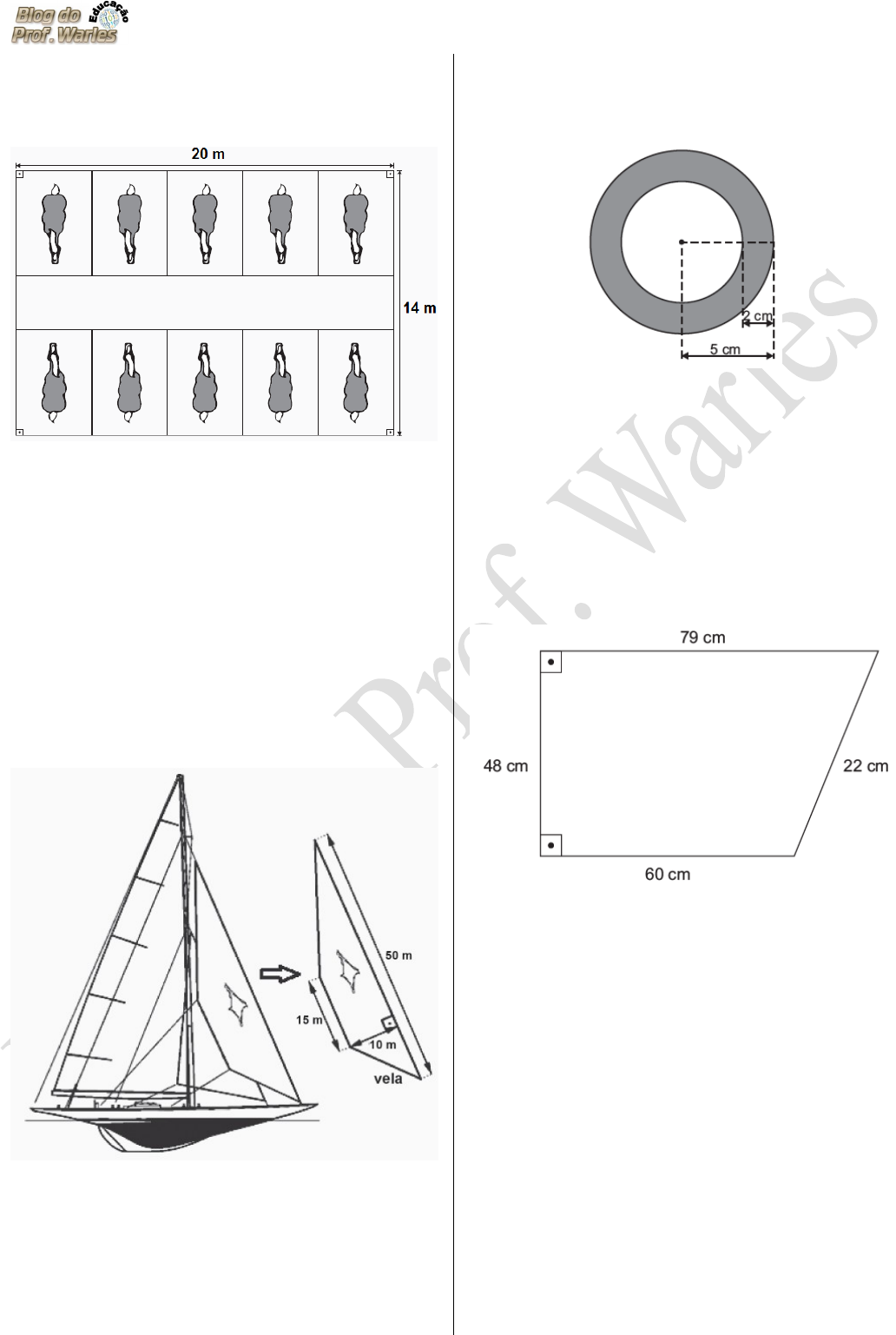 D12 – Resolver problema envolvendo o cálculo de área de figuras planas. -------------------------------------------------------------------- (SAEPE). Observe, no desenho abaixo, o esquema de um estábulo que foi construído para acomodar dez cavalos. Qual é a medida da área ocupada por esse estábulo? A) 960 m2 B) 280 m2 C) 140 m2 D) 68 m2 E) 34 m2 -------------------------------------------------------------------- (PAEBES). Durante um forte vento, um barco teve uma de suas velas danificadas. O capitão desse barco ancorou na cidade mais próxima com objetivo de comprar o tecido necessário para confeccionar uma vela substituta. Observe abaixo o desenho desse barco e de sua vela com algumas medidas indicadas. A quantidade mínima de tecido, em metros quadrados, que o capitão deverá comprar para confeccionar essa vela é A) 250. B) 325. C) 380. D) 450. -------------------------------------------------------------------- (SAEPE). O desenho abaixo é formado por dois círculos concêntricos. Qual é a medida da área da parte colorida de cinza? A) 34π cm2 B) 25π cm2 C) 21π cm2 D) 16π cm2 E) 13π cm2 -------------------------------------------------------------------- (SAEPE). O trapézio retângulo desenhado abaixo representa uma bancada de mármore que Andréia colocou em sua cozinha. Qual é a medida da área dessa bancada? A) 187 cm² B) 209 cm² C) 1 529 cm² D) 3 336 cm² E) 6 672 cm² -------------------------------------------------------------------- (SAEPI). Um campo de futebol tem forma retangular com 105 metros de comprimento e 70 metros de largura. Quantos metros quadrados de grama, no mínimo, são necessários para cobrir toda a superfície desse campo de futebol? A) 175 B) 350 C) 3 675 D) 7 350 1 D12 – Resolver problema envolvendo o cálculo de área de figuras planas. -------------------------------------------------------------------- (SAEPB). A quadra de basquete do “FM Tênis Clube” foi pintada como mostra a parte cinza da figura abaixo. (Dado: π = 3,14) Qual foi a área pintada de cinza nessa quadra? A) 10,64 m2 B) 34,58 m2 C) 38,57 m2 D) 39,36 m2 E) 43,11 m2 -------------------------------------------------------------------- (AREAL). O desenho abaixo representa a vista superior de um palco montado para um show na praia. A forma desse palco é composta por um trapézio e um semicírculo justapostos. Dados: π = 3,14. A medida da área destinada a esse palco, em metros quadrados, é igual a A) 45,95. B) 65,30. C) 69,95. D) 47,60. E) 83,90. -------------------------------------------------------------------- (SEAPE). O diretor de um clube vai gramar um campo retangular de 110 m de comprimento por 70 m de largura. Quantos metros quadrados de grama são necessários para cobrir todo esse campo? A) 180 B) 360 C) 7 700 D) 17 000 E) 32 400 -------------------------------------------------------------------- (SAERJ). A figura abaixo representa um pátio em forma de trapézio. Para pavimentar esse pátio, quantos metros quadrados de cerâmica são necessários? A) 11 m² B) 14 m² C) 16 m² D) 20 m² E) 22 m² -------------------------------------------------------------------- (PROEB). Na figura abaixo, ABCD é um retângulo, com 8,6 cm de comprimento e 4,2 cm de altura. A área da superfície hachurada é: (A) 12,80 cm² (B) 18,06 cm² (C) 25,60 cm² (D) 36,12 cm² (E) 53,76 cm² -------------------------------------------------------------------- Observe, abaixo, a figura F desenhada numa região quadriculada. 2 D12 – Resolver problema envolvendo o cálculo de área de figuras planas. Considere cada quadradinho como uma unidade de área e represente-a por u. Então, a área da região limitada pela figura F é: (A) 9 u. (B) 11 u. (C) 13 u. (D) 15 u. (E) 16 u. -------------------------------------------------------------------- Paulo resolve modificar o revestimento do piso de sua sala de estar e escolhe uma cerâmica cujo formato está representado na figura a seguir. A cerâmica escolhida tem a forma de um quadrado cujo lado mede 40 cm e possui 4 arcos de circunferência, de raio igual a 10cm, cujos centros estão localizados nos vértices do quadrado. Com base nessas informações, qual é a área do desenho formado na cerâmica, em centímetros quadrados? (Considere π = 3,14). (A) 314 (B) 400 (C) 486 (D) 1114 (E) 1286 -------------------------------------------------------------------- Um jardineiro fez um cercado para plantar flores no formato da figura colorida abaixo. A área destinada ao plantio de flores é de: (A) 4 cm2. (B) 5 cm2. (C) 6 cm2. (D) 7 cm2. (E) 3 cm2. -------------------------------------------------------------------- Um aluno desenhou num papel quadriculado a figura abaixo. Considere cada quadradinho como uma unidade de área e represente-a por u. Então, a área da região limitada pela figura é: (A) 18 u. (B) 12 u. (C) 13 u. (D) 11 u. (E) 10 u. -------------------------------------------------------------------- Um triângulo eqüilátero tem área igual a 8√3 cm². Qual é a medida do lado desse triângulo? (A) 4 √2 cm (B) 4 cm (C) 16 cm (D) 32 cm (E) 32√2 cm -------------------------------------------------------------------- No polígono da figura abaixo, PQ é paralelo a TS e UT é paralelo a RS. 3 D12 – Resolver problema envolvendo o cálculo de área de figuras planas. A medida da área desse polígono, em metros quadrados, é A) 15 B) 19 C) 20 D) 23 E) 24 -------------------------------------------------------------------- (ENEM 2010). Em canteiros de obras de construção cível é comum perceber trabalhadores realizando medidas de comprimento e de ângulos e fazendo demarcações por onde a obra deve começar ou se erguer. Em um desses canteiros foram feitas algumas marcas no chão plano. Foi possível perceber que, das seis estacas colocadas, três eram vértices de um triângulo retângulo e as outras três eram os pontos médios dos lados desse triângulo, conforme pode ser visto na figura, em que as estaca