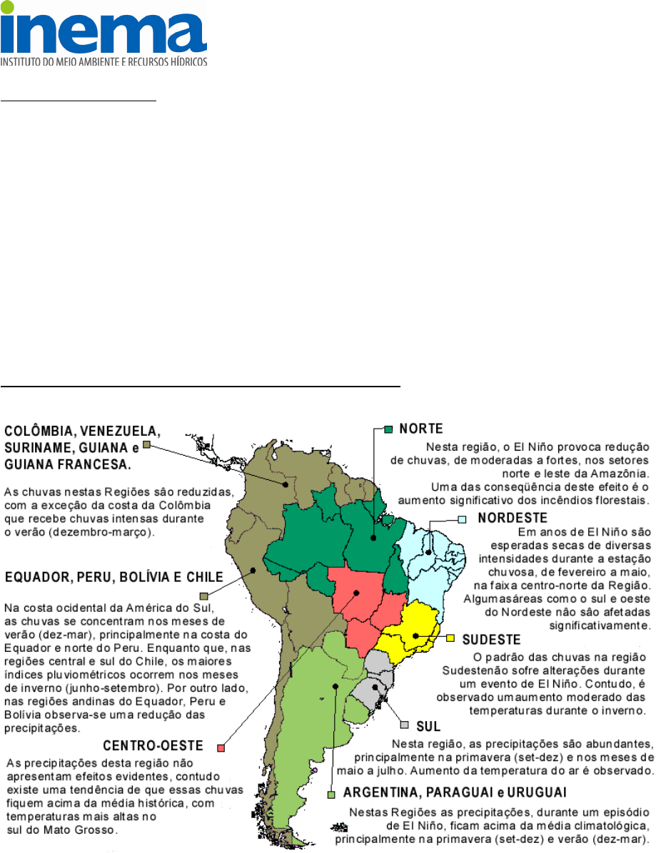 O que é o El Niño? É um fenômeno climático de escala global caracterizado pelo aquecimento acima do normal das águas superficiais do Oceano Pacífico Equatorial, que se estende desde a costa oeste da América do Sul (próximo ao Peru e Equador) até aproximadamente a Linha Internacional de Data (longitude de 180°). Este aquecimento anormal é geralmente observado no mês de dezembro, ou seja, próximo ao Natal (daí surgiu o nome de El Niño - o menino Jesus - dado pelos pescadores peruanos devido à época de ocorrência desse fenômeno). Dependendo da intensidade e duração do aquecimento da água do mar, os episódios de El Niño podem ser classificados como sendo fracos, moderados e fortes. Normalmente eles ocorrem em intervalos irregulares de 03, 07 e 12 anos, podendo durar de 12 a 18 meses. A Figura 01 ilustra os efeitos causados pelo El Niño em todo o continente Sul-americano. Efeitos do Fenômeno El Niño na América do Sul Figura 01: Efeitos do El Niño na América do Sul (Fonte: www.cptec.inpe.br). Circulação de Grande Escala Durante o Fenômeno El Niño A Circulação de Grande Escala (ou Circulação Geral da Atmosfera) é responsável por todo o clima na Terra. É esta Circulação que transporta calor e umidade de uma região para outra, ou seja, retira a umidade de uma região como os oceanos e florestas e provoca chuvas em outras, a exemplo do Nordeste brasileiro. Com a ocorrência do fenômeno El Niño a Circulação de Grande Escala é modificada, provocando mudanças no clima em diferentes regiões do Planeta, como aumento no volume das chuvas na costa do Peru e sul do Brasil e secas nas regiões Norte e Nordeste do Brasil. A Figura 02 mostra uma esquematização desta Circulação no sentido zonal (também conhecida como Célula de Walker) modificada em associação ao episódio El Niño sobre o Oceano Pacífico. Assim, é possível observar um ramo ascendente (favorecendo a formação de nuvens) da Célula de Walker na região do Pacífico centro-leste, incluindo Peru/Equador. Por outro lado, um ramo descendente (que inibe a formação de nuvens) é observado na região do Pacífico oeste, norte da Austrália e também no Atlântico Equatorial, incluindo o leste da Amazônia e Semi-Árido Nordestino. Figura 02: Ilustração esquemática da circulação atmosférica de grande escala no sentido zonal (Célula de Walker) modificada em associação ao episódio El Niño sobre o Oceano Pacífico (Fonte: www.funceme.br). Impactos do Fenômeno El Niño no Mundo O fenômeno El Niño interfere na circulação geral da atmosfera de grande escala e, consequentemente, provoca mudanças nas condições climáticas de várias regiões continentais ao redor do planeta, devido à grande quantidade de energia envolvida neste processo. Grandes secas na Índia, no Nordeste do Brasil, na Austrália, Indonésia e África são decorrentes do fenômeno, assim como, algumas enchentes no Sul e Sudeste do Brasil, no Peru, Equador e no meio oeste dos Estados Unidos. Em algumas áreas, observam-se temperaturas mais elevadas do que o normal (como é o caso das regiões central e sudeste do Brasil, durante sua estação de inverno), enquanto que em outras ocorrem frio e neve em excesso. Portanto, as anomalias climáticas associadas ao fenômeno El Niño são desastrosas e provocam sérios prejuízos sócio-econômicos e ambientais, Figura 03. Figura 03: Impactos do El Niño em diferentes regiões do planeta (Fonte: www.cptec.inpe.br). Eventos Anteriores de El Niño A Tabela ao lado mostra a distribuição temporal de ocorrência dos eventos de El Niño, bem como, a intensidade desses eventos. Esta Tabela foi extraída do site do CPTEC/INPE, que contou com informações das seguintes fontes para sua elaboração: Rasmusson e Carpenter 1983, Monthly Weather Review, Ropelewski e Halpert 1987, Monthly Weather Review, Cold episode sources Ropelewski e Halpert 1989, Journal of Climate e Climate Diagnostics Bulletin. A intensidade dos ventos é baseada no padrão e magnitude das anomalias da TSM do Pacífico Tropical. 1877 - 1878 1888 - 1889 1896 - 1897 1899 1902 - 1903 1905 - 1906 1911 - 1912 1913 - 1914 1918 - 1919 1923 1925 - 1926 1932 1939 - 1941 1946 - 1947 1951 1953 1957 - 1959 1963 1965 - 1966 1968 - 1970 1972 - 1973 1976 - 1977 1977 - 1978 1979 - 1980 1982 - 1983 1986 - 1988 1990 - 1993 1994 - 1995 1997 - 1998 2002 - 2003 2004 - 2005 2006 - 2007 2009 - 2010 - Legenda: Forte Moderado Fraco Evento de 1997/98 O El Niño registrado nos anos de 1997/98 foi considerado o mais intenso do século passado. A Figura 04 mostra a anomalia da Temperatura da Superfície do Mar (TSM) referente ao mês de setembro de 1997, onde as áreas em cores vermelhas e amarelas indicam o quanto a TSM está mais quente, em relação à média histórica daquele mês, quando foram registradas anomalias de até 4,0°C acima dessa média. É importante lembrar, que nos meses de dezembro de 1997 e janeiro de 1998, na porção leste do Oceano Pacífico, a TSM alcançou cinco graus acima do normal para estes meses. Figura 04: Anomalia da Temperatura da Superfície do Mar (TSM) referente ao mês de setembro de 1997 (Fonte: www.cptec.inpe.br).