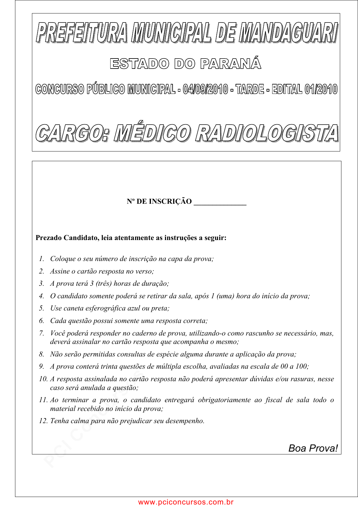 pcimarkpci MDAwMDowMDAwOjAwMDA6MDAwMDowMDAwOmZmZmY6YmFmOTpiNDVi:RnJpLCAyNCBKYW4gMjAyNSAxNjo0MjoyMSAtMDMwMA== www.pciconcursos.com.br Nº DE INSCRIÇÃO ______________ Prezado Candidato, leia atentamente as instruções a seguir: 1. Coloque o seu número de inscrição na capa da prova; 2. Assine o cartão resposta no verso; 3. A prova terá 3 (três) horas de duração; 4. O candidato somente poderá se retirar da sala, após 1 (uma) hora do início da prova; 5. Use caneta esferográfica azul ou preta; 6. Cada questão possui somente uma resposta correta; 7. Você poderá responder no caderno de prova, utilizando-o como rascunho se necessário, mas, deverá assinalar no cartão resposta que acompanha o mesmo; 8. Não serão permitidas consultas de espécie alguma durante a aplicação da prova; 9. A prova conterá trinta questões de múltipla escolha, avaliadas na escala de 00 a 100; 10. A resposta assinalada no cartão resposta não poderá apresentar dúvidas e/ou rasuras, nesse caso será anulada a questão; 11. Ao terminar a prova, o candidato entregará obrigatoriamente ao fiscal de sala todo o material recebido no início da prova; 12. Tenha calma para não prejudicar seu desempenho. Boa Prova! www.pciconcursos.com.br pcimarkpci MDAwMDowMDAwOjAwMDA6MDAwMDowMDAwOmZmZmY6YmFmOTpiNDVi:RnJpLCAyNCBKYW4gMjAyNSAxNjo0MjoyMSAtMDMwMA== www.pciconcursos.com.br 2 O Padeiro Rubem Braga Levanto cedo, faço minhas abluções, ponho a chaleira no fogo para fazer café e abro a porta do apartamento – mas não encontro o pão costumeiro. No mesmo instante me lembro de ter lido alguma coisa nos jornais da véspera sobre a “greve do pão dormido”. De resto não é bem uma greve, é um lockout, greve dos patrões, que suspenderam o trabalho noturno; acham que obrigando o povo a tomar o seu café de manhã com pão dormido conseguirão não sei bem o que do governo. Está bem. Tomo meu café com pão dormido, que não é tão ruim assim. E enquanto tomo café vou me lembrando de um homem modesto que conheci antigamente. Quando vinha deixar pão à porta do apartamento ele apertava a campainha, mas, para não incomodar os moradores, avisava gritando: – Não é ninguém, é o padeiro! Interroguei-o uma vez: como tivera a idéia de gritar aquilo? “Então você não é ninguém?” Ele abriu um sorriso largo. Explicou que aprendera aquilo de ouvido. Muitas vezes lhe acontecera bater a campainha de uma casa e ser atendido por uma empregada ou outra pessoa qualquer, e ouvir uma voz que vinha lá de dentro perguntando quem era; e ouvir a pessoa que o atendera dizer para dentro: “não é ninguém, não senhora, é o padeiro”. Assim ficara sabendo que não era ninguém... Ele me contou isso sem mágoa nenhuma, e se despediu ainda sorrindo. Eu não quis detê-lo para ___________ que estava falando com um colega, ainda menos importante. Naquele tempo eu também, como os padeiros, fazia trabalho noturno. Era pela madrugada que deixava a redação do jornal, ____________ sempre depois de uma passagem pela oficina – e muitas vezes saía já levando na mão um dos primeiros exemplares rodados, o jornal ainda quentinho da máquina, como pão saído do forno. Ah, eu era rapaz, eu era rapaz naquele tempo! E às vezes me julgava importante porque no jornal que levava para casa, além de ____________ ou notas que eu escrevera sem assinar, ia uma crônica ou artigo com o meu nome. O jornal e o pão estariam bem cedinho na porta de cada lar; e dentro do meu coração eu recebi a lição de humildade daquele homem entre todos útil e entre todos alegre; “não é ninguém, é só o padeiro!” E assobiava pelas escadas. Ai de ti, Copacabana. 6. Ed. Rio de Janeiro, Record, 1981. P. 36-7. 01 - Assinale a alternativa em que as palavras que preenchem as lacunas do texto estão corretamente escritas: a) esplicar – quase – reportajens. c) explicar – quase – reportagens. b) explicar – quaze – reportagens. d) esplicar – quaze – reportajens. 02 - Analise as afirmativas quanto à acentuação gráfica e assinale a incorreta: a) As oxítonas café e você são acentuadas porque terminam em e. b) As palavras véspera, máquina e crônica são proparoxítonas. c) Os monossílabos lá e só são acentuados porque são tônicos e terminados em a e o. d) As palavras idéia e saía obedecem à mesma regra de acentuação gráfica. 03 - Quanto ao plural dos substantivos analise as afirmativas: I – Pão e mão para formar o plural basta acrescentar simplesmente um s à forma singular. II – Os substantivos povo e forno sofrem metafonia quando se pluralizam, mudando o o fechado para o o aberto. III – O plural no diminutivo de jornal e lar de acordo com a norma culta são jornalzinhos e larzinhos. IV – Os substantivos terminados em r (lar) e z (rapaz) formam o plural acrescentando es ao singular. Assinale a alternativa correta: a) apenas I e II estão corretas. c) apenas II e IV estão corretas. b) apenas III e IV estão corretas. d) apenas I e III estão corretas. 04 - Em “Quando vinha deixar pão à porta do apartamento ele apertava a campainha, mas, para não incomodar os moradores, avisava gritando:” (2º parágrafo) Os termos sublinhados são recursos de coesão textual cuja função é assinalar relações de sentido de: a) tempo e oposição. c) causa e tempo. b) tempo e conseqüência. d) conseqüência e adição de argumentos. 05 - Analise as afirmativas: I - Há duas maneiras de escrever assobiava e assoviava ambas aceitas pela norma culta. II - Ablução no texto significa lavagem de todo o corpo ou de parte dele. (1º parágrafo). III - Em “Ele me contou isso sem mágoa nenhuma, e se despediu ainda sorrindo”... (6º parágrafo). A virgula pode ser eliminada porque as orações coordenadas têm o mesmo sujeito. Assinale a alternativa correta: a) apenas I e II estão corretas. b) apenas II e III estão corretas. c) apenas I e III estão corretas. d) I – II e III estão corretas. www.pci