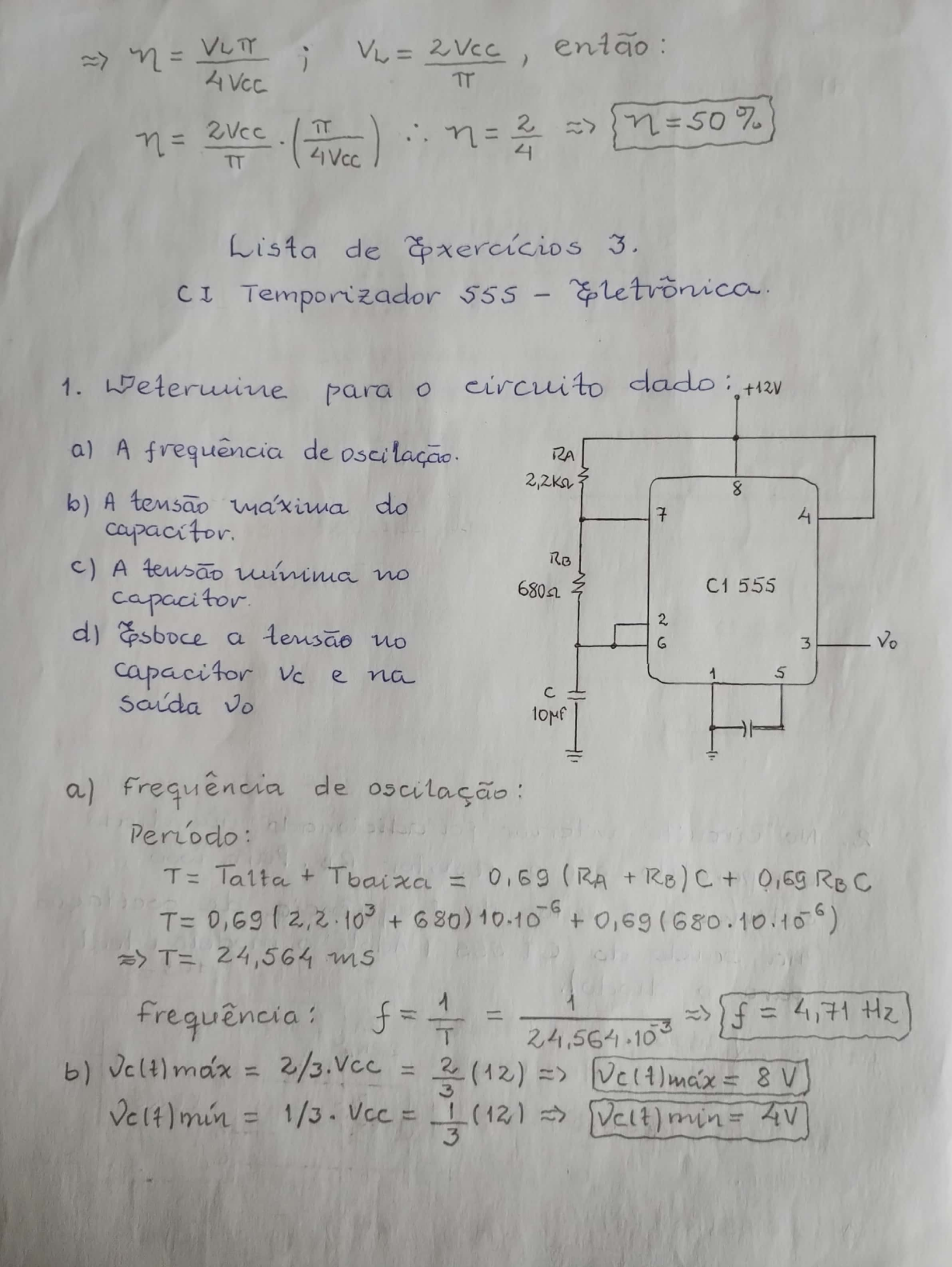 i VL = TT 2Vcc IT 2 n= => n=50% 4 Lista de Exercícios 3. CI Temporizador 555 - 1. para circuito +12V a) A frequencia de RA 8 b) A tensão maxima do 7 4 capacitor. c) A minima no RB C1 555 capacitor. 2 a no 3 Vo capacitor Vc e na 1 5 a) de T= Talta + Tbaixa = 0,69 (RA + RB/C + 0,69 RBC T= + + T= 24,564 ms 1 1 f= = Hz 24,564.10 b) = = 2 (12) = 8V 3 = = 1 (12) 3Grafico de e 2/3 = 8V 7 6 5 1/3 Vcc = 4v 4 3 2 T(m/s) > T= 24,6ms 2. No circuito anterior adicionado diodo paralelo com resistor RB . Para isso ) determine valor da de na do CI 555 ( modelo ideal para RA 8 f= ? ; id =0Atz = (diodo aberto) = 0,69 Atz = 4,692 m3 T = At, + Atz T= (15,18m + T= 19,872ms f= 1 50,32 = 3. com circuito dado deseja -se que a seja mantida 12V por tempo de Para determine resistor pl Vs = 12V por 8 CI 555 monoestavel RA 4 10Mf Vcc= t= 20ms CI 555 3 6 = Ae + 2 1 5 capacitor 10MF se carregar ate valor da tensão da logo v(t) e B = = Ae Vcc A = = Equação pl descarregamento : + = 2 Vcc => 2 = + 3 3 2, t/re + - 1 e = 1-2 3 3 t = t RC = 1,1RC RC Talta = RA= Talta RA= RA =4. Determine 0 tempo eur que a saida fica acionada com 121 V para circuito. +12V 8 Talta = 1,1 RAC RA 7 4 Talta = Talta = 242 ms 3 Vo 6 2 1 5 10MF Entrada de