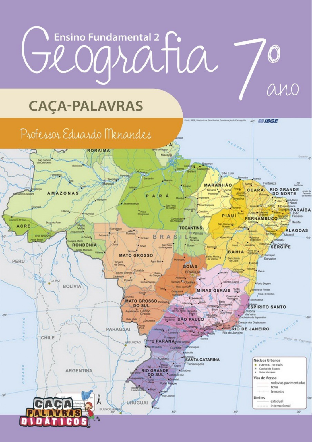 CAÇA-PALAVRAS 7º ANO Marina Ferronato Criveleto 1812881096 AGOCPD25092020-21 Proibida a reprodução total ou parcial sem prévia autorização. Caros colegas, É um prazer e um desafio preparar um material para compartilhar com vocês. O ensino e o nosso público estão em constante transformação e buscar novas estratégias tem sido nosso desafio diário. Esta apostila foi desenvolvida com o objetivo de oferecer, aos professores e alunos, alternativas diferenciadas, descontraídas e dinâmicas que facilitem o processo de ensino e aprendizagem dos conteúdos trabalhados em sala de aula, em todos os componentes curriculares. A ideia desse projeto partiu da experiência de um dos autores, com mais de sete anos de confecção, uso e compilação de caça-palavras, no componente curricular de Geografia, para os alunos dos Ensinos Fundamental e Médio. De lá para cá, esse autor buscou melhorar as atividades, pensando sempre na sua importância didática, pedagógica e estética. As experiências vividas por ele, a partir do uso de caça-palavras, motivou-o a elaborar esse trabalho, com todo o cuidado, carinho e dedicação. E para compartilhar dessa experiência de escrita e elaboração de atividades, vários profissionais da educação, das diferentes áreas do conhecimento, passaram a fazer parte desta construção. Esta apostila é do componente curricular de GEOGRAFIA e conta com 50 CAÇA- PALAVRAS elaborados e organizados com foco nas Unidades Temáticas, Objetos de Conhecimento e Habilidades presentes na BNCC (Base Nacional Comum Curricular). Delicie-se e leve para a sua sala de aula mais essa experiência lúdica e didática. Um forte abraço! Eduardo Menandes Bacharel e Licenciado em Geografia pela PUC-MG Pós-Graduado em Metodologia de Ensino de Geografia pelo IPEMIG Professor de Geografia na Rede Pública do Estado de Minas Gerais e Prefeitura Municipal de São Joaquim de Bicas VALORIZE O TRABALHO INTELECTUAL DOS PROFISSIONAIS DA EDUCAÇÃO. Marina Ferronato Criveleto 1812881096 AGOCPD25092020-21 Proibida a reprodução total ou parcial sem prévia autorização. DICAS DE USO DA APOSTILA • Todos os caça-palavras foram feitos com palavras-chave relacionadas a cada conteúdo do componente curricular. BRASIL POPULAÇÃO REGIONALIZAÇÃO MIGRAÇÕES URBANO RURAL SUDESTE NORDESTE CENTRO-OESTE • As direções das palavras estão indicadas em cada página de atividade. • As palavras que estão entre os parênteses não precisam ser procuradas. Elas estão entre parênteses para dar um sentido a palavra que será encontrada. Exemplo: (POLUIÇÃO) ATMOSFÉRICA, (SETOR) PRIMÁRIO DICAS DE IMPRESSÃO • Recomendamos a impressão na melhor resolução de imagem da sua impressora, visando a posterior utilização da atividade como matriz escolar. • Sugerimos também a impressão de 2 páginas por folha, com o objetivo de diminuir o número de cópias nas escolas. Os tamanhos das fontes foram escolhidos pensando nessa possibilidade. Marina Ferronato Criveleto 1812881096 AGOCPD25092020-21 Proibida a reprodução total ou parcial sem prévia autorização. SUMÁRIO 1º BIMESTRE 1. CONCEITOS ESTUDADOS NO 6º ANO (PALAVRAS CHAVE) 2. REVISÃO CONCEITUAL DO 6º ANO - DE PAISAGEM A LOCALIZAÇÃO GEOGRÁFICA (PALAVRAS CHAVE) 3. REVISÃO CONCEITUAL DO 6º ANO - PLANETA TERRA (PALAVRAS CHAVE) 4. REVISÃO CONCEITUAL DO 6º ANO - ESTRUTURA EXTERNA DA TERRA (PALAVRAS CHAVE) 5. REVISÃO CONCEITUAL DO 6º ANO - ESPAÇO URBANO, RURAL E SETORES E SETORES ECONÔMICOS (PALAVRAS CHAVE) 6. LOCALIZAÇÃO DO TERRITÓRIO BRASILEIRO (PARTE 1) 7. LOCALIZAÇÃO DO TERRITÓRIO BRASILEIRO (PARTE 2) 8. BRASIL FÍSICO - RELEVO E HIDROGRAFIA 9. HIDROGRAFIA – OS RIOS BRASILEIROS 10. BRASIL FÍSICO - CLIMA, VEGETAÇÃO E IMPACTOS AMBIENTAIS 11. BRASIL - MEIO AMBIENTE, SUSTENTABILIDADE E FONTES DE ENERGIA 12. FONTES DE ENERGIA 13. FONTES DE ENERGIA (@geografiainterativa) 2º BIMESTRE 14. FORMAÇÃO DO TERRITÓRIO BRASILEIRO 15. A FORMAÇÃO DO TERRITÓRIO BRASILEIRO 16. REGIONALIZAÇÃO DO TERRITÓRIO BRASILEIRO 17. BRASIL - ESTADOS E CAPITAIS DO BRASIL (TIPO 1) 18. BRASIL - REGIÕES, ESTADOS E CAPITAIS (TIPO 2) 19. OS ESTADOS DO BRASIL 20. AS CAPITAIS DO BRASIL 21. SIGNIFICADO DOS NOMES DOS ESTADOS BRASILEIROS 22. POPULAÇÃO BRASILEIRA - TIPO 1 23. POPULAÇÃO 24. FORMAÇÃO DO POVO BRASILEIRO 25. ADJETIVOS GENTÍLICOS DOS ESTADOS BRASILEIROS 26. POPULAÇÃO E TRABALHO NO BRASIL 27. TRABALHO CONSUMO E SOCIEDADE DO BRASIL 28. INDUSTRIALIZAÇÃO BRASILEIRA 29. URBANIZAÇÃO BRASILEIRA 30. URBANIZAÇÃO NO BRASIL 31. PROBLEMAS URBANOS E AMBIENTAIS 32. 50 CIDADES MAIS POPULOSAS DO BRASIL (IBGE) 33. ESPAÇO RURAL 34. ESPAÇO RURAL 35. ESPAÇO RURAL - MAPA MENTAL 3º BIMESTRE 36. REGIÃO NORTE - TERRITÓRIO E SOCIEDADE 37. REGIÃO NORTE - MEIO AMBIENTE E SUSTENTABILIDADE 38. REGIÃO NORTE - ESTADOS, CAPITAIS, CIDADES IMPORTANTES E PAÍSES VIZINHOS 39. REGIÃO NORTE: CAPITAIS E CIDADES IMPORTANTES 40. REGIÃO CENTRO-OESTE 41. A OCUPAÇÃO E POVOAMENTO DA REGIÃO CENTRO-OESTE Marina Ferronato Criveleto 1812881096 AGOCPD25092020-21 Proibida a reprodução total ou parcial sem prévia autorização. 42. REGIÃO CENTRO-OESTE: ESTADOS, CAPITAIS, CIDADES IMPORTANTES 43. REGIÃO SUL 44. REGIÃO SUL - CIDADES MAIS POPULOSAS (IBGE) 4º BIMESTRE 45. REGIÃO SUDESTE - ASPECTOS FÍSICOS E SOCIAIS 46. REGIÃO SUDESTE - 50 CIDADES MAIS POPULOSAS (IBGE) 47. REGIÃO NORDESTE - ASPECTOS FÍSICOS E SOCIAIS 48. O PROBLEMA DAS SECAS NO SERTÃO NORDESTINO 49. REGIÃO NORDESTE - 50 CIDADES MAIS POPULOSAS (IBGE) 50. TIMES DO BRASIL Marina Ferronato Criveleto 1812881096 AGOCPD25092020-21 Proibida a reprodução total ou parcial sem prévia autorização. Marina Ferronato Criveleto 1812881096 AGOCPD25092020-21 Proibida a reprodução total ou parcial sem prévia autorização. Marina Ferronato Criveleto 1812881096 AGOCPD25092020-21 Proibida a reprodução total ou parcial sem prévia autorização. 1. CONCEITOS ESTUDADOS NO 6º ANO (PALAVRAS