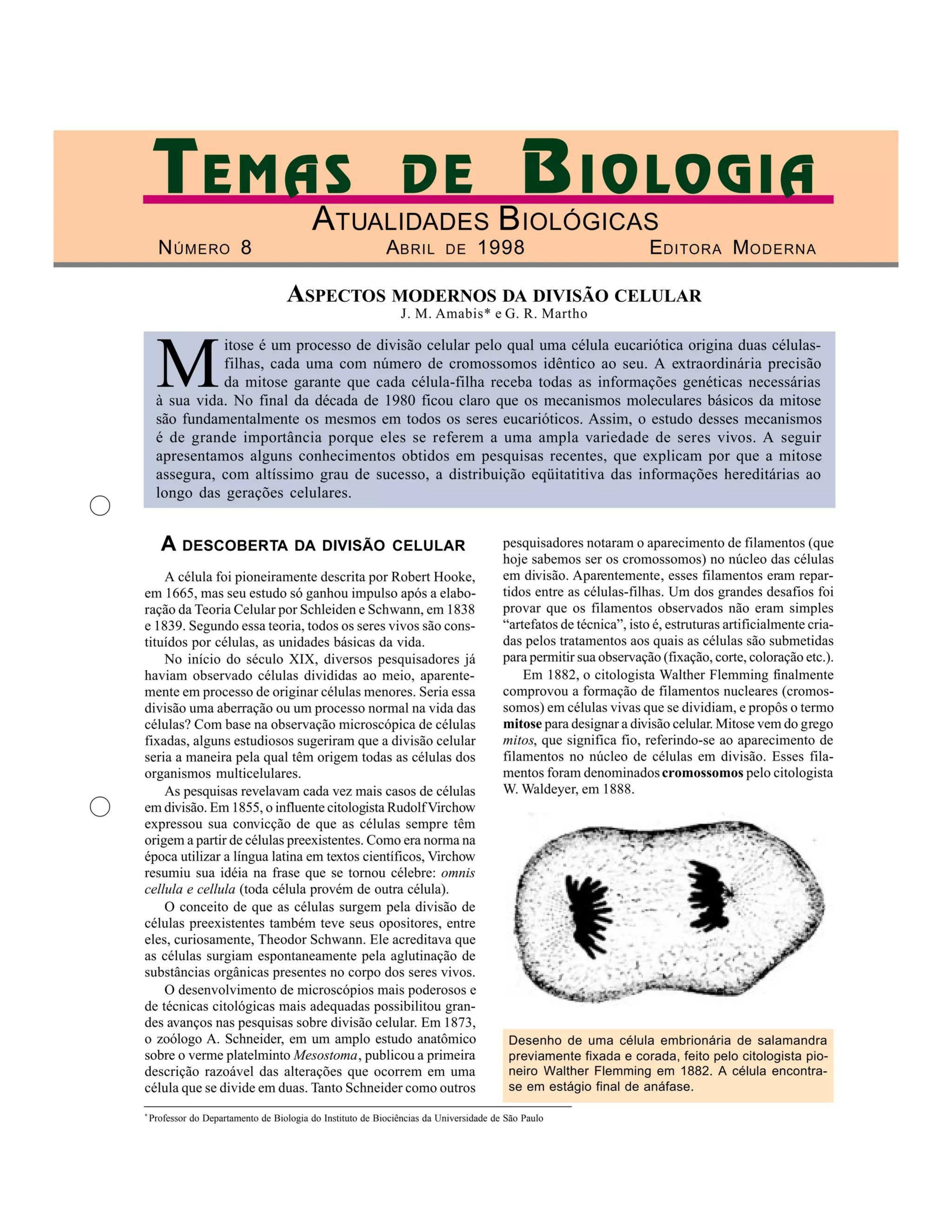 TEMAS DE BIOLOGIA ATUALIDADES BIOLÓGICAS NÚMERO 8 ABRIL DE 1998 EDITORA MODERNA ASPECTOS MODERNOS DA DIVISÃO CELULAR J. M. Amabis* e G.R. Martho M itose é um processo de divisão celular pelo qual uma célula eucariótica origina duas células- filhas, cada uma com número de cromossomos idêntico ao seu. A extraordinária precisão da mitose garante que cada célula-filha receba todas as informações genéticas necessárias à sua vida. No final da década de 1980 ficou claro que os mecanismos moleculares básicos da mitose são fundamentalmente os mesmos em todos os seres eucarióticos. Assim, o estudo desses mecanismos é de grande importância porque eles se referem a uma ampla variedade de seres vivos. A seguir apresentamos alguns conhecimentos obtidos em pesquisas recentes, que explicam por que a mitose assegura, com altíssimo grau de sucesso, a distribuição das informações hereditárias ao longo das gerações celulares. A DESCOBERTA DA DIVISÃO CELULAR pesquisadores notaram o aparecimento de filamentos (que hoje sabemos ser os cromossomos) no núcleo das células A célula foi pioneiramente descrita por Robert Hooke, em divisão. Aparentemente, esses filamentos eram repar- em 1665, mas seu estudo só ganhou impulso após a elabo- tidos entre as células-filhas. Um dos grandes desafios foi ração da Teoria Celular por Schleiden e Schwann, em 1838 provar que os filamentos observados não eram simples e 1839. Segundo essa teoria, todos os seres vivos são cons- "artefatos de técnica", isto é, estruturas artificialmente cria- tituídos por células, as unidades básicas da vida. das pelos tratamentos aos quais as células são submetidas No início do século XIX, diversos pesquisadores já para permitir sua observação (fixação, corte, coloração etc.). haviam observado células divididas ao meio, aparente- Em 1882, o citologista Walther Flemming finalmente mente em processo de originar células menores. Seria essa comprovou a formação de filamentos nucleares (cromos- divisão uma aberração ou um processo normal na vida das somos) em células vivas que se dividiam, e propôs o termo células? Com base na observação microscópica de células mitose para designar a divisão celular. Mitose vem do grego fixadas, alguns estudiosos sugeriram que a divisão celular mitos, que significa fio, referindo-se ao aparecimento de seria a maneira pela qual têm origem todas as células dos filamentos no núcleo de células em divisão. Esses fila- organismos multicelulares. mentos foram denominados cromossomos pelo citologista As pesquisas revelavam cada vez mais casos de células W. Waldeyer, em 1888. em divisão. Em 1855, o influente citologista expressou sua convicção de que as células sempre têm origem a partir de células preexistentes. Como era norma na época utilizar a língua latina em textos científicos, Virchow resumiu sua idéia na frase que se tornou célebre: omnis cellula e cellula (toda célula provém de outra célula). conceito de que as células surgem pela divisão de células preexistentes também teve seus opositores, entre eles, curiosamente, Theodor Schwann. Ele acreditava que as células surgiam espontaneamente pela aglutinação de substâncias orgânicas presentes no corpo dos seres vivos. O desenvolvimento de microscópios mais poderosos e de técnicas citológicas mais adequadas possibilitou gran- des avanços nas pesquisas sobre divisão celular. Em 1873, o zoólogo A. Schneider, em um amplo estudo anatômico Desenho de uma célula embrionária de salamandra sobre o verme platelminto Mesostoma, publicou a primeira previamente fixada e corada, feito pelo citologista pio- descrição razoável das alterações que ocorrem em uma neiro Walther Flemming em 1882. A célula encontra- célula que se divide em duas. Tanto Schneider como outros se em estágio final de anáfase. Professor do Departamento de Biologia do Instituto de Biociências da Universidade de São PauloFibras do fuso em formação Centro celular As FASES DA MITOSE Apesar de a mitose ser um processo contínuo, é possível dividi-la em fases, o que facilita seu estudo. As fases da mitose são: prófase, metáfase, anáfase e telófase. Alguns autores sugerem uma fase intermediária entre a prófase e a metáfase, a prometáfase. PRÓFASE Prófase Carioteca Durante a prófase, os finíssimos fios que compõem a cromatina - os cromossomos vão se condensando Nucléolo em desaparecimento no interior do núcleo, tornando-se mais visíveis e indivi- Cromossomos dualizados. Nessa fase, cada cromossomo é constituído duplicados em por dois fios idênticos (cromátides) unidos por uma região condensação Fragmentos da chamada centrômero. carioteca Cromátides- A progressiva condensação cromossômica acarreta irmãs Fuso acromático diminuição na produção das substâncias que compõem os nucléolos, os quais vão gradualmente desaparecendo. Ao final da prófase, a carioteca (membrana nuclear) METÁFASE desintegra-se. Os cromossomos, já bastante condensados, espalham-se na região central do citoplasma. No decorrer da prófase, os centros celulares vão se afastando, dando origem a um complexo conjunto de fibras denominado fuso acromático. Fibras cromossômicas Metáfase Na metáfase, cada cromossomo liga-se a fibras do fuso provenientes de pólos opostos (fibras cromossômicas). Essa Cromossomos condensados ligação ocorre na região do centrômero cromossômico. A alinhados no equador (placa metafásica) tensão nas fibras de pólos opostos faz com que os cromos- somos permaneçam temporariamente estacionados na re- gião equatorial da célula, formando a placa metafásica. Anáfase ANÁFASE Na anáfase, os centrômeros se dividem e as cromátides- irmãs se separam. encurtamento gradual das fibras cro- mossômicas arrasta as em sentidos opostos, até os pólos do fuso acromático. Encurtamento das fibras cromossômicas Telófase Na telófase, os cromossomos, já em pólos op