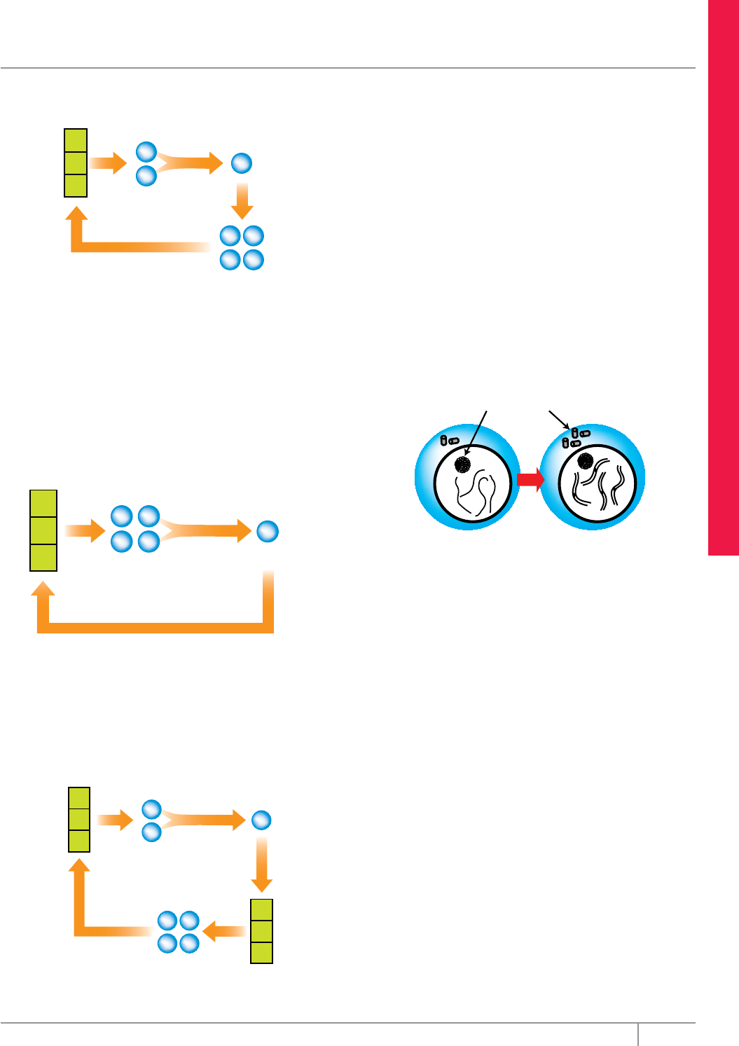 Mitose e meiose 5Editora Bernoulli B iO LO g iA Ciclos reprodutivos n n n n n n 2n n n n Mitose Meiose Esporos (n) Fecundação Mitoses sucessivas Indivíduo haploide (n) Gametas (n) Zigoto (2n) CICLO HAPLÔNTICO Ciclo haplôntico (haplonte) – Nesse ciclo, os indivíduos têm o corpo formado apenas por células haploides (n). Determinadas células n desses indivíduos, ao realizarem mitose, originam células também n, que são os gametas. A fusão (união) de dois gametas n, sendo de um mesmo indivíduo (autofecundação) ou de indivíduos diferentes (fecundação cruzada), origina o zigoto diploide (2n). O zigoto, encontrando condições favoráveis de desenvolvimento, realiza meiose (meiose zigótica), resultando em células n, chamadas de esporos. Cada esporo n, encontrando no meio condições favoráveis de desenvolvimento por mitoses sucessivas, formará um novo indivíduo haploide (n). Nas espécies que têm esse ciclo reprodutivo, os indivíduos são chamados de seres haplontes ou haplobiontes. Esse ciclo é encontrado, por exemplo, em algumas espécies de clorófitas (algas verdes). 2n 2n 2n Meiose Fecundação Mitoses sucessivas Gametas (n) Zigoto (2n) CICLO DIPLÔNTICO n n n n 2n Ciclo diplôntico (diplonte) – Nesse ciclo, os indivíduos têm o corpo formado por células diploides (2n). Determinadas células desses indivíduos, ao realizarem meiose, formam células haploides (n), que são os gametas. Por isso, diz-se que, nesse ciclo, a meiose é gamética. A união de dois gametas n origina o zigoto (2n). Esse zigoto, por mitoses sucessivas, origina um novo indivíduo diploide (2n). Os seres que apresentam esse ciclo reprodutivo são chamados de seres diplontes ou diplobiontes. A maioria dos animais (inclusive a espécie humana) e algumas espécies de algas verdes têm esse ciclo reprodutivo. n n n n n n n 2n 2n 2n Mitose Mitoses Meiose Esporos (n) Fecundação Mitoses sucessivas Indivíduo haploide (n) Gametas (n) Zigoto (2n) CICLO HAPLÔNTICO-DIPLÔNTICO n n 2n Ciclo haplôntico-diplôntico (haplonte-diplonte) – Nesse ciclo, existem indivíduos haploides (n) e indivíduos diploides (2n). Os indivíduos haploides, através de mitose, formam células também haploides (n), que são os gametas. A união de dois gametas n origina o zigoto 2n que, por mitoses sucessivas, forma um indivíduo diploide (2n). Os indivíduos diploides (2n), por meiose, formam células haploides (n), que são os esporos. Costuma-se dizer que nesse ciclo a meiose é espórica. Cada esporo, por mitoses sucessivas, forma um novo indivíduo haploide (n). Os seres que apresentam esse ciclo reprodutivo são chamados de haplodiplobiontes. Esse ciclo aparece em muitas espécies de algas, nas briófitas, nas pteridófitas, nas gimnospermas e nas angiospermas. É, portanto, um ciclo reprodutivo típico de plantas. Nas plantas, o indivíduo haploide (n), formador de gametas, é chamado de gametófito, enquanto o indivíduo diploide (2n), formador de esporos, é dito esporófito. MiTOSE Usaremos, como exemplo para descrever as diversas fases de uma mitose, uma célula eucariota diploide (2n), pertencente a uma espécie na qual o número 2n = 4. Nucléolo Diplossomo S G1 G2 Prófase É a primeira fase da mitose. Nela, observamos as seguintes características: • Início da espiralização (condensação) dos cromossomos – Os cromossomos já duplicados (lembre-se de que a duplicação ocorre na intérfase) começam a se espiralizar (condensar) e, à medida que vão se espiralizando, tornam-se mais curtos, porém mais grossos e, portanto, mais visíveis. O início da prófase é marcado pelo início da condensação dos cromossomos. • Desaparecimento do(s) nucléolo(s) – As moléculas de RNA-r que formam o nucléolo começam a se espalhar pela célula e se associam a moléculas de proteínas, formando os ribossomos. Assim, à medida que a prófase progride, o(s) nucléolo(s), gradualmente, vai (vão) deixando de ser visto(s), até desaparecer(em) por completo ao final da prófase. • Início da formação do fuso – O fuso mitótico (fuso acromático, aparelho mitótico) é um conjunto de fibras proteicas, formadas por microtúbulos, resultantes da polimerização de proteínas citoplasmáticas denominadas tubulinas. Quando a célula possui diplossomo, na intérfase, dá-se a duplicação dessas organelas e, na prófase, as fibras do fuso organizam-se entre os pares de centríolos. Assim, à medida que as fibras do fuso vão se alongando, os diplossomos são empurrados para os polos celulares. Ao redor de cada par de diplossomos, surgem também fibras de proteínas que, dispostas radialmente, formam o áster. 6 Coleção Estudo Frente A Módulo 11 Devido à presença dos diplossomos e, consequentemente, do áster, fala-se que nessas células a mitose é cêntrica e astral. Quando as células não possuem diplossomo, como nos vegetais superiores, o fuso forma-se com a mesma eficiência. Quando não têm diplossomo, também não terão áster e, nesse caso, fala-se que a mitose é acêntrica e anastral. • Desaparecimento da carioteca – Ao final da prófase, a membrana nuclear (carioteca) fragmenta-se em diversos pedaços e, com isso, o material citoplasmático mistura-se com o material nuclear. Conforme vimos, o sistema de fibras que constitui o fuso mitótico, cuja função é separar os cromossomos e encaminhá-los para os polos celulares, começa a se formar na prófase. Uma vez que o fuso se forma no citoplasma, é necessário que a carioteca desapareça para permitir que os cromossomos entrem em contato com as fibras do fuso. Essa fragmentação da carioteca marca o fim da prófase e o início da metáfase. Para alguns autores, essa fragmentação caracteriza uma outra fase da divisão celular que eles denominam de prometáfase. Desaparecimento do nucléolo Diplossomo Fibras do fuso Áster Início da espiralização dos cromossomos Fragmentação da carioteca Metáfase O termo metáfase (do gre