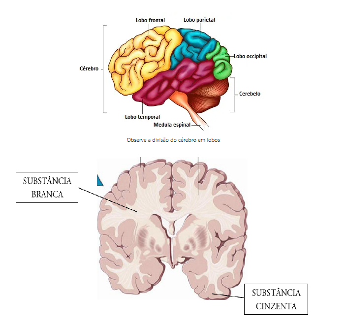 Lobo frontal Lobo parietal Lobo occipital Cérebro Cerebelo Lobo temporal Medula espinal Observe a divisão do cérebro em lobos SUBSTÂNCIA BRANCA SUBSTÂNCIA CINZENTA