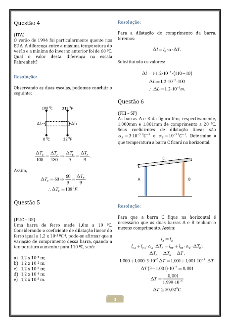 Questão 4 Resolução: (ITA) Para a dilatação do comprimento da 0 verão de 1994 foi particularmente quente nos teremos: EUA A diferença entre a temperatura do verão e a do inverno anterior foi de 60 °C Qual o valor desta diferença na escala Fahrenheit? Substituindo os valores: Resolução: Observando as duas podemos : AL seguinte: Questão 6 212 As barras A e B da figura 1,000mm e 1,001mm de comprimento a 20 °C Seus coeficientes de dilatação linear são e as Determine a 32°F que temperatura a barra ficará na horizontal AT, AT, AT, AT. 100 180 5 9 C Assim, 9 A B : Questão 5 Resolução: (PUC-RS) Para que a barra C fique na horizontal é Uma barra de ferro mede 1.0m a 10 °C necessário que as duas barras A e B tenham Considerando coeficiente de dilatação linear do mesmo comprimento. ferro igual a 1.2 pode-se afirmar que a variação de comprimento dessa barra, quando a temperatura aumentar para = = AT, = AT a) b) c) d) e) 1,999.10 2
