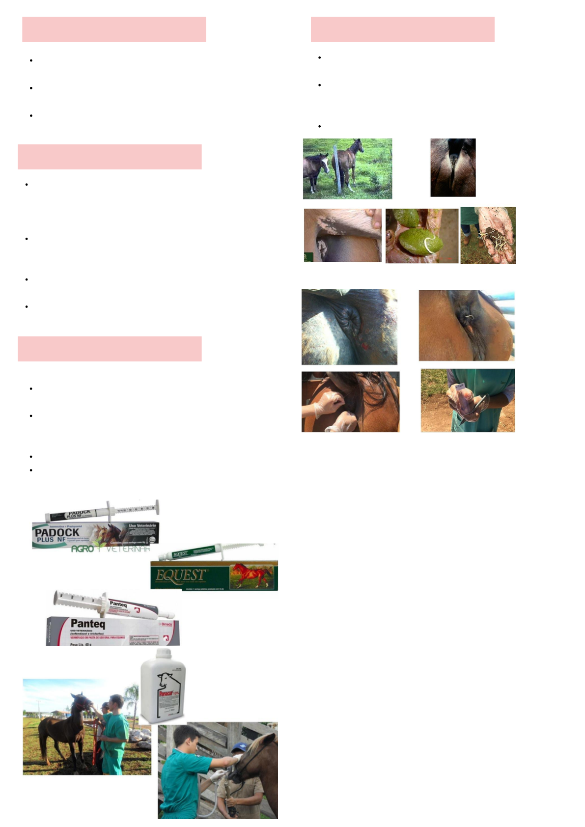 Epidemiologia PATOGENIA Diagnóstico TRATAMENTO E CONTROLE Grupos de ovos são espalhados quando o animal se coça; Imunidade não é o suficiente para evitar reinfecção; Ocorre em animais de estábulos e campo; L4 se alimenta da mucosa formando pequenas úlceras, ceco, cólon e processos inflamatórios; Inflamação perianal causada por fêmeas adultas durantes a ovoposição; Mordidas e arranhões formam feridas e infecções; Equino estressado se alimenta inadequadamente; Ovos raramente encontrados em exames de fezes; Exame de imprinting com fita adesiva no ânus onde os ovos ficarão aderidos a fita; Análise no microscópico; Limpeza e higiene do períneo caudal; Uso de anti-helmínticos de amplo-espectro (invermectina+ praziquantel); Limpeza das instalações; Impedir contaminação de água e alimentos; Principais Características Características- Ovo Ciclo Biológico Infecção Sinais Clínicos Filo Nematoda Ordem Oxyurida Superfamília Oxyruroidea Espécie: Oxyuris equi Fêmeas são maiores que os machos São brancas acinzentadas. Possuem ovos por todo o corpo. Cauda longa e fina Machos com espículo, asa caudal. Dois pares de papilas grandes, várias pequenas Apresentam um opérculo. Um dos lados lingeiramente. côncavo São oval. Cor Amarelada OBS: período pré-patente é o tempo desde a penetração do estágio infectante do parasita no hospedeiro até o aparecimento de ovos, larvas e oocisto Ciclo direto; Ingestão ovo com L3 (1); A larva L3 é liberada no intestino delgado (2); A L3 passa a L4 e L5 no intestino grosso e se alimenta da mucosa intestinal (3); A fêmea migra até o ânus, e deposita os ovos com uma substância acinzentada (4); Os ovos no ambiente embrionam e 3 a 5 dias até o estágio infectante (5); Périodo pré-patente 4 a 5 meses; Ingerir ovos contende a L3, em pastagens e água contaminada; Ingestão na palha da cama; Mordedura na região anal; Prurido, coceira intensa o animal fica se coçando em cercas e árvores; Alopecia ( queda de pelo), no períneo e cauda; Essa alopecia é chamada de CAUDA DE RATO CARACTERISTÍCAS MORFOLÓGICAS CICLO BIOLÓGICO Enterobius sp Enterobius vermiculares: humanos e macacos. E.anthropopitheci: macaco. Esôfago com bulbo posterior; Ovos com um dos lados mais planos Fêmeas pequenas e anfidelfas; Machos com somente um espículo e extremidade posterior curva; A fêmea grávida migra até o ânus do Hosp, deposita ovos embrionados no perianal; 6h após postura os ovos ficam infectantes; Hosp é parasitado quando ingere ovos com a L3; Larvas eclodem no duodeno e passam a L4 E L5; Jovens adultos migram p/ o intestino grosso (cólon) e se fixa na mucosa; Machos e fêmeas copulam, fêmeas ficam grávidas migram até o ânus e recomeçam o ciclo (postura) Postura é feita a noite; Roupas intimas ficam contaminadas com pequenos ovos As larvas eclodem na mucosa anal, e a L3 infectante retorna para o intestino grosso (reinfecção); CARACTERISTÍCAS GERAIS CARACTERISTICAS MORFOLÓGICAS Habronema majus CICLO BIOLÓGICO Habronema spp. Draschia sp. Reino: Animalia Filo: Nematoda Ordem: Spirurida Superfamilia: Spiruroidea Cauda do macho enrolada em forma de espiral; Ciclos evolutivos indiretos, ou seja envolvem artrópodes como hospedeiros intermediários; Familia:Habronematidae Gênero: Habronema Espécies: Habronema muscae (musca domestica); Habronema majus (Stomoxys calcitrans); Draschia megastoma ( Musca domestica); Habronema muscae Helminto pequeno e branco; É um verme de estômago Cápsula bucal cilíndrica; Macho com cauda espiralada, asa caudal e papilas pedunculadas; Semelhante ao H.muscae; A cápsula bucal apresenta um dente dorsal e outros ventral (afunilamento); Machos com cauda espiralada; asa caudal; papilas pedunculadas; Espículos desiguais um maior que o outro; Draschia megastoma Menor que as outras espécies; Somente ela é localizada no estômago ( parasitam nódulos) Verme branco, fêmea maior; Lábios com cápsula bucal em forma de funil; machos com cauda espiralada, um espículos maior que o outro Ovos larvados de carca fina É um verme de estômago que o animal defeca e a mosca ao ter contato com as fezes se contagia com a larva e infecta o animal em suas lesões; Larvas ou ovos larvados eliminados juntos com as fezes; São ingeridos por larvas de moscas que se desenvolvem nas fezes; O estágio infectante L3 é alcançado quando a L3 da mosca chega em pupa; Quando as moscas vão se alimentar nos lábios, orifícios nasais e lesões a L3 nematoide é liberada; Moscas são ingeridas acidentalmente na água ou alimento, e a L3 que está no seu interior é liberada no tubo digestivo do equino; CICLO BIOLÓGICO E PATOGENIA H.muscae e H. majus: não fazem migração Todas ocorrem na luz do estômago; As L3 chegam ao estômago, passam L4 L5 (adultos); Inicia a postura dos ovos ( saem com as fezes); Somente as L3 de D. megastoma penetram na mucosa da parede estomacal; Mudam para L4 e L5 e ficam adultos Produz nódulos grandes; Etiologia PATOGENIA SINAIS CLINICOS DIAGNÓSTICO TRATAMENTO Ingestão das larvas depositadas nos lábios do equinos; Ingestão da L3 na água e pastagem (mosca); Larvas em feridas expostas; evoluem apenas larvas que chegam ao estômago; Larvas em feridas, mucosas nasal ou ocular (ERRÁTICA) Quando o ciclo ocorre normalmente a Draschia sp é + patogênica; Penetram a mucosa estomacal causando tumores; As larvas livres no estômago causa gastrite catarral crônica, irritação. LARVAS ERRÁTICAS (imagem 1): Raramente ocorre habronemose pulmonar ocular; Habronemose cutânea, "feridas de verão" (COMUM); Lesões oculares: Conjuntivite granulosa, podder ocorrer no homem; Lesões pulmonares: nódulos cinza- amarelados; Lesões cutâneas: lesão esponjosa geralmente no membro, larvas calcificadas formam nódulos, larvas se alimentam, migram aumentando a lesão e impedindo a cura; As "feridas de verão", + comuns em àreas sujeitas a traumatismo; Ocorre mais no verão + moscas; No inicio das larvas apre