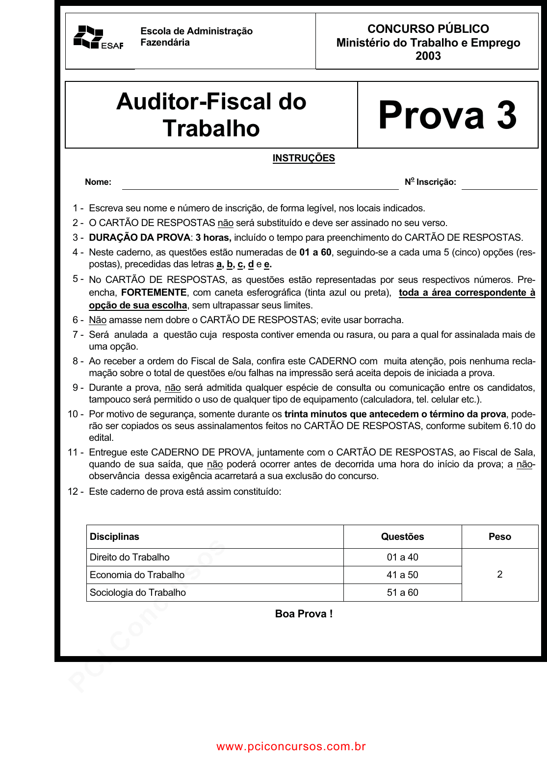 pcimarkpci MDAwMDowMDAwOjAwMDA6MDAwMDowMDAwOmZmZmY6YjViZjozZTlj:TW9uLCAyNyBKYW4gMjAyNSAyMDoyOTo0NSAtMDMwMA== www.pciconcursos.com.br Escola de Administração Fazendária CONCURSO PÚBLICO Ministério do Trabalho e Emprego 2003 Auditor-Fiscal do Trabalho Prova 3 INSTRUÇÕES Nome: No Inscrição: 1 - Escreva seu nome e número de inscrição, de forma legível, nos locais indicados. 2 - O CARTÃO DE RESPOSTAS não será substituído e deve ser assinado no seu verso. 3 - DURAÇÃO DA PROVA: 3 horas, incluído o tempo para preenchimento do CARTÃO DE RESPOSTAS. 4 - Neste caderno, as questões estão numeradas de 01 a 60, seguindo-se a cada uma 5 (cinco) opções (res- postas), precedidas das letras a, b, c, d e e. 5 - No CARTÃO DE RESPOSTAS, as questões estão representadas por seus respectivos números. Pre- encha, FORTEMENTE, com caneta esferográfica (tinta azul ou preta), toda a área correspondente à opção de sua escolha, sem ultrapassar seus limites. 6 - Não amasse nem dobre o CARTÃO DE RESPOSTAS; evite usar borracha. 7 - Será anulada a questão cuja resposta contiver emenda ou rasura, ou para a qual for assinalada mais de uma opção. 8 - Ao receber a ordem do Fiscal de Sala, confira este CADERNO com muita atenção, pois nenhuma recla- mação sobre o total de questões e/ou falhas na impressão será aceita depois de iniciada a prova. 9 - Durante a prova, não será admitida qualquer espécie de consulta ou comunicação entre os candidatos, tampouco será permitido o uso de qualquer tipo de equipamento (calculadora, tel. celular etc.). 10 - Por motivo de segurança, somente durante os trinta minutos que antecedem o término da prova, pode- rão ser copiados os seus assinalamentos feitos no CARTÃO DE RESPOSTAS, conforme subitem 6.10 do edital. 11 - Entregue este CADERNO DE PROVA, juntamente com o CARTÃO DE RESPOSTAS, ao Fiscal de Sala, quando de sua saída, que não poderá ocorrer antes de decorrida uma hora do início da prova; a não- observância dessa exigência acarretará a sua exclusão do concurso. 12 - Este caderno de prova está assim constituído: Disciplinas Questões Peso Direito do Trabalho 01 a 40 Economia do Trabalho 41 a 50 Sociologia do Trabalho 51 a 60 2 Boa Prova ! www.pciconcursos.com.br pcimarkpci MDAwMDowMDAwOjAwMDA6MDAwMDowMDAwOmZmZmY6YjViZjozZTlj:TW9uLCAyNyBKYW4gMjAyNSAyMDoyOTo0NSAtMDMwMA== www.pciconcursos.com.br Auditor-Fiscal do Trabalho - MTE - 2003 Prova 3 2 DIREITO DO TRABALHO 01- A relação de emprego é compreendida: a) como o negócio jurídico bilateral, firmado entre determinada empresa de prestação de serviços terceirizados e os respectivos toma- dores de serviços. b) como o negócio jurídico bilateral, celebrado entre duas pessoas naturais ou jurídicas, pelo qual um deles se obriga a prestar serviços habituais em favor do outro, de acordo com as ordens que lhe forem dirigidas, mediante pagamentos periódicos. c) como o negócio jurídico bilateral, celebrado entre uma pessoa física e uma pessoa natural ou jurídica, pelo qual obriga-se o primeiro a prestar serviços habituais em favor do segun- do, segundo as ordens que lhe forem repas- sadas, mediante pagamentos periódicos. d) como o negócio jurídico bilateral, firmado para a execução de obra certa, por pessoa física, mediante o pagamento de quantia fixa previ- amente ajustada. e) como o negócio jurídico bilateral, destinado à execução – por pessoa natural ou jurídica, de forma habitual e onerosa – de atividades inerentes aos fins normais do negócio explo- rado pelo contratante. 02- Não é considerado empregado(a): a) O trabalhador que presta serviços habituais, onerosos e subordinados a determinada insti- tuição de beneficência, mantida com contribu- ições e doações de terceiros. b) A costureira que presta serviços em seu do- micílio a determinada empresa de confecção, comparecendo uma vez por semana à sede da empresa, tendo seu trabalho controlado em razão das cotas de produção estabeleci- das e da qualidade das peças produzidas. c) O trabalhador que presta serviços como mor- domo em determinada residência familiar, de forma pessoal, contínua e onerosa. d) O trabalhador contratado por empresa espe- cializada em fornecer mão-de-obra temporá- ria a outras empresas, em razão de necessi- dades transitórias de substituição de pessoal regular ou para atender a acréscimo extraor- dinário de tarefas. e) A pessoa física que exerce por conta própria, de modo pessoal e habitual, atividade urbana em favor de determinada empresa. 03- Considera-se empregador: a) A empresa individual ou coletiva que admite trabalhadores como empregados, dirigindo suas atividades e com eles dividindo os riscos do empreendimento. b) As associações recreativas que, mesmo não objetivando lucro, contratam trabalhadores avulsos. c) Os profissionais liberais que atuam em suas próprias residências, contando com o auxílio de secretárias. d) Solidário a empresa que, embora não contra- tando trabalhadores como empregados, inte- gra o mesmo grupo econômico de outra, que conta com o auxílio de empregados. e) O tomador de serviços eventuais prestados em atividades necessárias aos melhores resultados de seu empreendimento. 04- A propósito da jornada de trabalho, assinale a opção correta. a) Os titulares da relação de emprego podem pactuar livremente a duração da jornada de trabalho, desde que observem parâmetros de razoabilidade e proporcionalidade. b) Os limites legais da jornada de trabalho po- dem ser alterados pelos contratantes, ainda que em prejuízo do trabalhador, mas, nesse caso, deverá ele estar assistido por seu sindi- cato profissional. c) As negociações coletivas podem estabelecer regras relativas à duração do horário de tra- balho, mas a aplicação dessas disposições aos contratos individuais de trabalho está condicionada à concordância expressa de trabalhadores e empregadores, sob pena de ineficácia da cláusula normativ