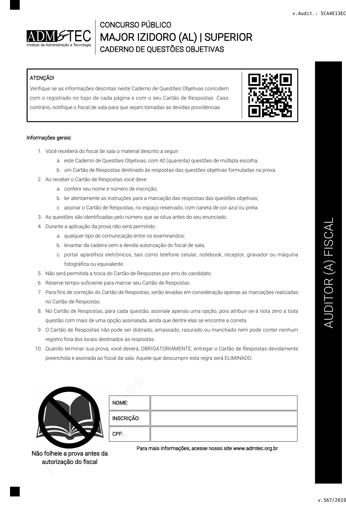 pcimarkpci MDAwMDowMDAwOjAwMDA6MDAwMDowMDAwOmZmZmY6YjViZjozZTlj:TW9uLCAyNyBKYW4gMjAyNSAyMDo0MzoyMyAtMDMwMA== www.pciconcursos.com.br v.Audit.: 5CA4E13EC v.567/2019 CONCURSO PÚBLICO MAJOR IZIDORO (AL) | SUPERIOR CADERNO DE QUESTÕES OBJETIVAS AU DI TO R (A ) F IS CA L ATENÇÃO! Verifique se as informações descritas neste Caderno de Questões Objetivas coincidem com o registrado no topo de cada página e com o seu Cartão de Respostas. Caso contrário, notifique o fiscal de sala para que sejam tomadas as devidas providências. Informações gerais: Você receberá do fiscal de sala o material descrito a seguir:1. este Caderno de Questões Objetivas, com 40 (quarenta) questões de múltipla escolha;a. um Cartão de Respostas destinado às respostas das questões objetivas formuladas na prova.b. Ao receber o Cartão de Respostas você deve:2. conferir seu nome e número de inscrição;a. ler atentamente as instruções para a marcação das respostas das questões objetivas;b. assinar o Cartão de Respostas, no espaço reservado, com caneta de cor azul ou preta.c. As questões são identificadas pelo número que se situa antes do seu enunciado.3. Durante a aplicação da prova não será permitido:4. qualquer tipo de comunicação entre os examinandos;a. levantar da cadeira sem a devida autorização do fiscal de sala;b. portar aparelhos eletrônicos, tais como telefone celular, notebook, receptor, gravador ou máquinac. fotográfica ou equivalente. Não será permitida a troca do Cartão de Respostas por erro do candidato.5. Reserve tempo suficiente para marcar seu Cartão de Respostas.6. Para fins de correção do Cartão de Respostas, serão levadas em consideração apenas as marcações realizadas7. no Cartão de Respostas. No Cartão de Respostas, para cada questão, assinale apenas uma opção, pois atribuir-se-á nota zero a toda8. questão com mais de uma opção assinalada, ainda que dentre elas se encontre a correta. O Cartão de Respostas não pode ser dobrado, amassado, rasurado ou manchado nem pode conter nenhum9. registro fora dos locais destinados às respostas. Quando terminar sua prova, você deverá, OBRIGATORIAMENTE, entregar o Cartão de Respostas devidamente10. preenchida e assinada ao fiscal da sala. Aquele que descumprir esta regra será ELIMINADO. Não folheie a prova antes da autorização do fiscal NOME: INSCRIÇÃO: CPF: Para mais informações, acesse nosso site www.admtec.org.br pcimarkpci MDAwMDowMDAwOjAwMDA6MDAwMDowMDAwOmZmZmY6YjViZjozZTlj:TW9uLCAyNyBKYW4gMjAyNSAyMDo0MzoyMyAtMDMwMA== www.pciconcursos.com.br Instituto ADM&TEC | MAJOR IZIDORO (AL) | SUPERIOR v.Audit.: 5CA4E13EC AUDITOR (A) FISCAL - Página 2 de 7 v.567/2019 CONHECIMENTOS GERAIS Questões de 1 a 15 QUESTÃO 1 • Leia as afirmativas a seguir: I. Na seguinte frase, não há um substantivo: a casa é verde. II. No trecho "Já fecharam a urna funerária", o vocábulo "urna" é classificado como pronome reflexivo. III. O termo "enxame" é um verbo. IV. A grafia do verbo seguinte está correta: correr. Marque a alternativa CORRETA: a) Nenhuma afirmativa está correta. b) Apenas uma afirmativa está correta. c) Apenas duas afirmativas estão corretas. d) Apenas três afirmativas estão corretas. e) Todas as afirmativas estão corretas. QUESTÃO 2 • Leia as afirmativas a seguir: I. Se uma aplicação financeira no valor de R$ 222.000 apresentou rendimentos totais da ordem de 3% no período do investimento, então é correto afirmar que ela acumulou um montante de R$ 228.660. II. Um quadrado com aresta medindo 5 cm terá um perímetro igual a 20 cm. III. Ugo realizou uma aplicação financeira no valor de R$ 120.000. Após 6 meses, ele observou que o seu investimento apresentou rendimentos totais no período da ordem de 2%. Assim, é correto afirmar que Ugo acumulou um montante de R$ 122.400. IV. Se 1L de leite custa R$ 5,6, então 42L desse mesmo produto custarão R$ 235,2. Marque a alternativa CORRETA: a) Nenhuma afirmativa está correta. b) Apenas uma afirmativa está correta. c) Apenas duas afirmativas estão corretas. d) Apenas três afirmativas estão corretas. e) Todas as afirmativas estão corretas. QUESTÃO 3 • Leia as afirmativas a seguir: I. A grafia do verbo seguinte está correta: começar. II. A grafia do verbo seguinte está correta: comer. III. A grafia do verbo seguinte está correta: pulàr. IV. A grafia do verbo seguinte está correta: rir. Marque a alternativa CORRETA: a) Nenhuma afirmativa está correta. b) Apenas uma afirmativa está correta. c) Apenas duas afirmativas estão corretas. d) Apenas três afirmativas estão corretas. e) Todas as afirmativas estão corretas. QUESTÃO 4 • Leia as afirmativas a seguir: I. No período "A mitologia narra que Narciso amava-se acima de tudo", o vocábulo "Narciso" é classificado como pronome possessivo. II. A grafia do verbo seguinte está correta: expor. III. A grafia do verbo seguinte está correta: corrigir. IV. A grafia do vocábulo seguinte está incorreta: área. Marque a alternativa CORRETA: a) Nenhuma afirmativa está correta. b) Apenas uma afirmativa está correta. c) Apenas duas afirmativas estão corretas. d) Apenas três afirmativas estão corretas. e) Todas as afirmativas estão corretas. QUESTÃO 5 • Leia as afirmativas a seguir: I. No trecho "Lá se vão os peregrinos", o vocábulo "vão" é classificado como artigo. II. Na frase "Está na hora de ir", o vocábulo "ir" é classificado como pronome de tratamento. III. A grafia do verbo seguinte está correta: dividir. IV. No trecho "Diga que fui por aí", o vocábulo "fui" é classificado como substantivo coletivo. Marque a alternativa CORRETA: a) Nenhuma afirmativa está correta. b) Apenas uma afirmativa está correta. c) Apenas duas afirmativas estão corretas. d) Apenas três afirmativas estão corretas. e) Todas as afirmativas estão corretas. QUESTÃO 6 • Leia as afirmativas a seguir: I. No trecho "A moto foi contra o carro", o vocábulo "carro" é classificad